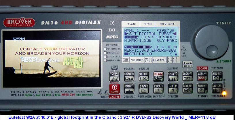 1.2.2010 - First measurements of the new network STN in the standart DVB-S2/8PSK from Eutelsat W2A satellite at 10.0°E in C band : 3 927 R STN network- spectral analysis & measurement results... _ FIRST : DVB-S2/8PSK/MPEG-4/FTA Discovery World