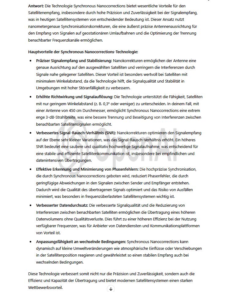 Jediným garantom dosiahnutej stability príjmu na frekvencii f = 11 304 MHz_H je — ako to následne dokazuje — technologický vynález s názvom Synchrónne nanokorekcie, ktorého autorom je vedec a vynálezca Roman Dávid z Lučenca. Tento originálny a doteraz v žiadnom inom centre na svete neaplikovaný vynález zabezpečuje pri replikácii a aktualizácii dát zo signálneho modelu do anténneho systému okamžité a skokové rasty kvality príjmu,ktoré okamžite zvyšujú signálnu rezervu v rozsahu od +0,5 do +2,5 dB.