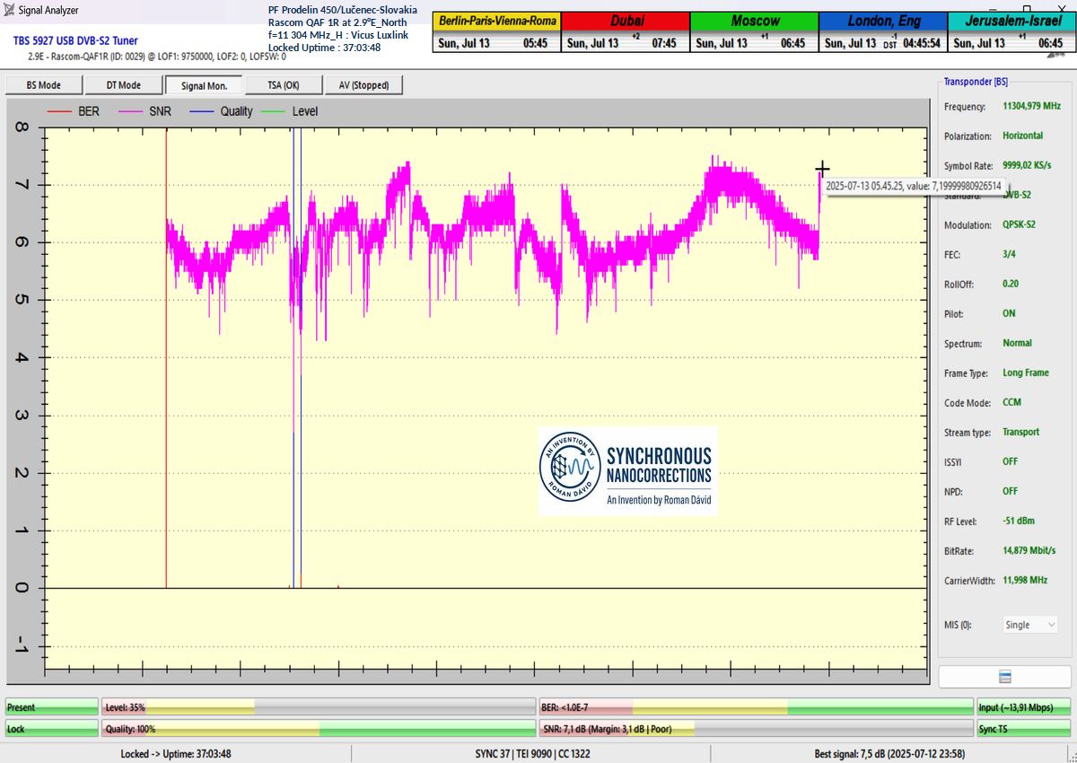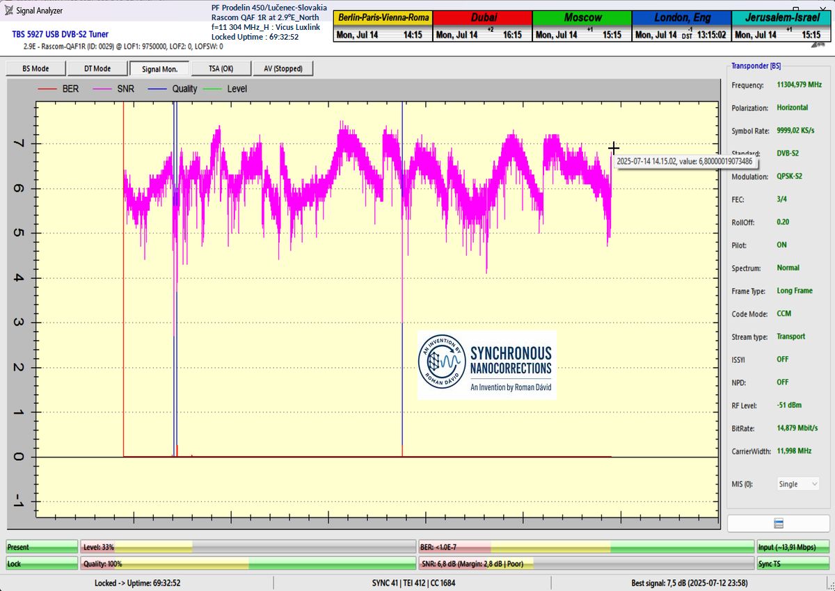 SK_Ako potvrdzuje vizualizovaná forma dokazovania v signálnom monitoringu s trvaním t = 79 hodín (čo predstavuje presne 284 400 sekúnd), výpadky v Locku alebo oscilácie kvality v okolí šumového prahu sa vyskytli v celkovom trvaní iba pätnásť sekúnd z celkových 284 400 sekúnd. To zodpovedá percentuálnej stabilite príjmu na úrovni presne 99,99 %.Jediným garantom dosiahnutej stability príjmu na frekvencii f = 11 304 MHz_H je — ako to následne dokazuj— technologický vynález s názvom Synchrónne nanokorekcie, ktorého autorom je vedec a vynálezca Roman Dávid z Lučenca. Tento vynález zabezpečuje náhle a skokové zlepšenia kvality príjmu, ktoré okamžite zvyšujú signálnu rezervu v rozsahu od +0,5 do +2,5 dB.