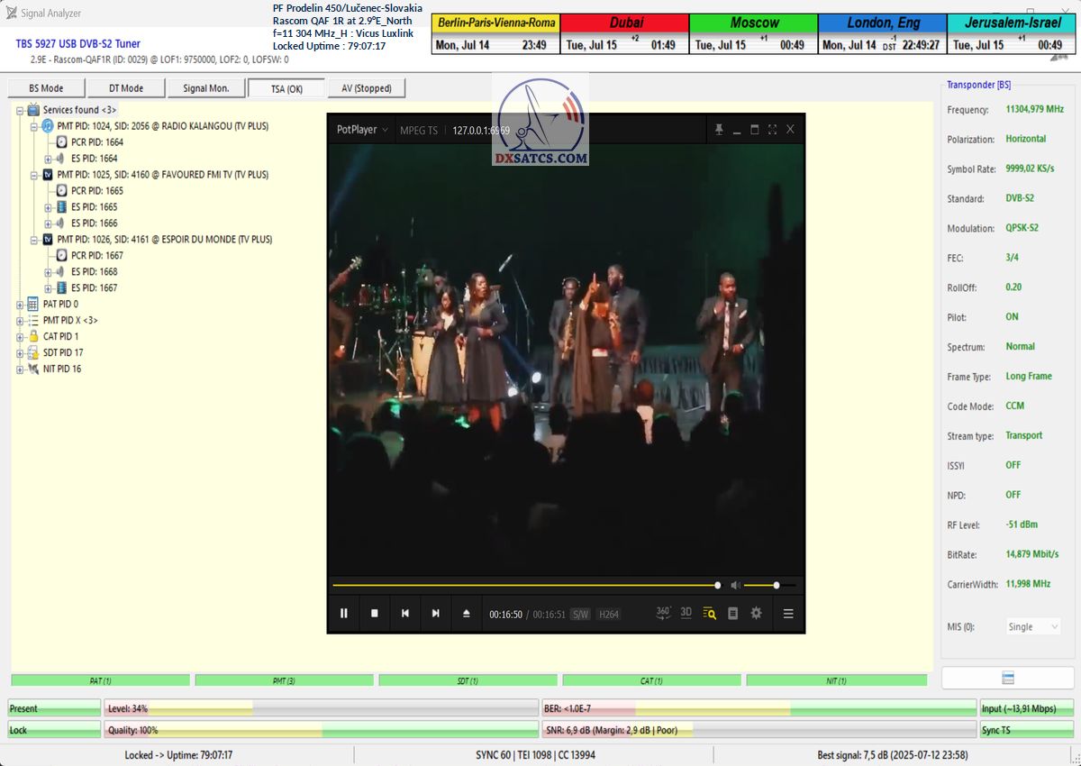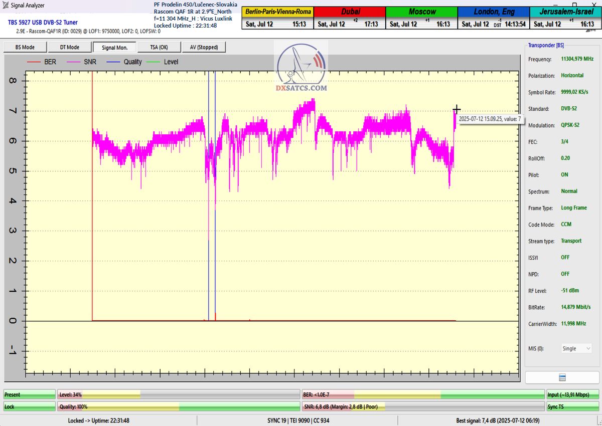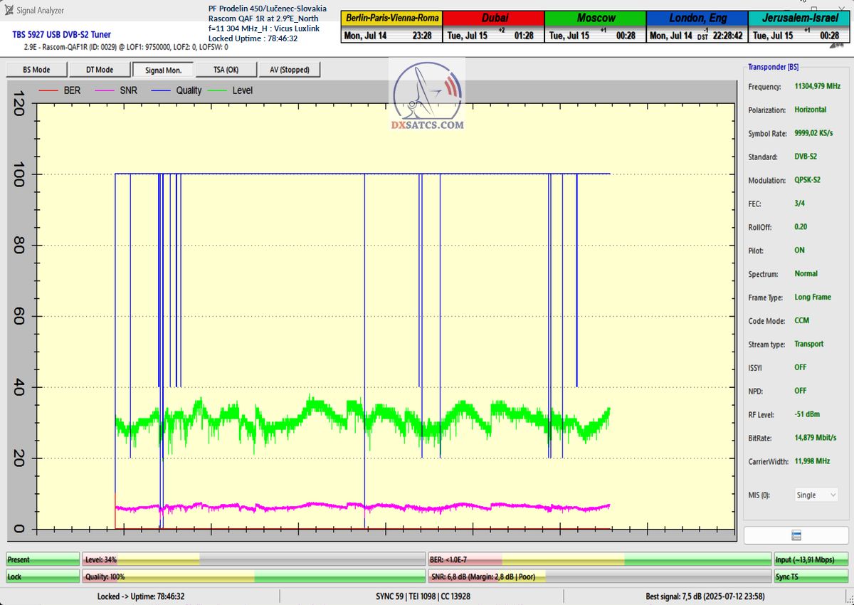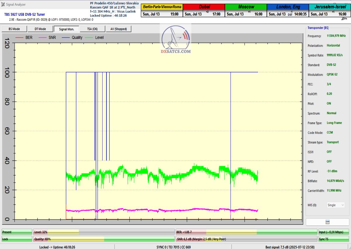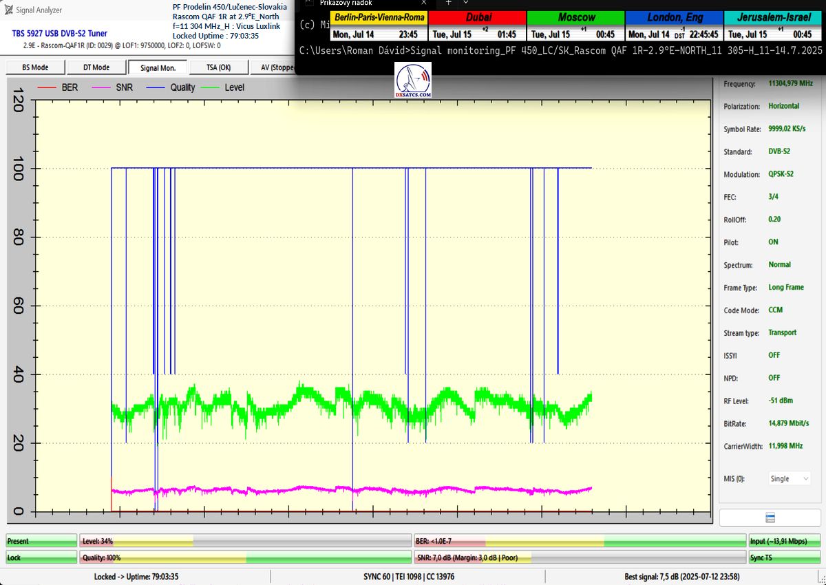 23-7-2025_Rascom QAF-1R at 2.9°E-North Africa-11 304-H: Verification of the technological invention “Synchronous Nanocorrections” by scientist and inventor Roman Dávid from Lučenec during satellite reception from the NORTH Africa beam in Central Europe...