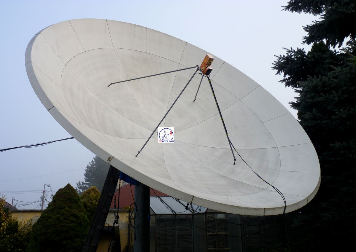 ►Reflektor PF Prodelin 450 cm > Primärstrahler (Feedhorn) in einem manuellen SKEW-Rotationsmechanismus platziert > OMT-orthomode transducer vom Typ ESA-1212-X/1 >SMW Q-PLL Typ R LNB mit LOF-Stabilität von +/- 25 kHz, SMW_Q-PLL Typ O LNB mit LOF-Stabilität von +/- 10 kHz, und SMW PLL LNB 9,75 GHz mit LOF-Stabilität von +/- 10 kHz +Selbstgemachte Kartonabdeckung aus einer alkoholfreien Getränkeverpackung der Schweizer Firma SIG-Combibloc,auf die ich eine wasserdichte,wetterfeste Folie aufgebracht habe.