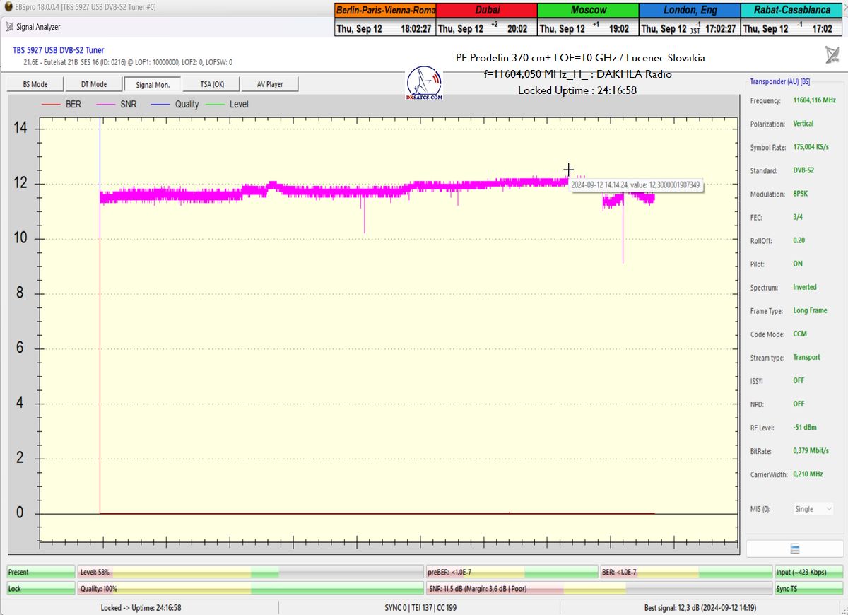 Thus, at the output of PF 370 cm + LOF = 9.75 GHz, I demonstrably achieved 100% reception stability in the unit with t = 24 hours, with a quality peak of SNR = 11.9 dB.