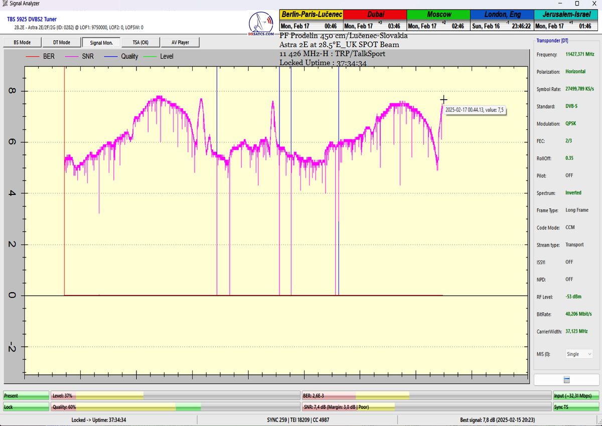 ►►Astra 2E at 28.5°E-UK Spot Beam: Continuous signal monitoring / Nepretržitý signálny monitoring