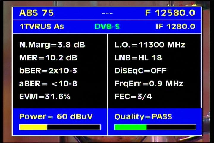ABS 1 at 75.0°E-southern beam : 12 580 H ABS network- qualitative peak MER=10.2 dB