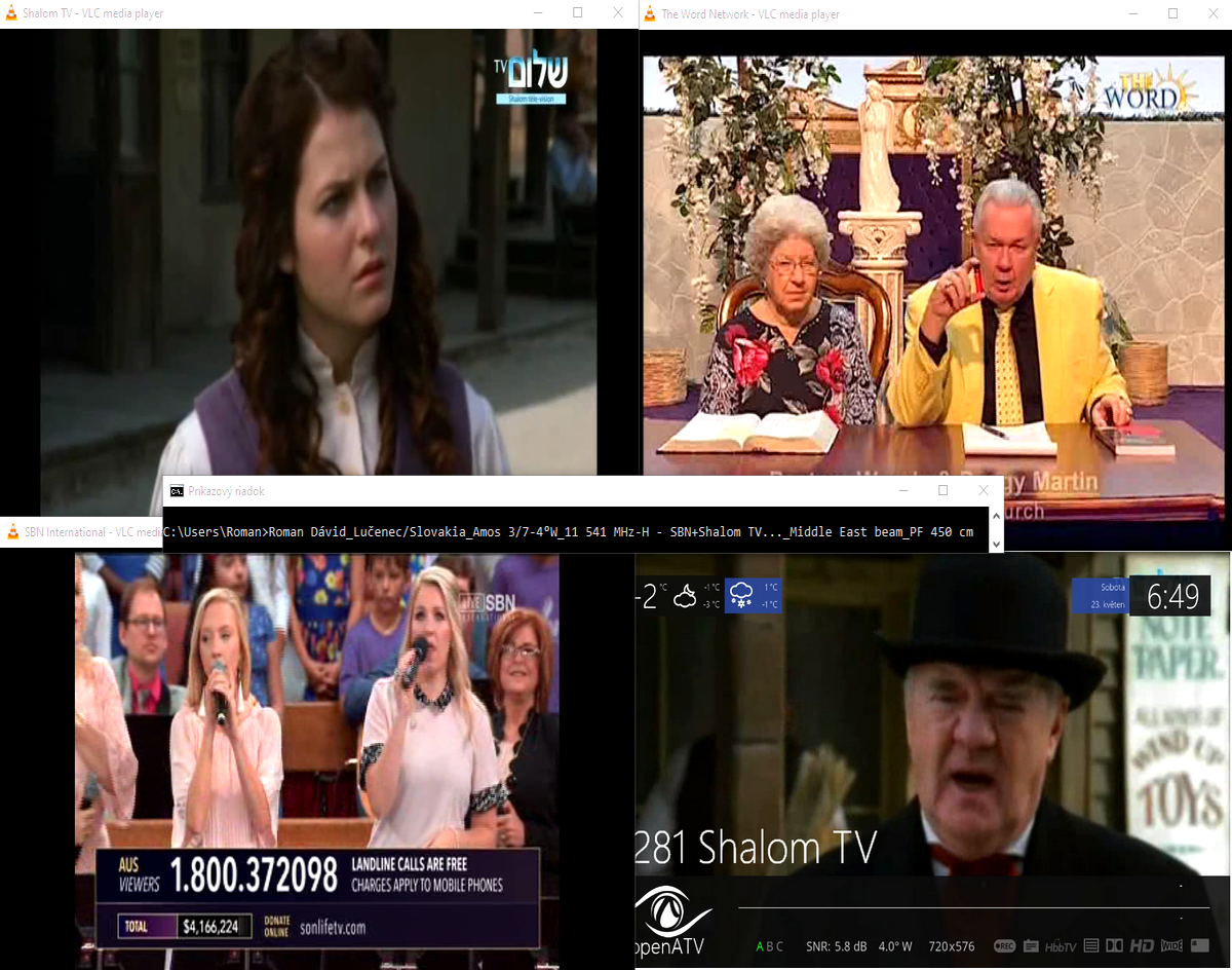 Multiplexné zobrazenie štyroch živých HD streamov a jedného verifikačného HD streamu s okamžitým stavom v signálnej kvalite odvodenej od hladiny "SNR". Konkrétne dňa 15.5.2020 signálna kvalita oscilovala v rozsahu amplitúdy MER=6-7,4 dB,čo umožňovalo stabilný príjem bez výpadkov a pixelácie v trvaní okolo 165 minút v časovom okne od 8:30 do približne 11:15 predpoludním aj napriek výrazne zhoršeným poveternostným podmienkam (dažďa),ktoré v tom čase panovali v mieste príjmu Lučenec/Slovenská republika.Signálny model pre konkrétne túto frekvenciu je aktívny takmer každý deň v rozsahu ranných a predpoludňajších hodín,v časovom okne od 8:00 do 11.30 a.m,čiže nejedná sa o akúkoľvek formu náhodného LOCK-u nosnej,ktorého necyklickosť,alebo náhodnosť vo výskyte,vylučuje jeho zaradenie do akejkoľvek modelovej signálnej formy,alebo situácie.