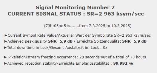 die die Mindesteinheit t=72 Stunden leicht überschritten haben. Ich werde mich im Detail mit der Änderung des Symbolratenwertes (SR) von ursprünglich 3333 auf aktuell 2963 ksym/sec befassen, da ich diese online während der ersten Überwachung am 5. März 2025 nach 9:00 Uhr morgens erfasst habe, worüber ich als