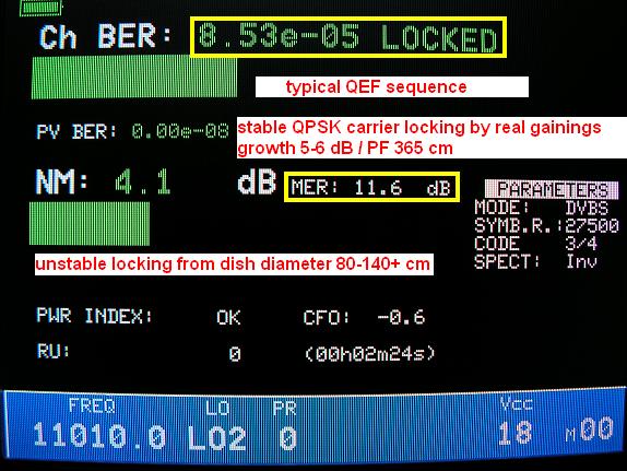 -výrazne oscilujúca akostná špička v pásme rozkmitu Q amplitúdy od 10,8 do 12 dB v časovom úseku len 5 sec síce výrazným spôsobom neguje identifikovaný akostný stav ovšem aj pri hladine zisku v signálnom RX reťazci okolo 4,8 dB t.j. MER=10,8 dB tento kvalitatívny stav z hľadiska nameranej okamžitej chybovosti patrí pri použitej QPSK modulácii do kvalitatívnej katégórie QEF , čiže takmer error free priebeh .