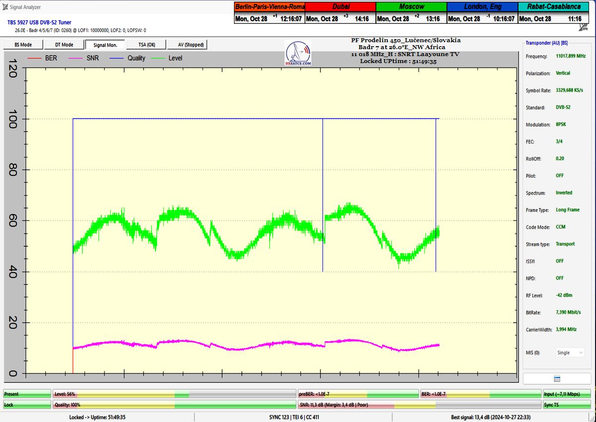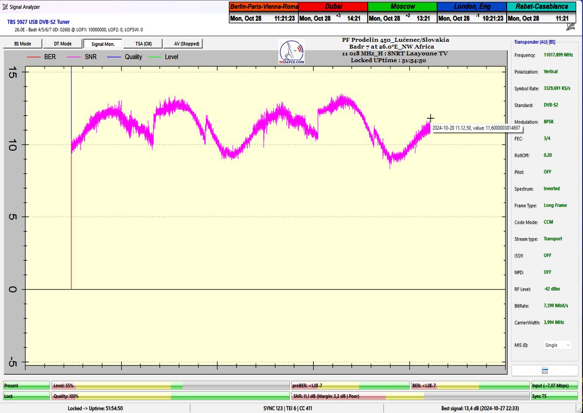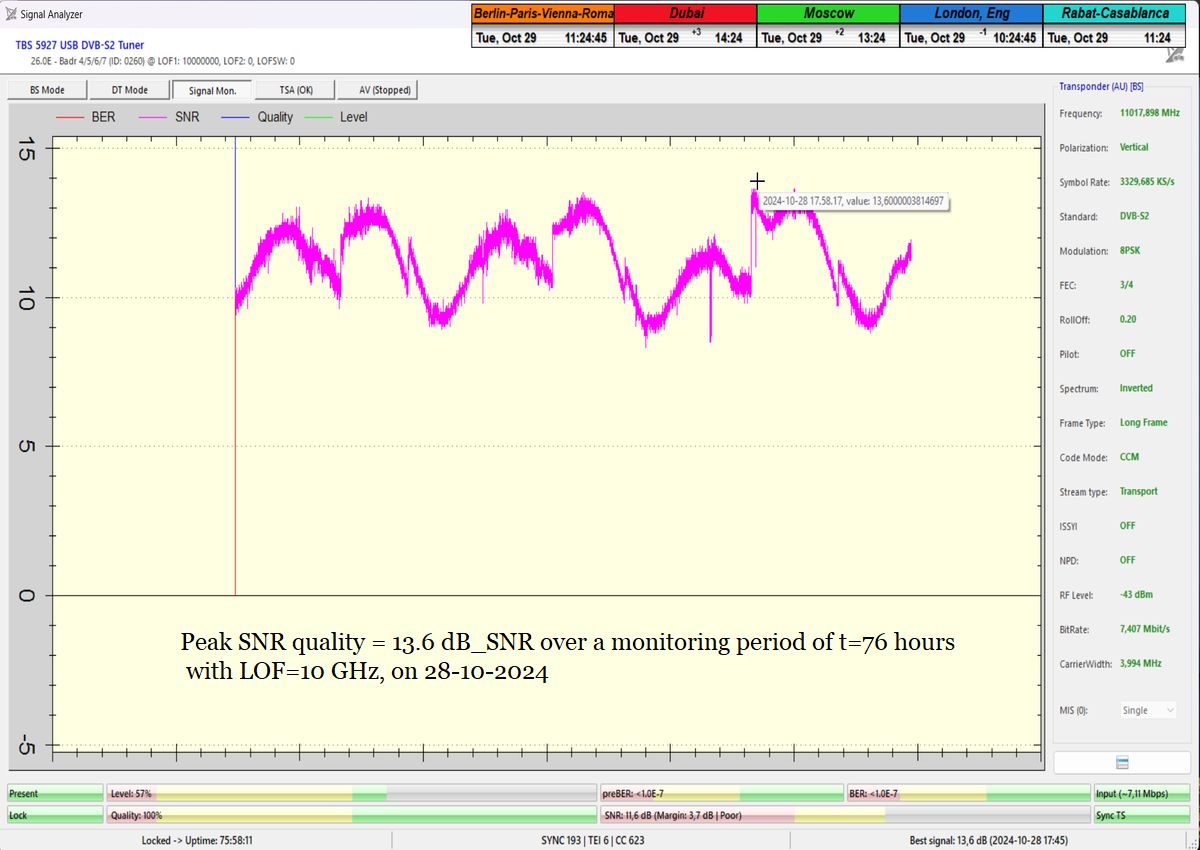 EN_Classification of achieved results at f=10,986 MHz: With the help of my original technological invention, named "Synchronous Nanocorrections," I indisputably achieved a stable carrier lock at 100% in a monitoring period of t=76 hours, without a single continuity dropout in its function. Depending on weather conditions and the SMW-brand LNB used, peak quality ranged from 13.6 dB (at t=76 hours and LOF=10 GHz) to 14.2 dB_SNR (at t=21 hours and LOF=9.75 GHz).