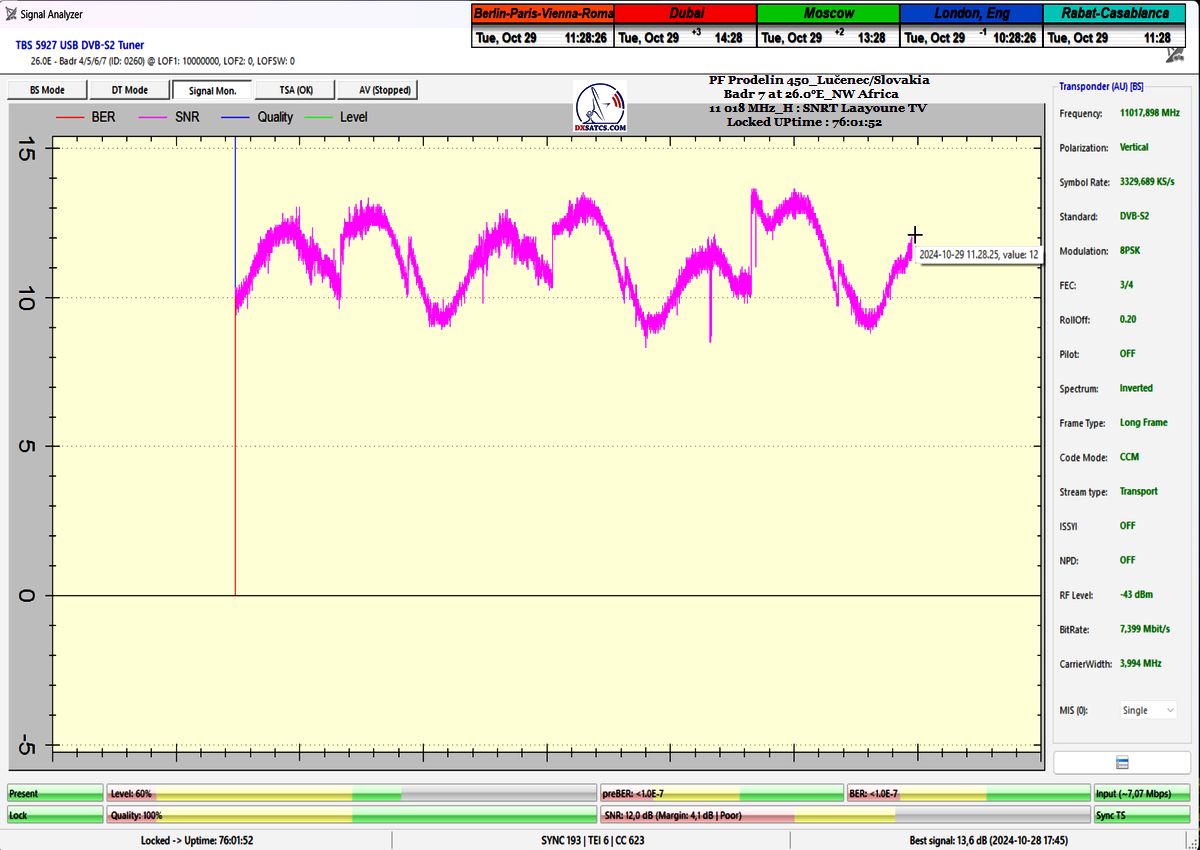 auch die Kontinuität/Stabilität des Lock des Trägers bei hohen und täglichen Leistungsänderungen in Mitteleuropa. Heute kann ich eine volle Empfangsstabilität und Kontinuität der Funktion des Lock des Trägers für eine Dauer von t=76 Stunden nachweisen.