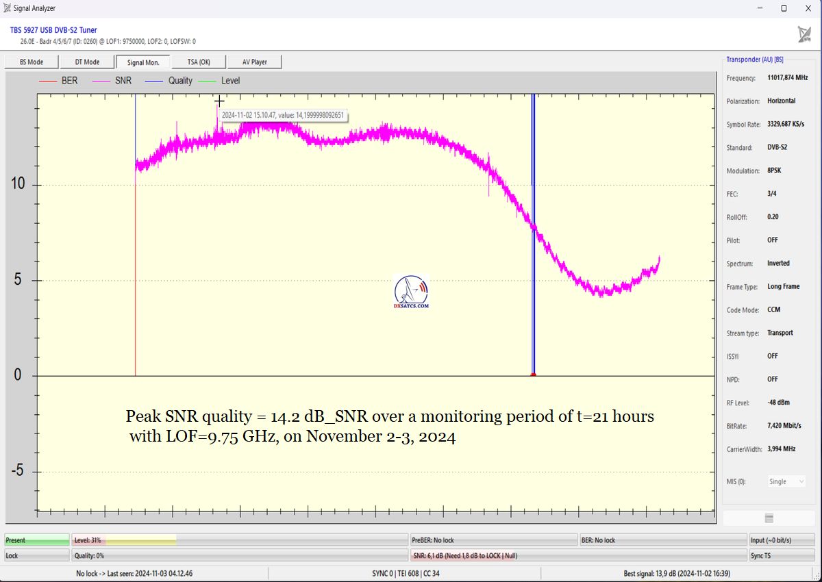 V závislosti od poveternostných podmienok a od použitého LNB značky SMW špička kvality dosahovala úrovní od 13,6 dB (pri t=76 hodín a LOF=10 GHz) do 14,2 dB_SNR (pri t=21 hodín a LOF=9.75 GHz)