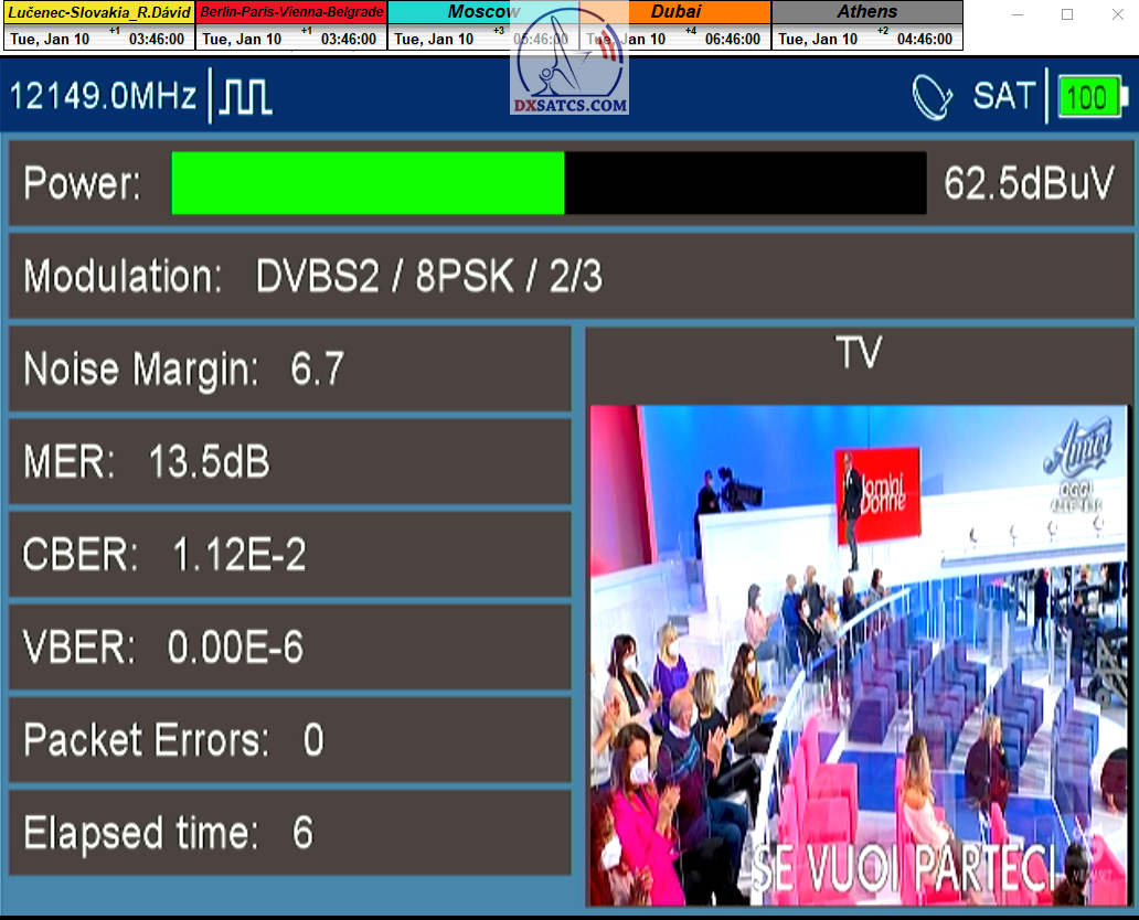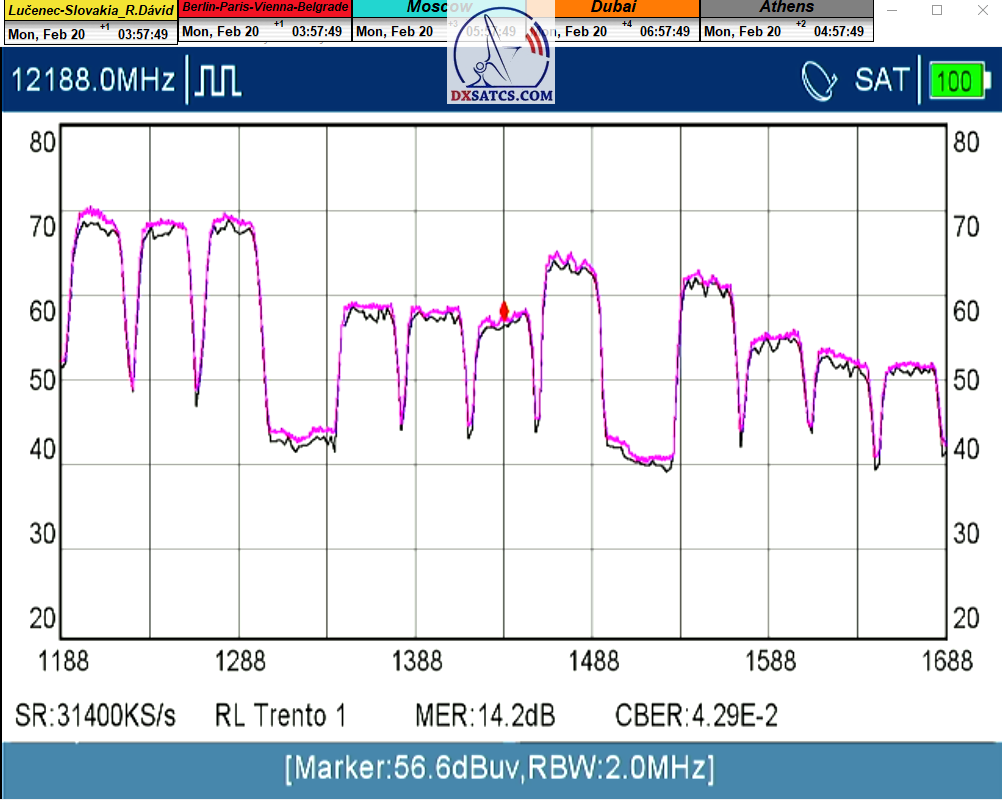 formy príjmu typicky 8-10 hodín,každý monitorovaný deň (bez jedinej pixelácie) so špičkou kvality SNR=7,8-8,2 dB v rozsahu od približne