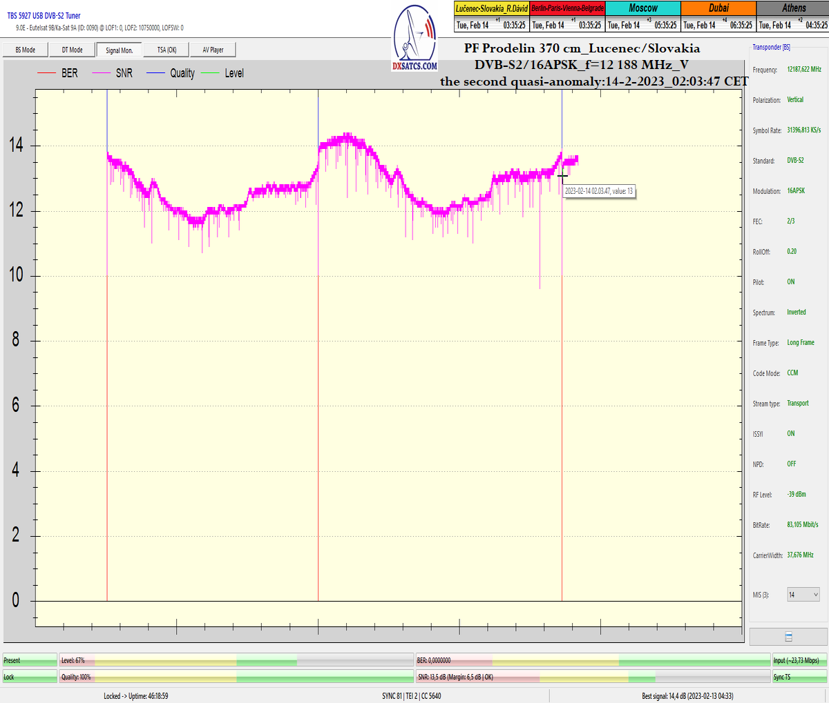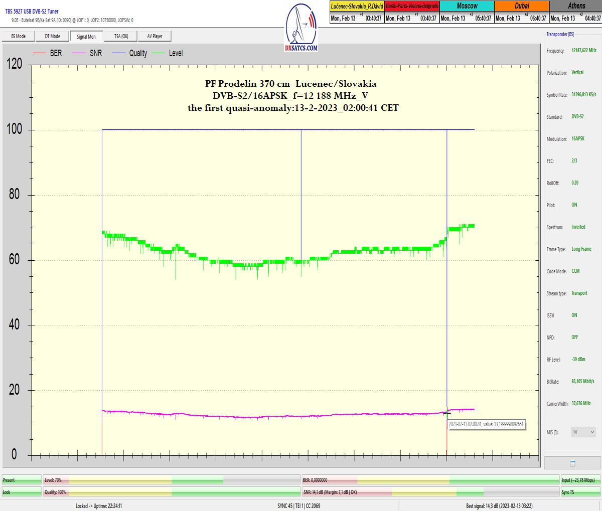 ►22.3.2023 : výsledky signálneho monitoringu frekvencie f=12 380 MHz_V v kvantite t=1x72 hodín na výstupe zo symetrického reflektora s D=370 cm týmto potvrdzujú správnosť mojich predošlých záverov o výskyte javu (ne) cyklických anomálií v rovnakom časovom úseku,alebo inak povedané (ne) pravidelných a dokázateľne vysokých výkonnostných odchýlok-poklesoch od typicky demonštrujúceho sa normálu v intenzite EIRP v danom čase a v danom zemepisnom bode a pravdivosť mojich záverov dokazuje najnovší signálny monitoring v ktorom nie je ani len náznak po jave anomálií,ktorý vznikal a zanikal od cca 12:35 do cca 12:45 SEČ . Pochopiteľne kvantita monitoringu t=72 hodín mi nedovoľuje stanoviť akékoľvek formy kategorických záverov tejto témy,ale s určitosťou môžem potvrdiť že v spomínanom časovom úseku ich predošlého výskytu dnes nie je už ani len náznak po skokovom poklese v intenzite EIRP. Jednu sekundovú mikro-pixeláciu pri úrovni kvality okolo SNR=13,2 dB,ktorá vznikla pri príchode brázdy nízkeho tlaku vzduchu v noci dňa 15.3.2023 (dažďové prehánky) môžem zanedbať a dosiahnutý výsledok klasifikovať ako kvázi exemplárny s každodennou amplitúdou špičky kvality okolo SNR=14 dB na výstupe z DVB-S2 tunera TBS 5927
