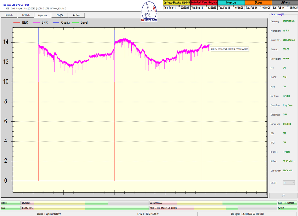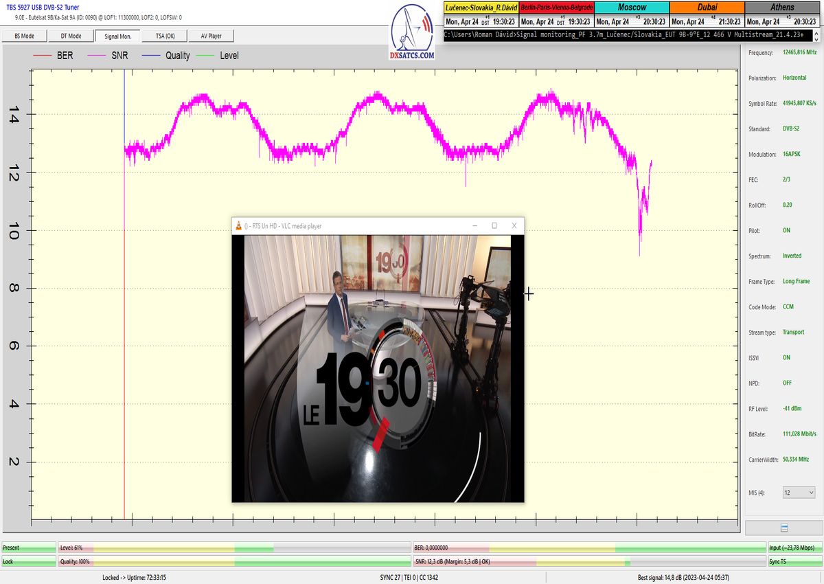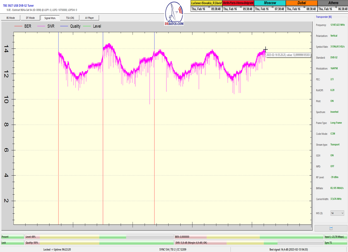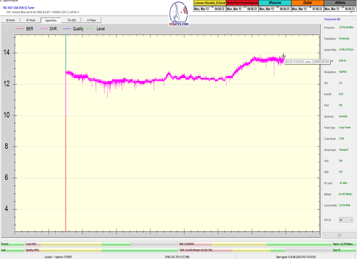 ►Analýza : v prvej polovici časového úseku od 5.1.2023 do 11.1.2023 som koncentroval signálne dáta v kontinuálnom monitoringu v kvantite 1x72 hodín,ktorý má za úlohu nespochybnitelne dokázať exemplárnu a každodennú stabilitu príjmu bez jedinej pixelácie a výpadku v spojitosti priebehu s typickou špičkou kvality od 12,7 do 13 dB v závislosti od okamžitých poveternostných podmienok na výstupes tunera TBS 5927 a v druhej polovici časového úseku od 9.1.2023 do 11.1.2023 som si dal za úlohu dokázať typickú,alebo každodenne sa opakujúcu špičku kvality od MER=13,4 do MER=13,8 dB na výstupe z multistream analyzátora METEK,v závislosti od momentálneho stavu v atmosfére.