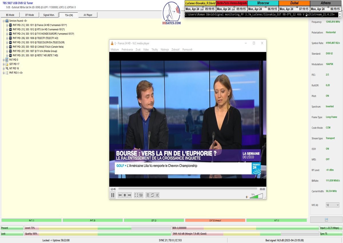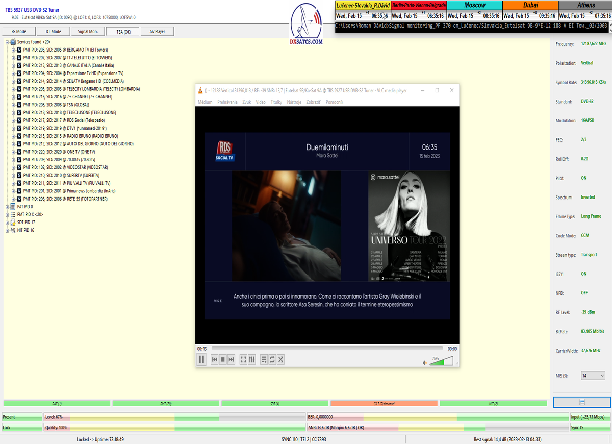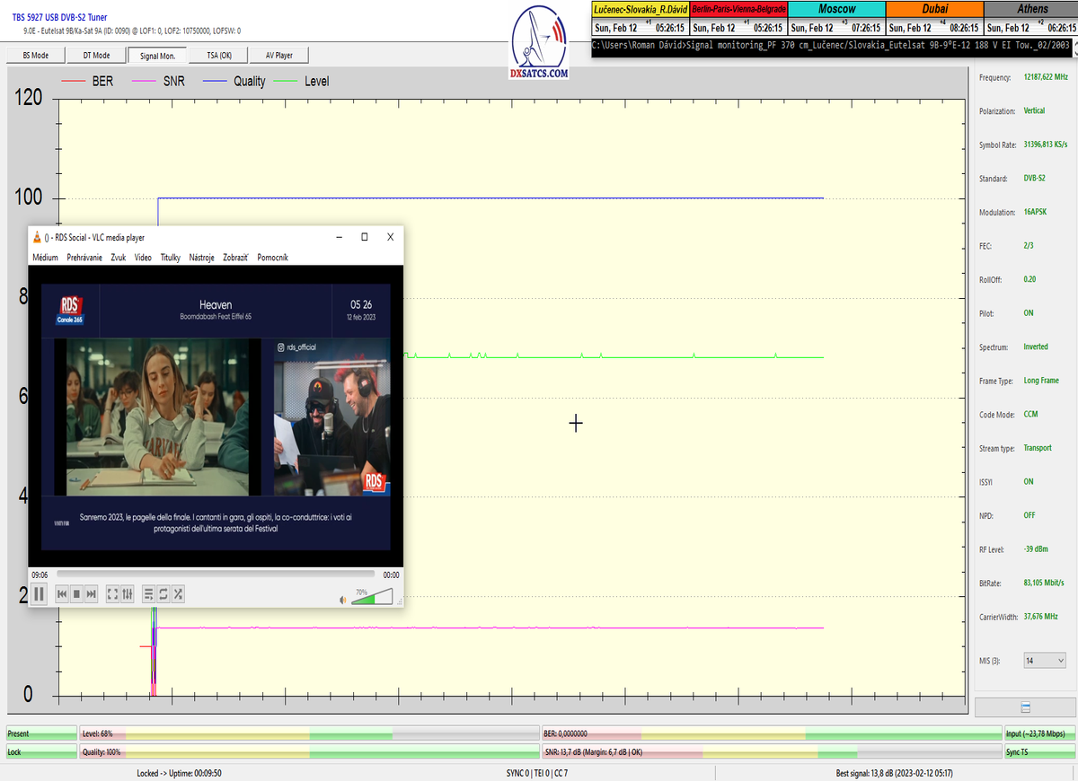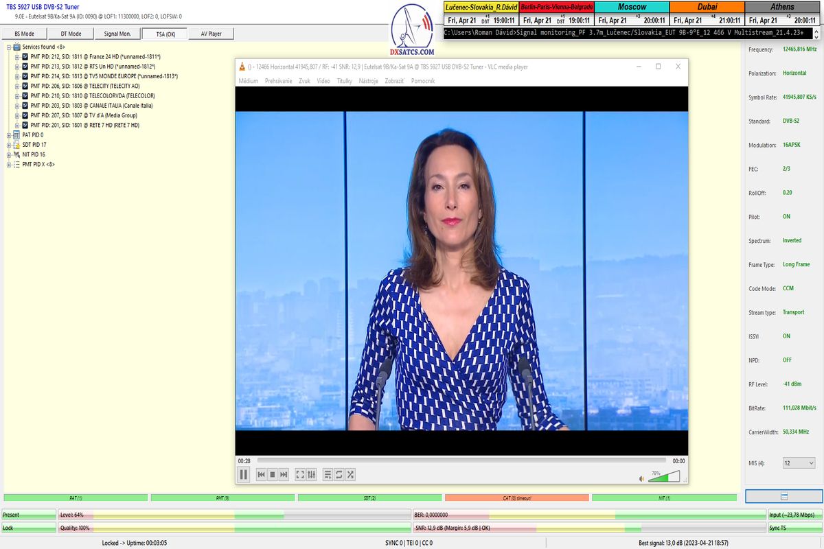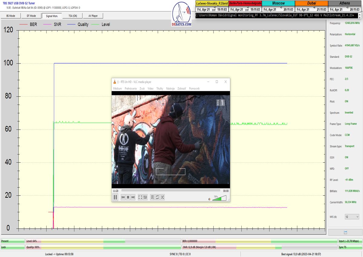 ►Analýza : v prvej polovici časového úseku od 5.1.2023 do 11.1.2023 som koncentroval signálne dáta v kontinuálnom monitoringu v kvantite 1x72 hodín,ktorý má za úlohu nespochybnitelne dokázať exemplárnu a každodennú stabilitu príjmu bez jedinej pixelácie a výpadku v spojitosti priebehu s typickou špičkou kvality od 12,7 do 13 dB v závislosti od okamžitých poveternostných podmienok na výstupes tunera TBS 5927 a v druhej polovici časového úseku od 9.1.2023 do 11.1.2023 som si dal za úlohu dokázať typickú,alebo každodenne sa opakujúcu špičku kvality od MER=13,4 do MER=13,8 dB na výstupe z multistream analyzátora METEK,v závislosti od momentálneho stavu v atmosfére.