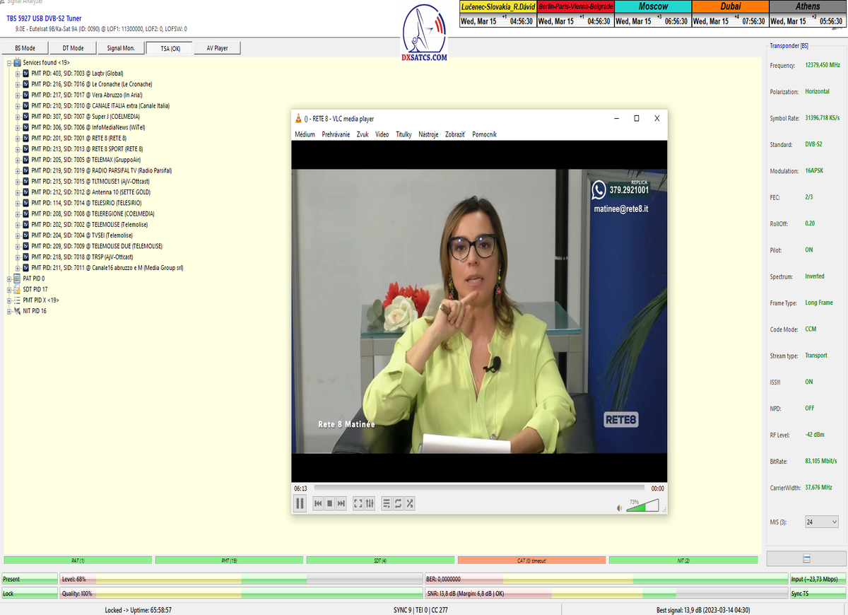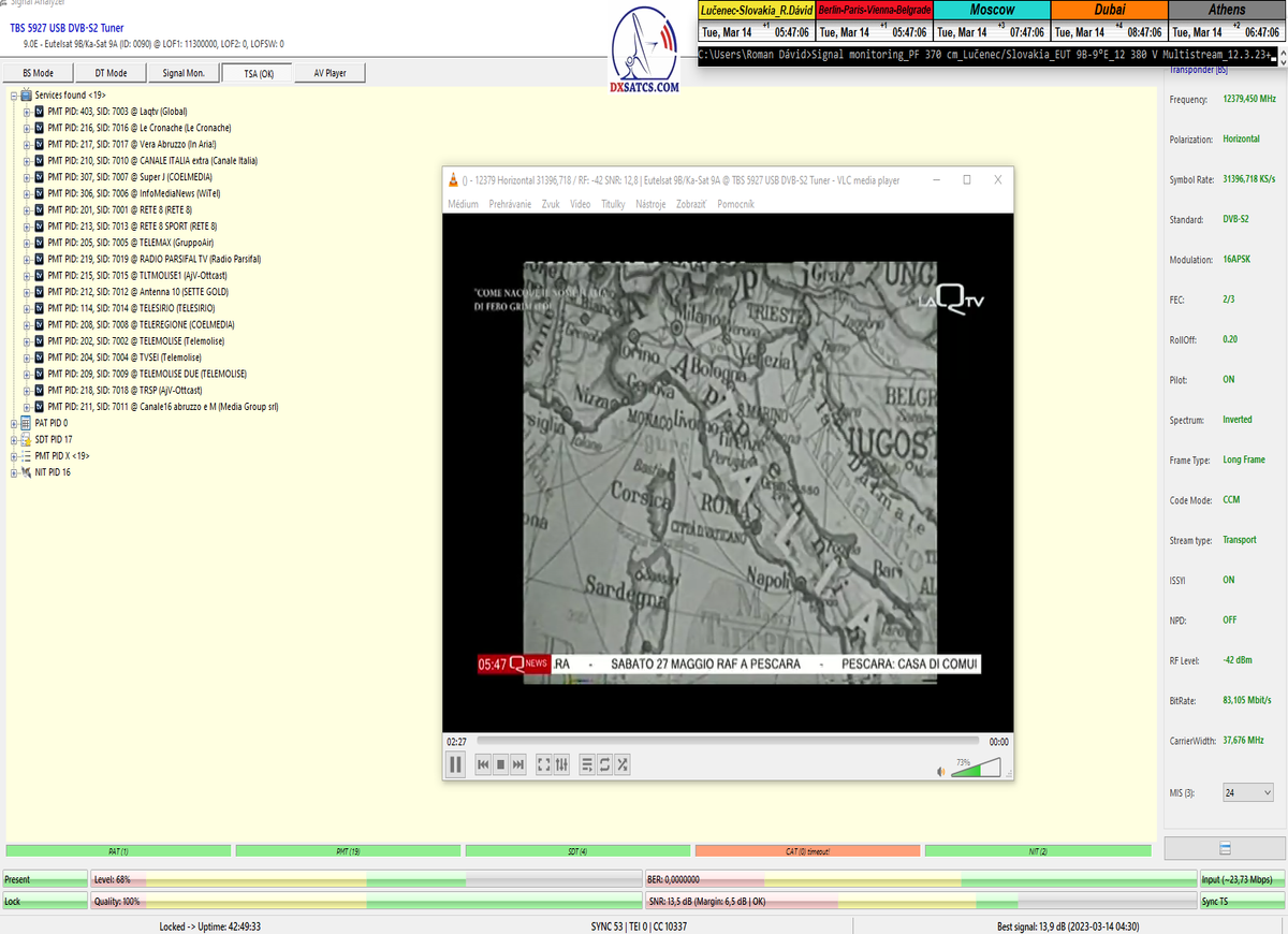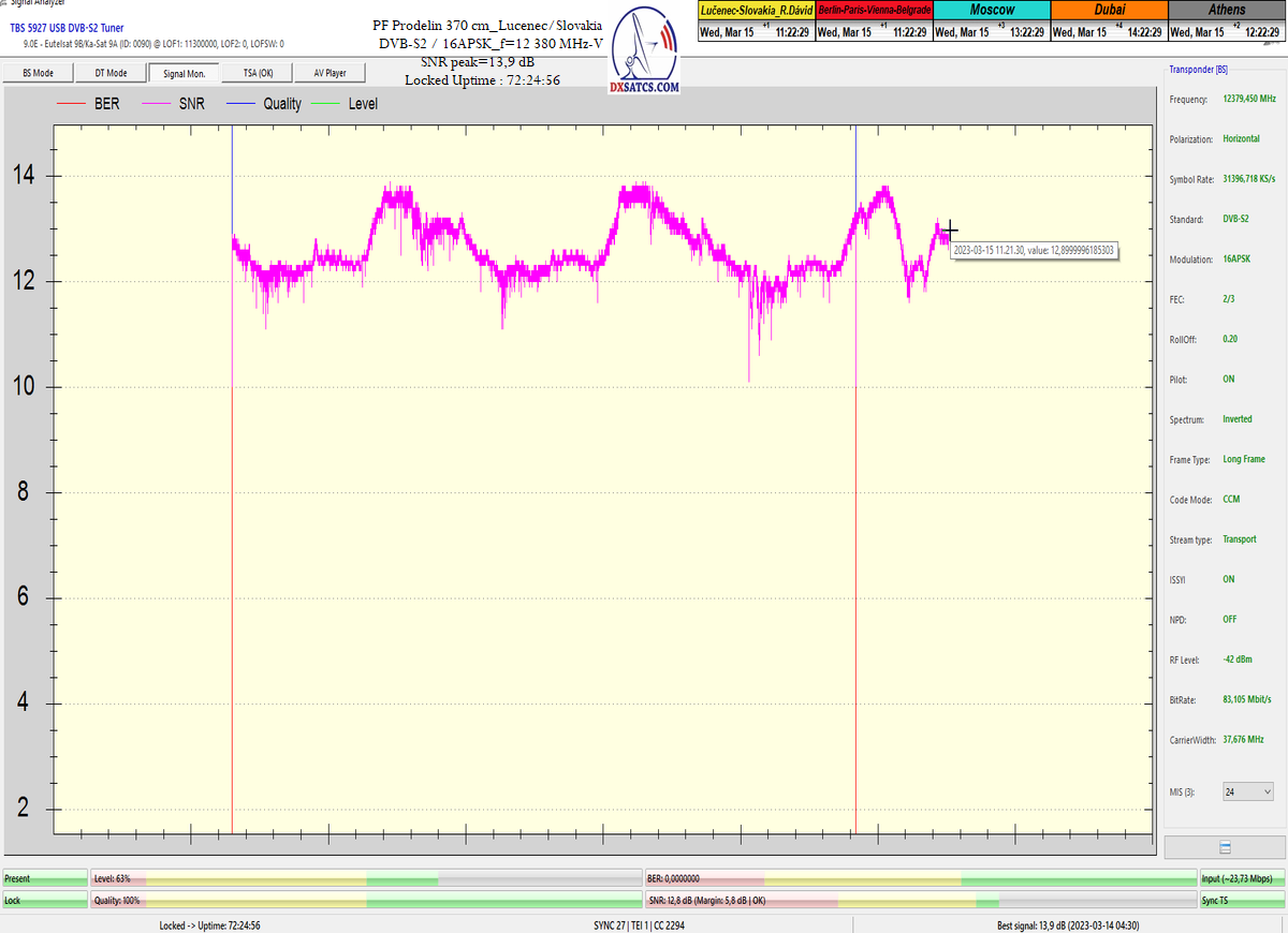 ►v signálnom monitoringu dokázaný a plne stabilný príjem bez jediného výpadku za jednotku t=72 hodín,pri častých dažďových prehánkach a každodenne dosiahnutá špička kvality okolo SNR=13,8 dB s tunerom TBS 5925/5927 alebo okolo MER=14,2 s analyzátorom Metek HD na f=12 111 V .