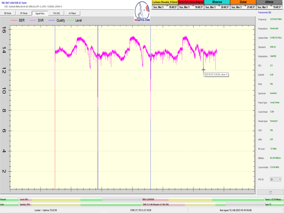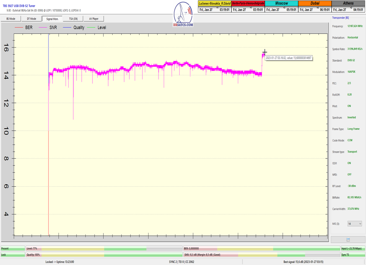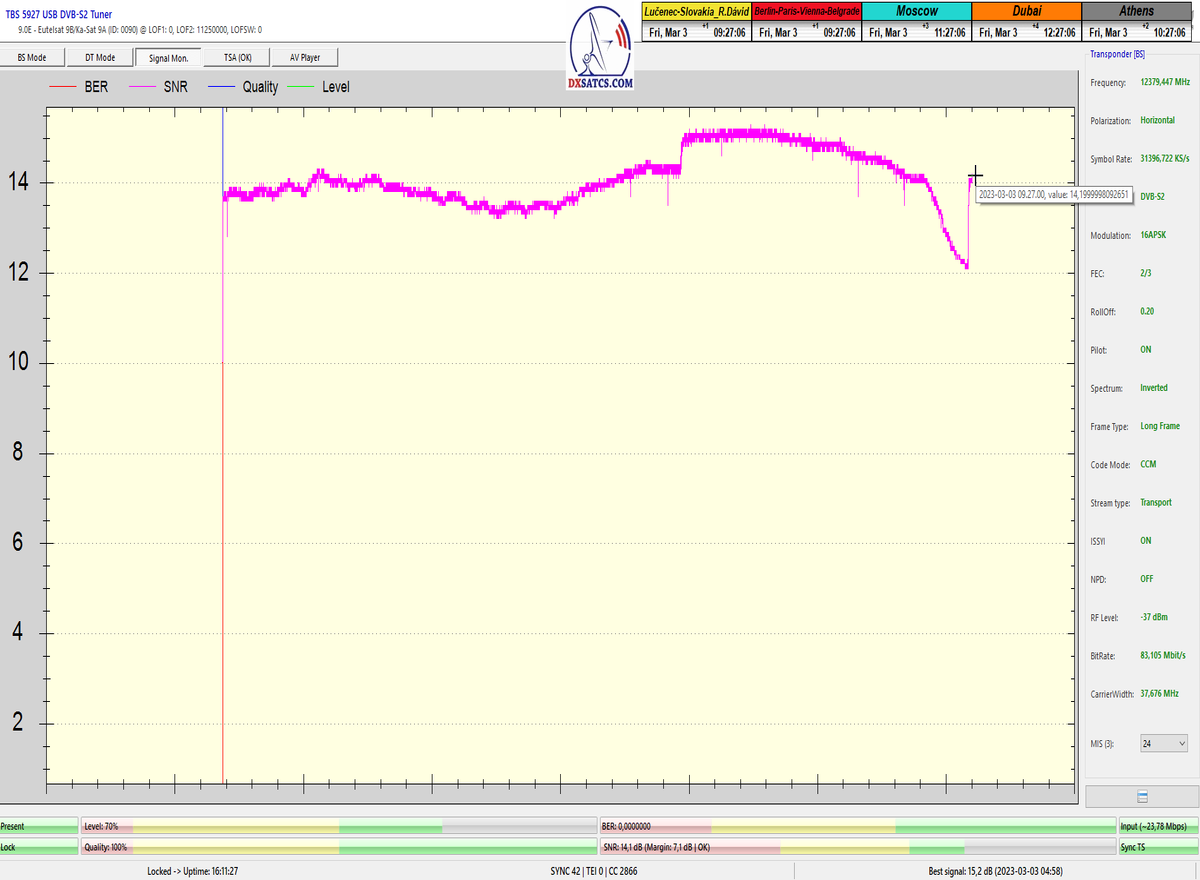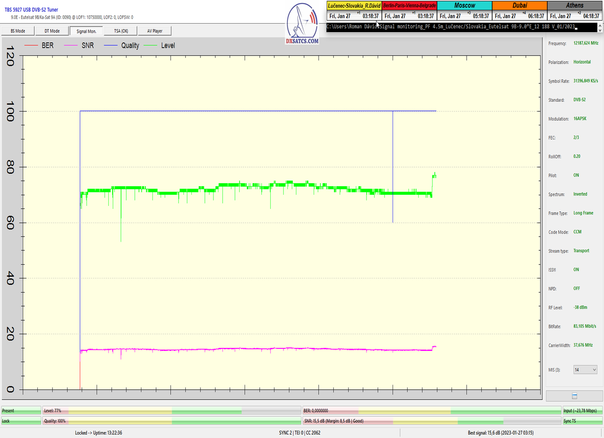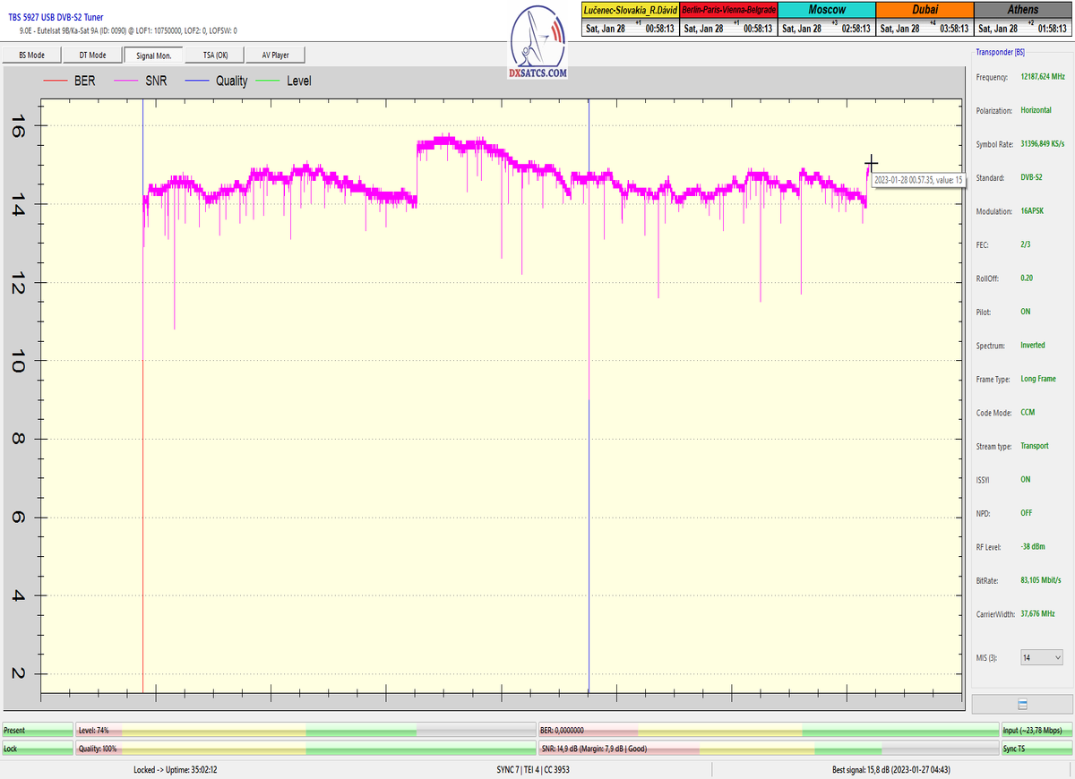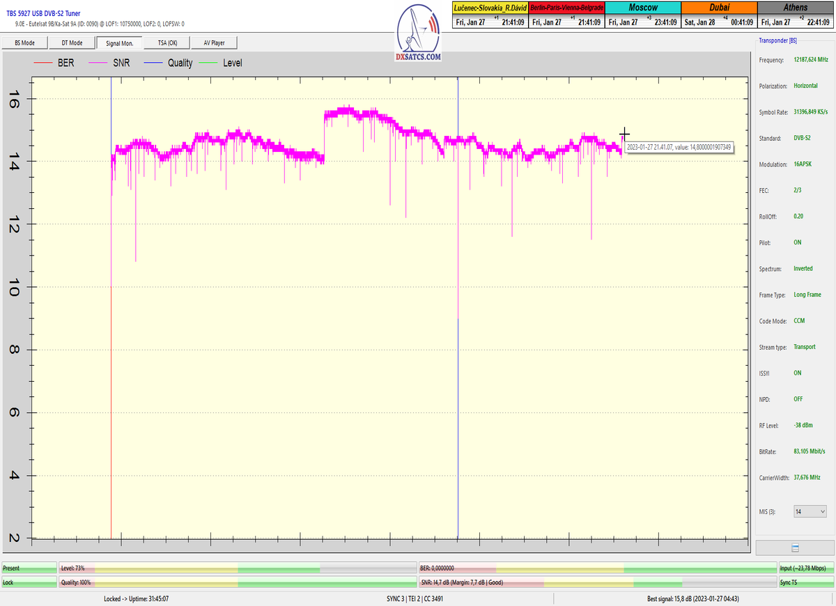 8.2.2023 : Na príklade dokazovania v signálnom monitoringu v dĺžke 1x73 hodín dnes nespochybniteľne dokážem začlenenie frekvencie f=12 188 MHz_V do DTH kategorizácie štandardnej formy konštantne stabilného satelitného príjmu (99,999%) s doteraz najvyššou špičkou kvality okolo SNR=15,8 dB ktorá sa opakuje každý deň.Z technologickej stránky je príjem z TP IT3 výnimočný hlavne tým že veľkosť uhlovej odchýlky SKEW ostáva konštantná aj pri výrazných zmenách v poveternostných podmienkach.Ďalej dnes dokážem plnú stabilitu príjmu v štandarde DVBS2-16APSK-Multistream aj pri intenzívnom snežení dňa 27.1.2023 so stabilnou výškou kvality okolo SNR=14,3 dB atď