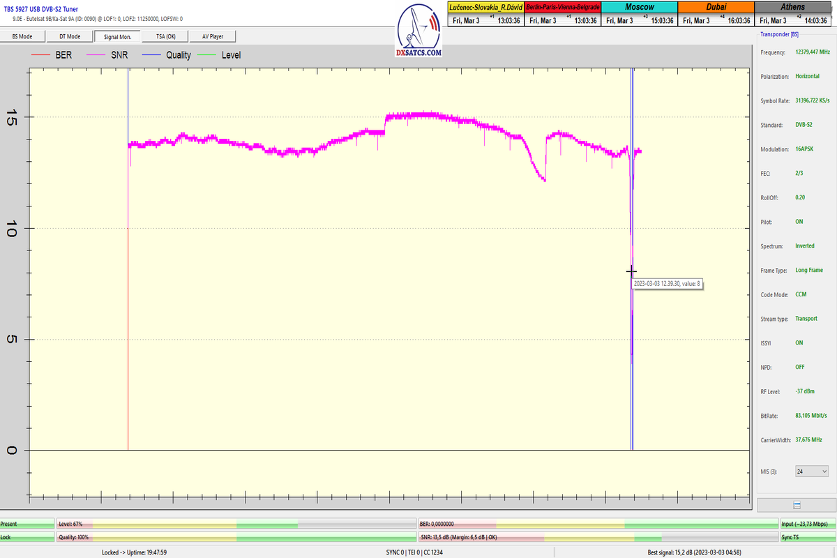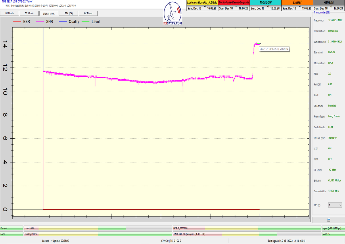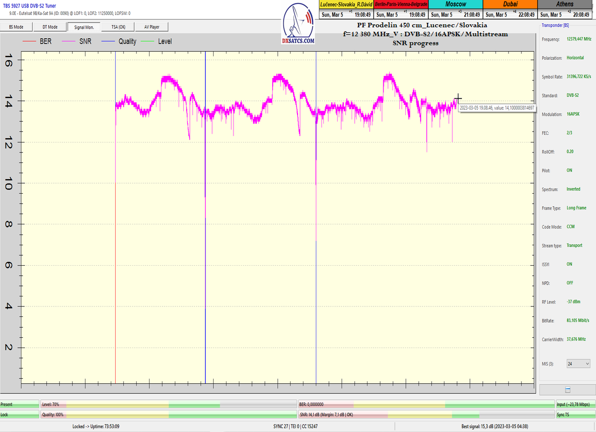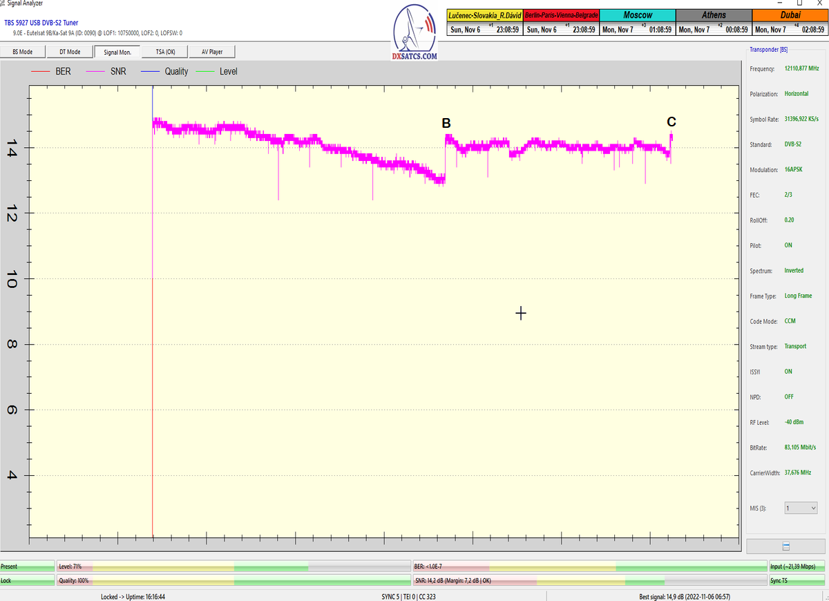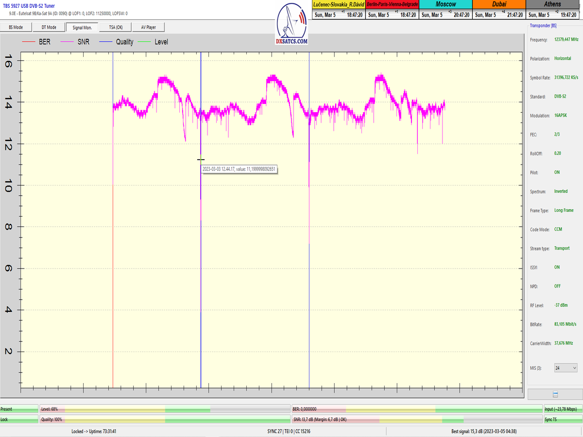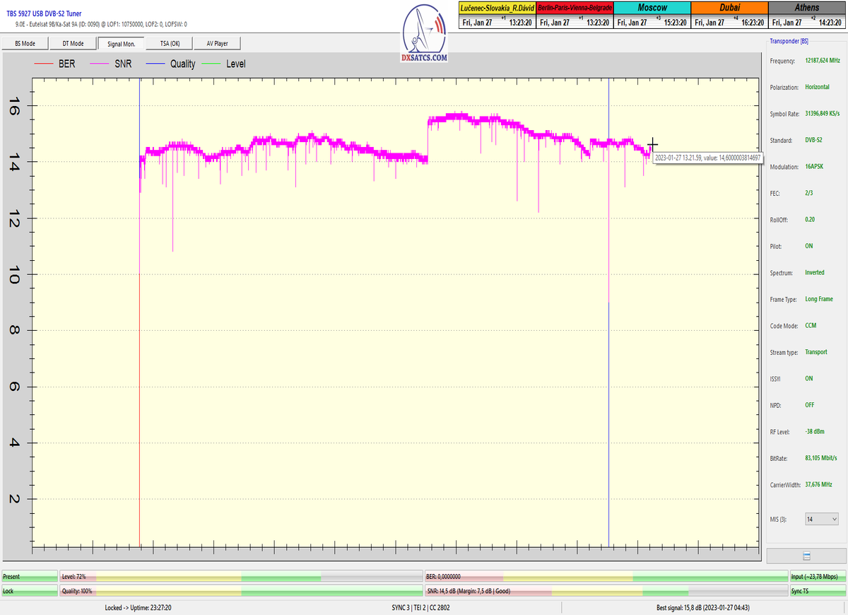 8.2.2023 : Na príklade dokazovania v signálnom monitoringu v dĺžke 1x73 hodín dnes nespochybniteľne dokážem začlenenie frekvencie f=12 188 MHz_V do DTH kategorizácie štandardnej formy konštantne stabilného satelitného príjmu (99,999%) s doteraz najvyššou špičkou kvality okolo SNR=15,8 dB ktorá sa opakuje každý deň.Z technologickej stránky je príjem z TP IT3 výnimočný hlavne tým že veľkosť uhlovej odchýlky SKEW ostáva konštantná aj pri výrazných zmenách v poveternostných podmienkach.Ďalej dnes dokážem plnú stabilitu príjmu v štandarde DVBS2-16APSK-Multistream aj pri intenzívnom snežení dňa 27.1.2023 so stabilnou výškou kvality okolo SNR=14,3 dB atď