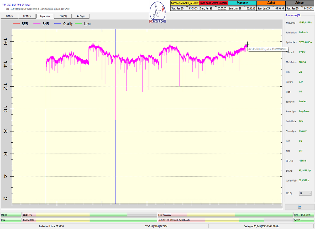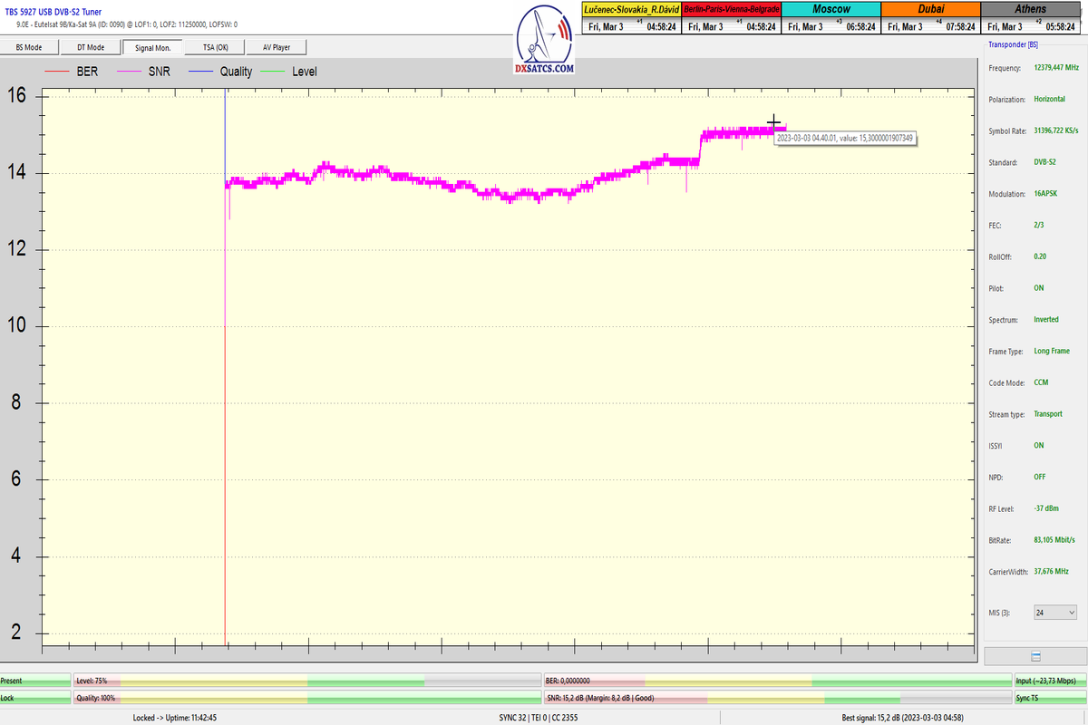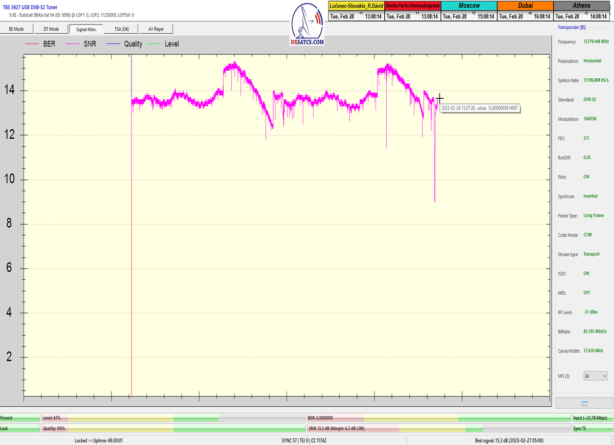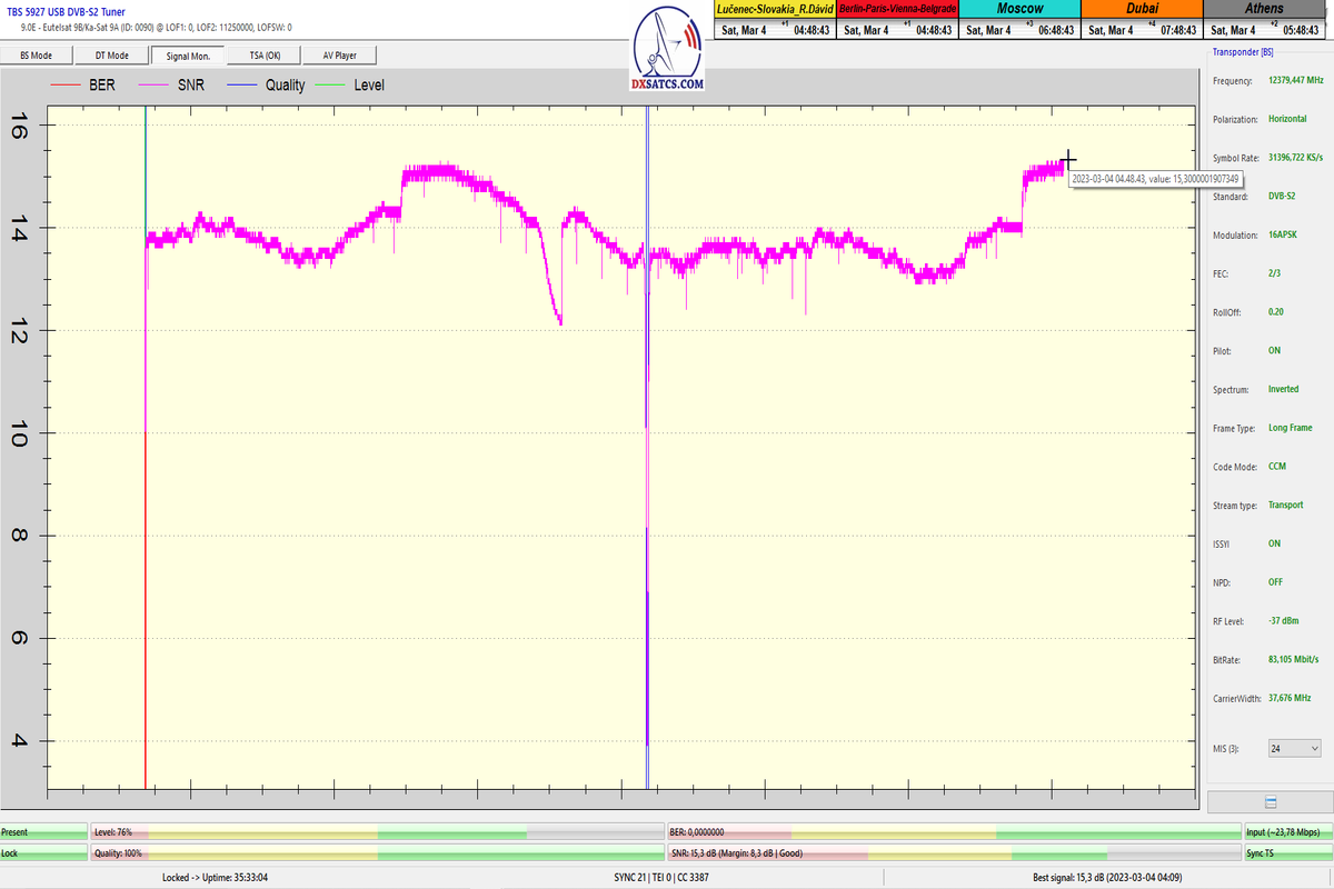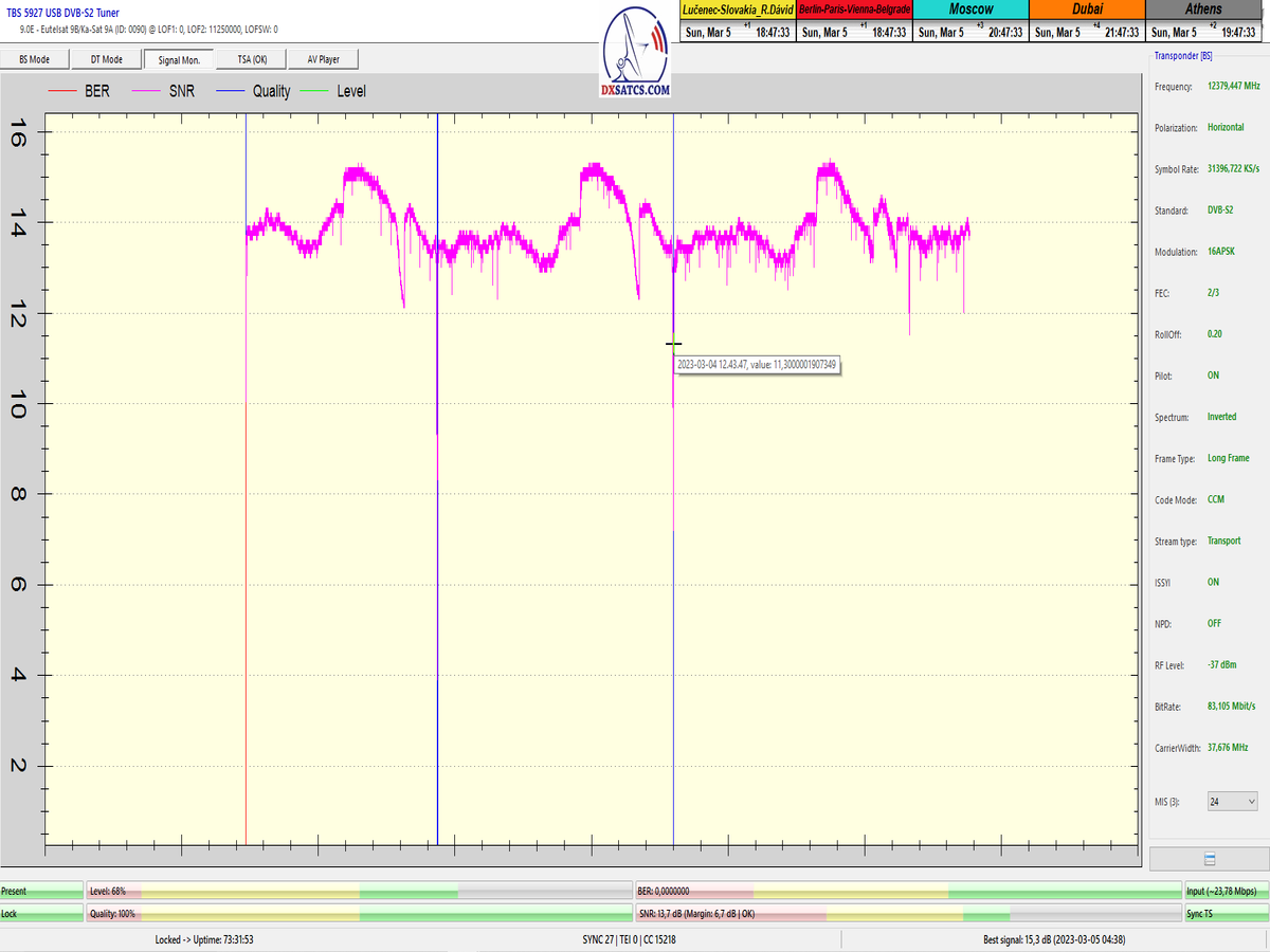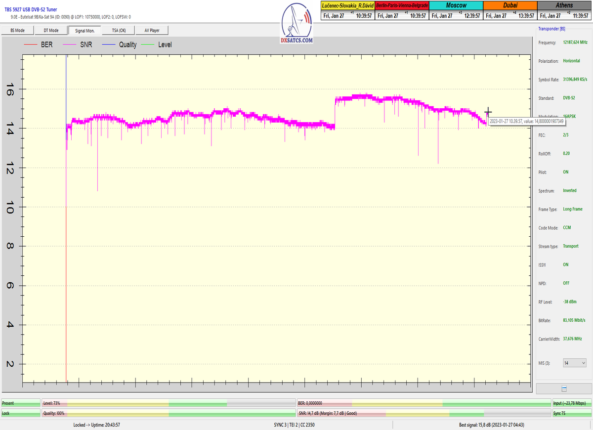 8.2.2023 : Na príklade dokazovania v signálnom monitoringu v dĺžke 1x73 hodín dnes nespochybniteľne dokážem začlenenie frekvencie f=12 188 MHz_V do DTH kategorizácie štandardnej formy konštantne stabilného satelitného príjmu (99,999%) s doteraz najvyššou špičkou kvality okolo SNR=15,8 dB ktorá sa opakuje každý deň.Z technologickej stránky je príjem z TP IT3 výnimočný hlavne tým že veľkosť uhlovej odchýlky SKEW ostáva konštantná aj pri výrazných zmenách v poveternostných podmienkach.Ďalej dnes dokážem plnú stabilitu príjmu v štandarde DVBS2-16APSK-Multistream aj pri intenzívnom snežení dňa 27.1.2023 so stabilnou výškou kvality okolo SNR=14,3 dB atď