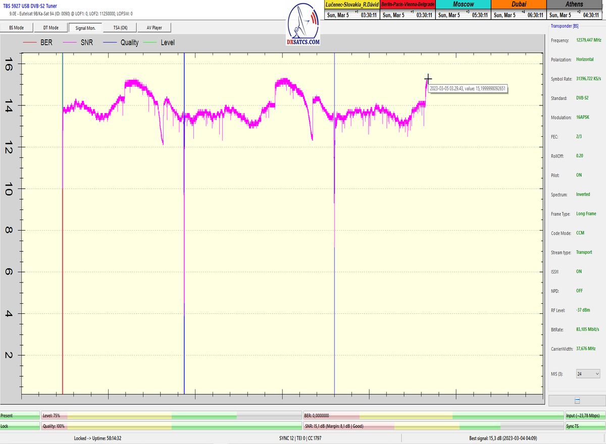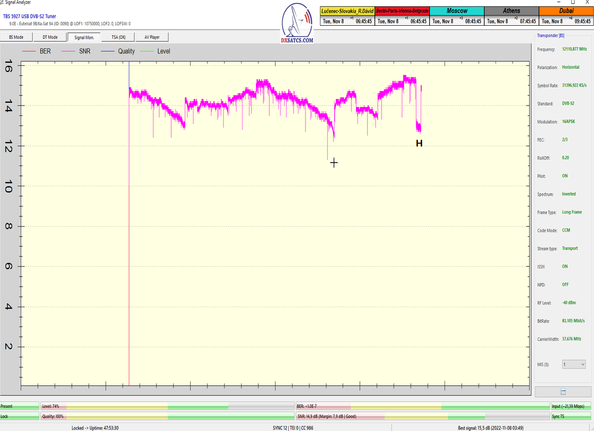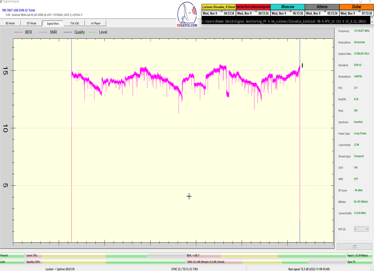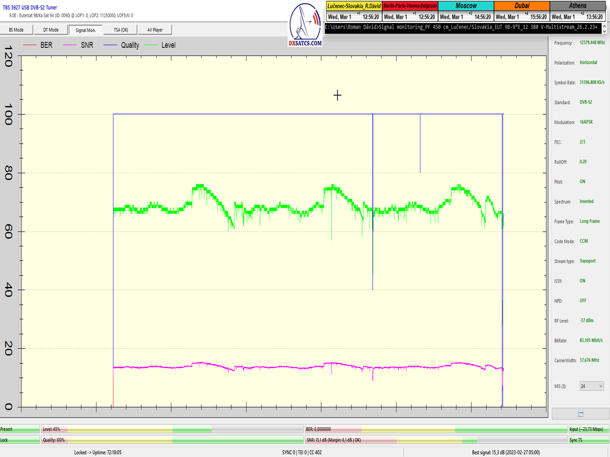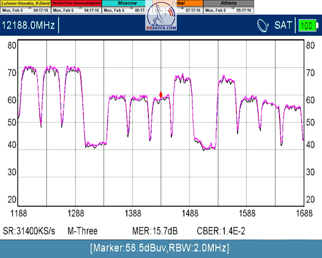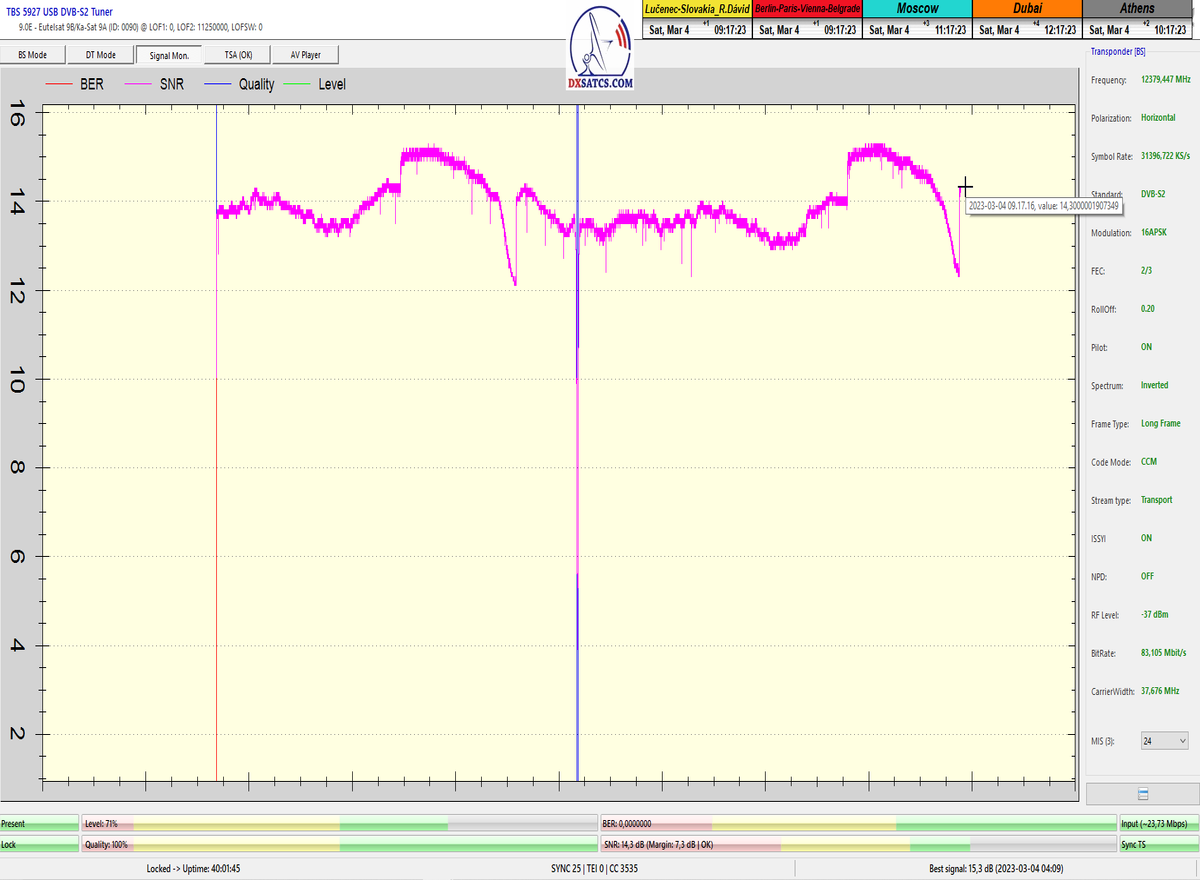 8.2.2023 : Na príklade dokazovania v signálnom monitoringu v dĺžke 1x73 hodín dnes nespochybniteľne dokážem začlenenie frekvencie f=12 188 MHz_V do DTH kategorizácie štandardnej formy konštantne stabilného satelitného príjmu (99,999%) s doteraz najvyššou špičkou kvality okolo SNR=15,8 dB ktorá sa opakuje každý deň.Z technologickej stránky je príjem z TP IT3 výnimočný hlavne tým že veľkosť uhlovej odchýlky SKEW ostáva konštantná aj pri výrazných zmenách v poveternostných podmienkach.Ďalej dnes dokážem plnú stabilitu príjmu v štandarde DVBS2-16APSK-Multistream aj pri intenzívnom snežení dňa 27.1.2023 so stabilnou výškou kvality okolo SNR=14,3 dB atď