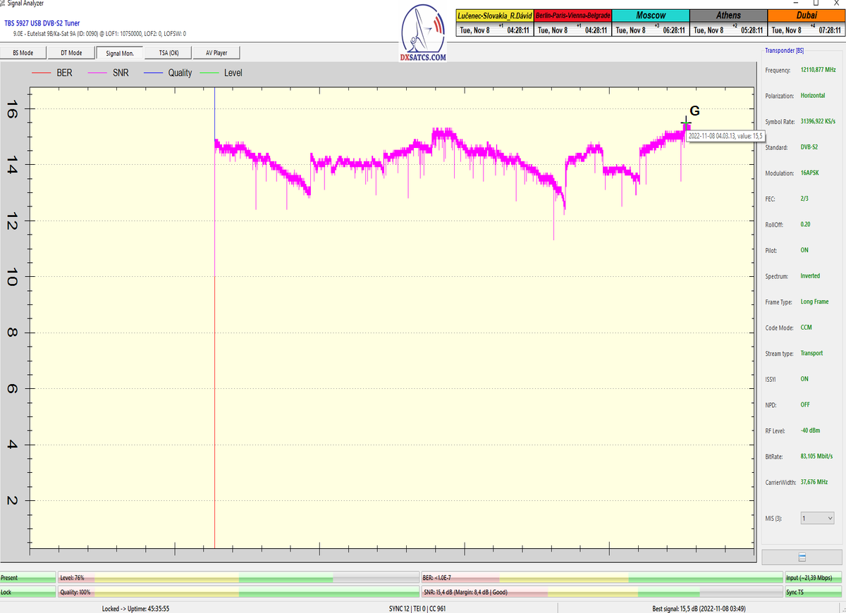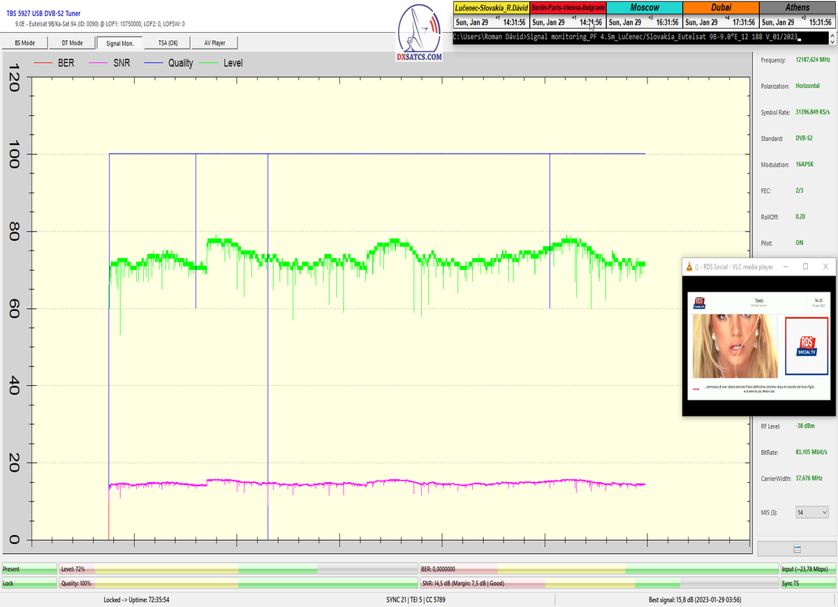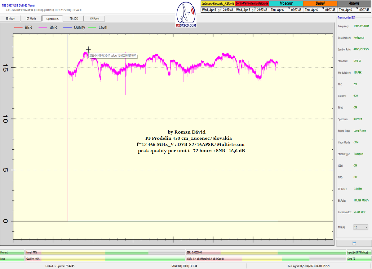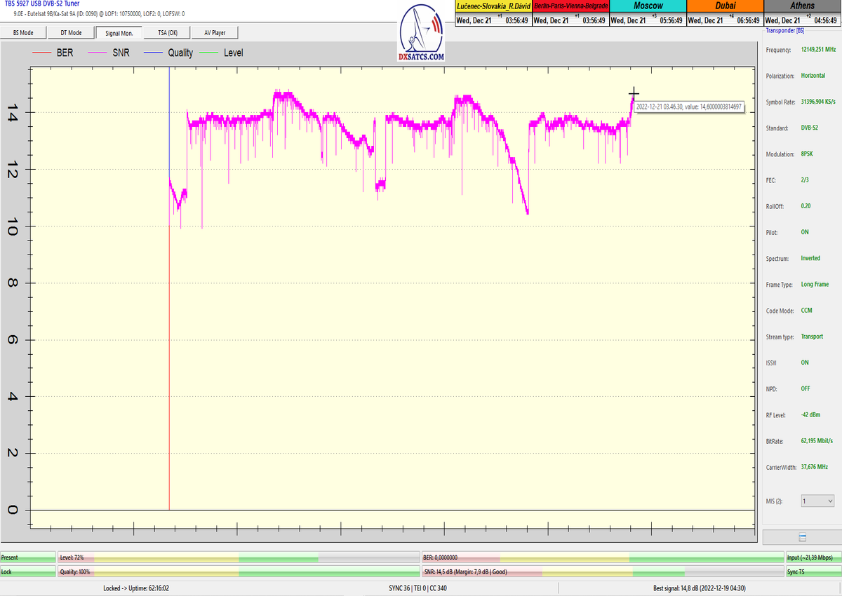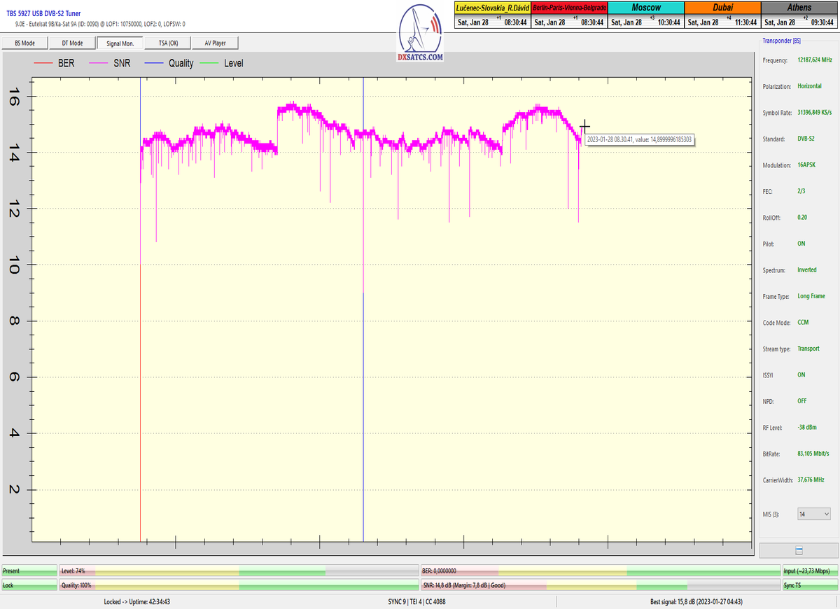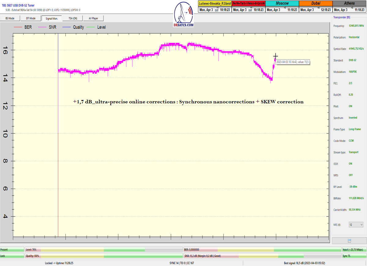 8.2.2023 : Na príklade dokazovania v signálnom monitoringu v dĺžke 1x73 hodín dnes nespochybniteľne dokážem začlenenie frekvencie f=12 188 MHz_V do DTH kategorizácie štandardnej formy konštantne stabilného satelitného príjmu (99,999%) s doteraz najvyššou špičkou kvality okolo SNR=15,8 dB ktorá sa opakuje každý deň.Z technologickej stránky je príjem z TP IT3 výnimočný hlavne tým že veľkosť uhlovej odchýlky SKEW ostáva konštantná aj pri výrazných zmenách v poveternostných podmienkach.Ďalej dnes dokážem plnú stabilitu príjmu v štandarde DVBS2-16APSK-Multistream aj pri intenzívnom snežení dňa 27.1.2023 so stabilnou výškou kvality okolo SNR=14,3 dB atď
