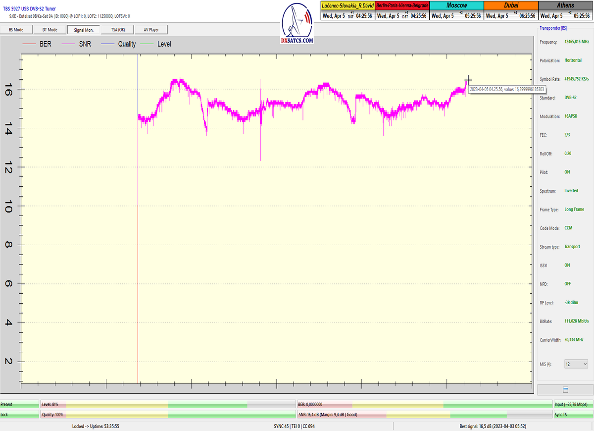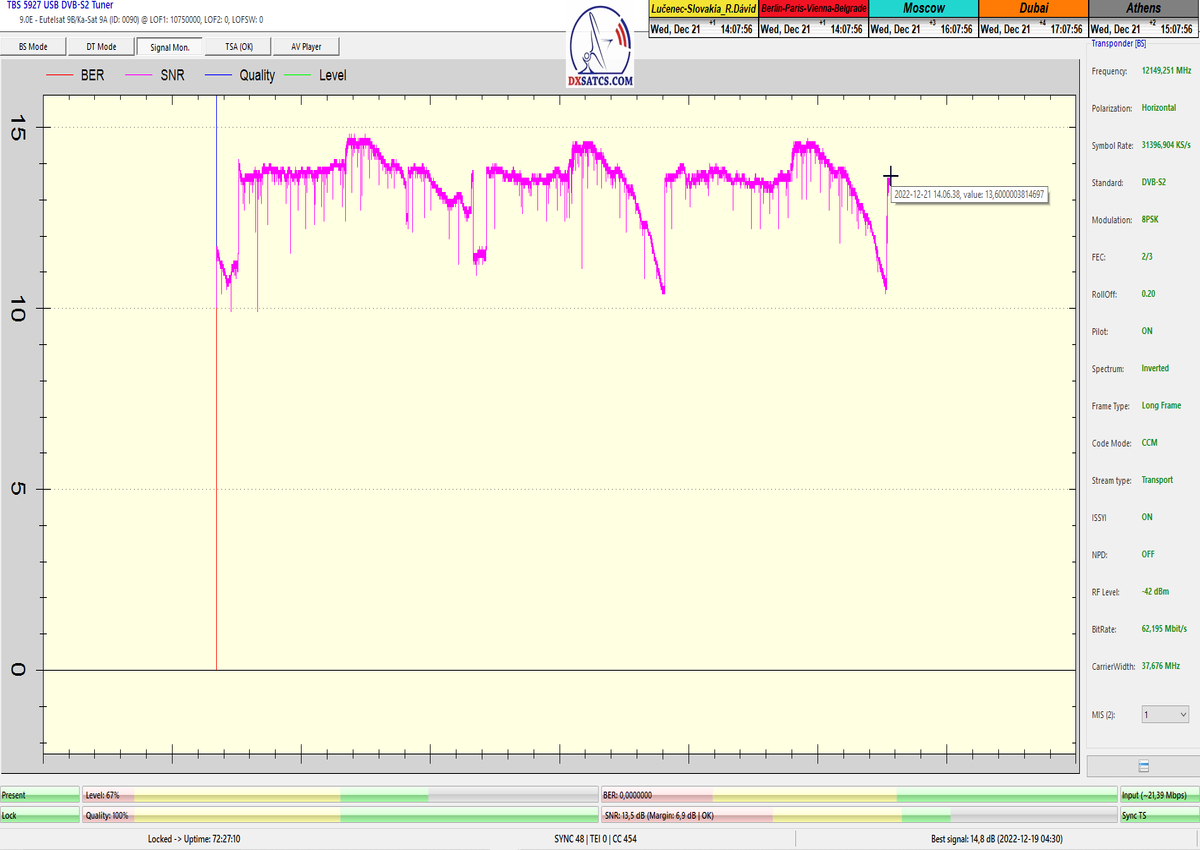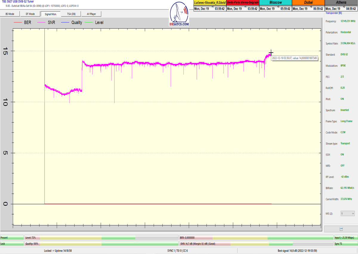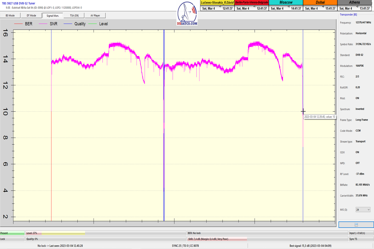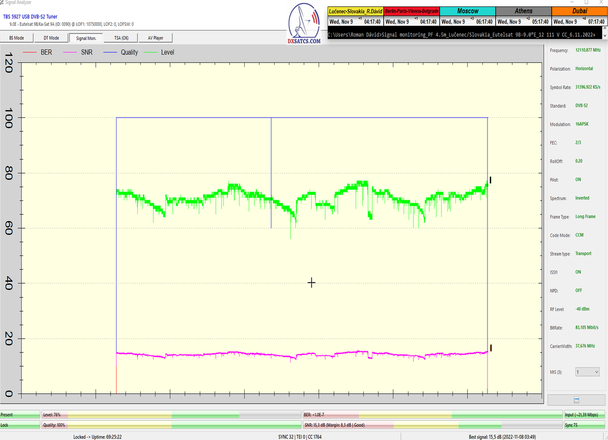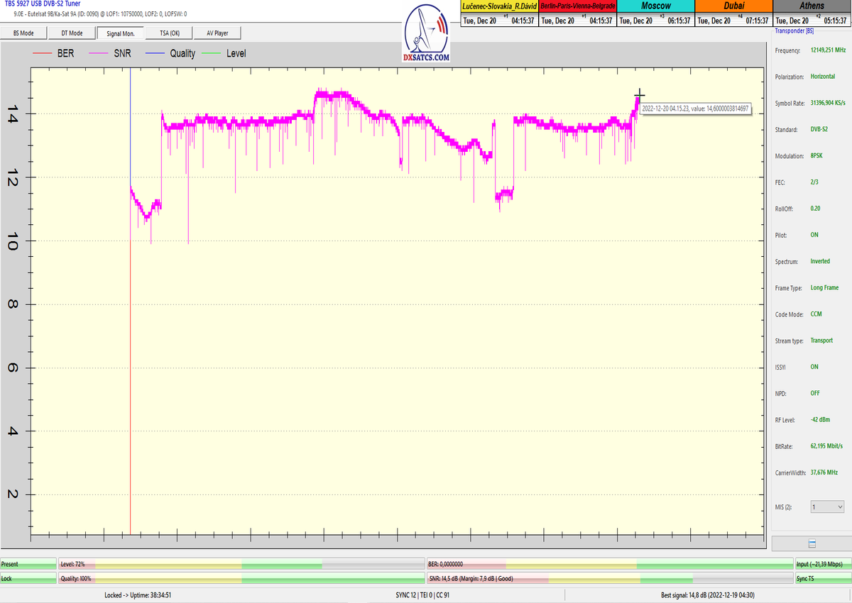 8.2.2023 : Na príklade dokazovania v signálnom monitoringu v dĺžke 1x73 hodín dnes nespochybniteľne dokážem začlenenie frekvencie f=12 188 MHz_V do DTH kategorizácie štandardnej formy konštantne stabilného satelitného príjmu (99,999%) s doteraz najvyššou špičkou kvality okolo SNR=15,8 dB ktorá sa opakuje každý deň.Z technologickej stránky je príjem z TP IT3 výnimočný hlavne tým že veľkosť uhlovej odchýlky SKEW ostáva konštantná aj pri výrazných zmenách v poveternostných podmienkach.Ďalej dnes dokážem plnú stabilitu príjmu v štandarde DVBS2-16APSK-Multistream aj pri intenzívnom snežení dňa 27.1.2023 so stabilnou výškou kvality okolo SNR=14,3 dB atď