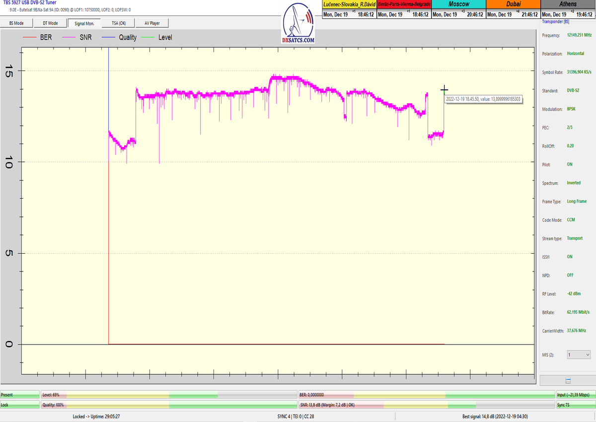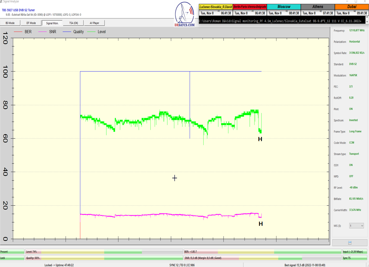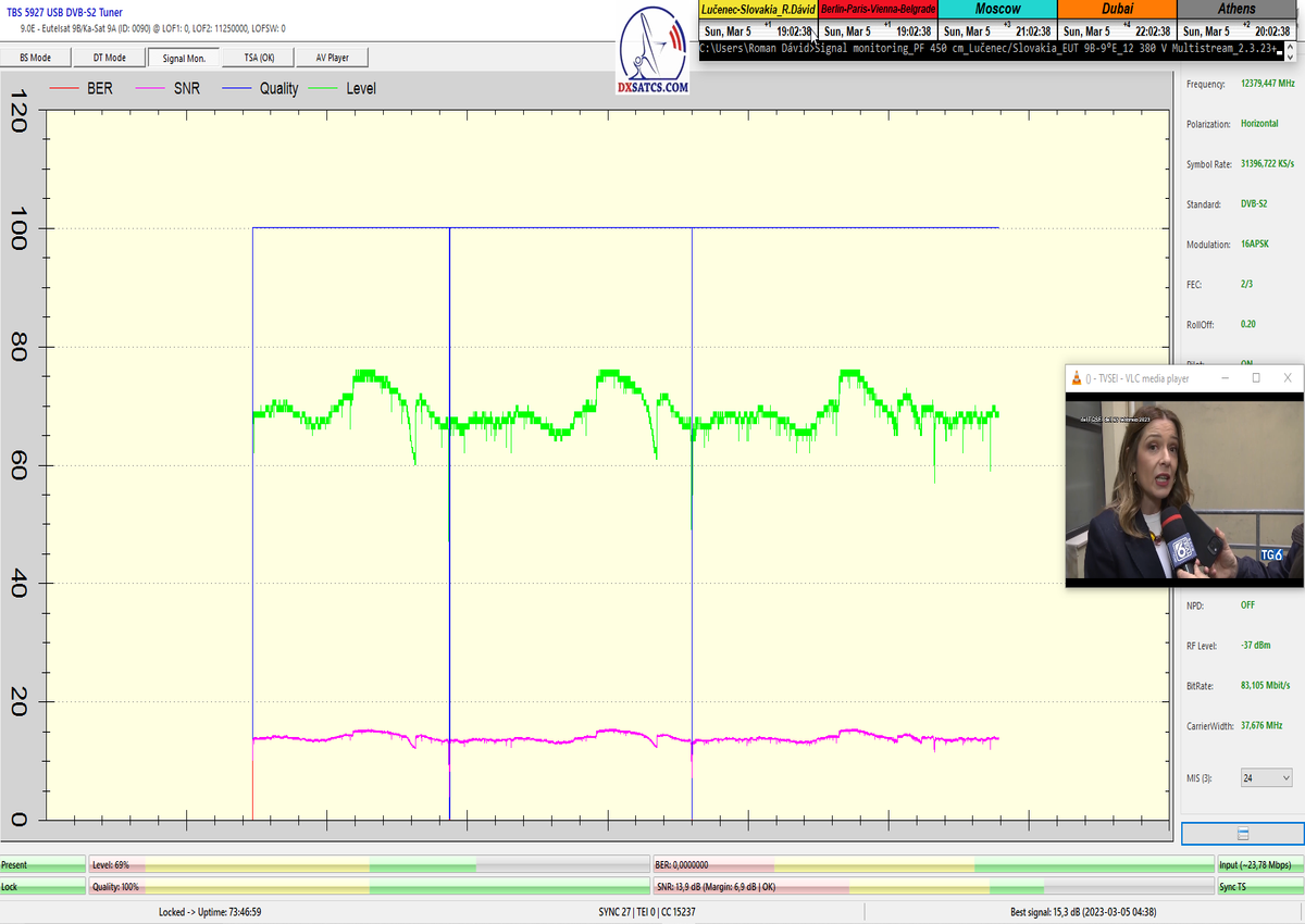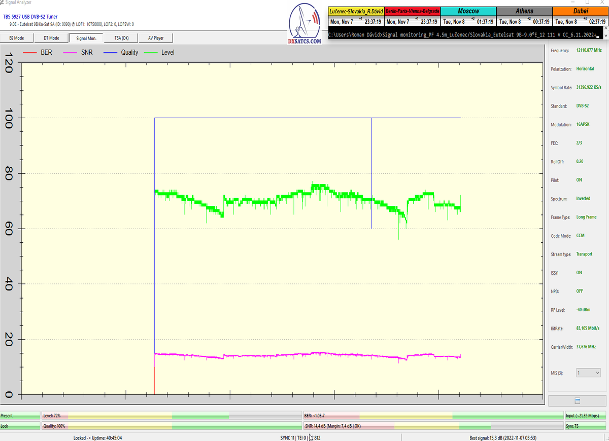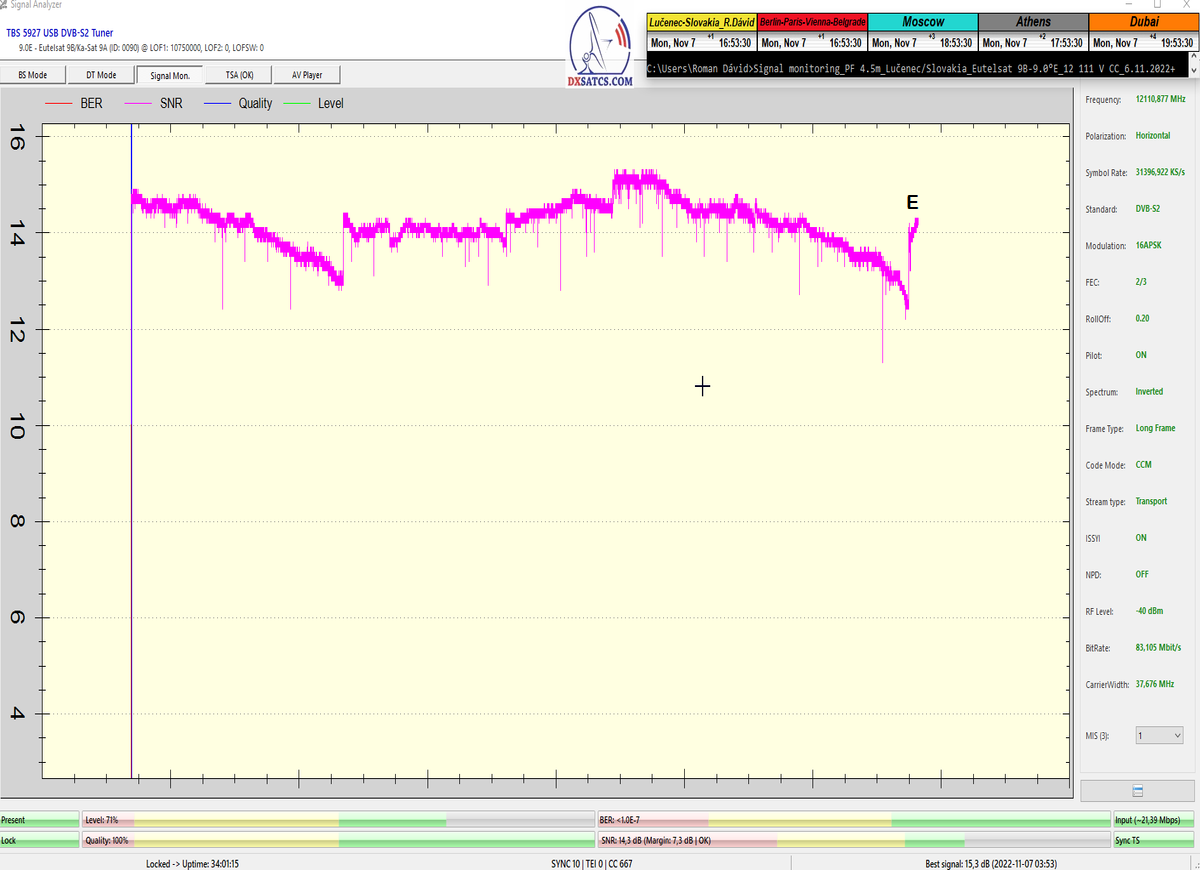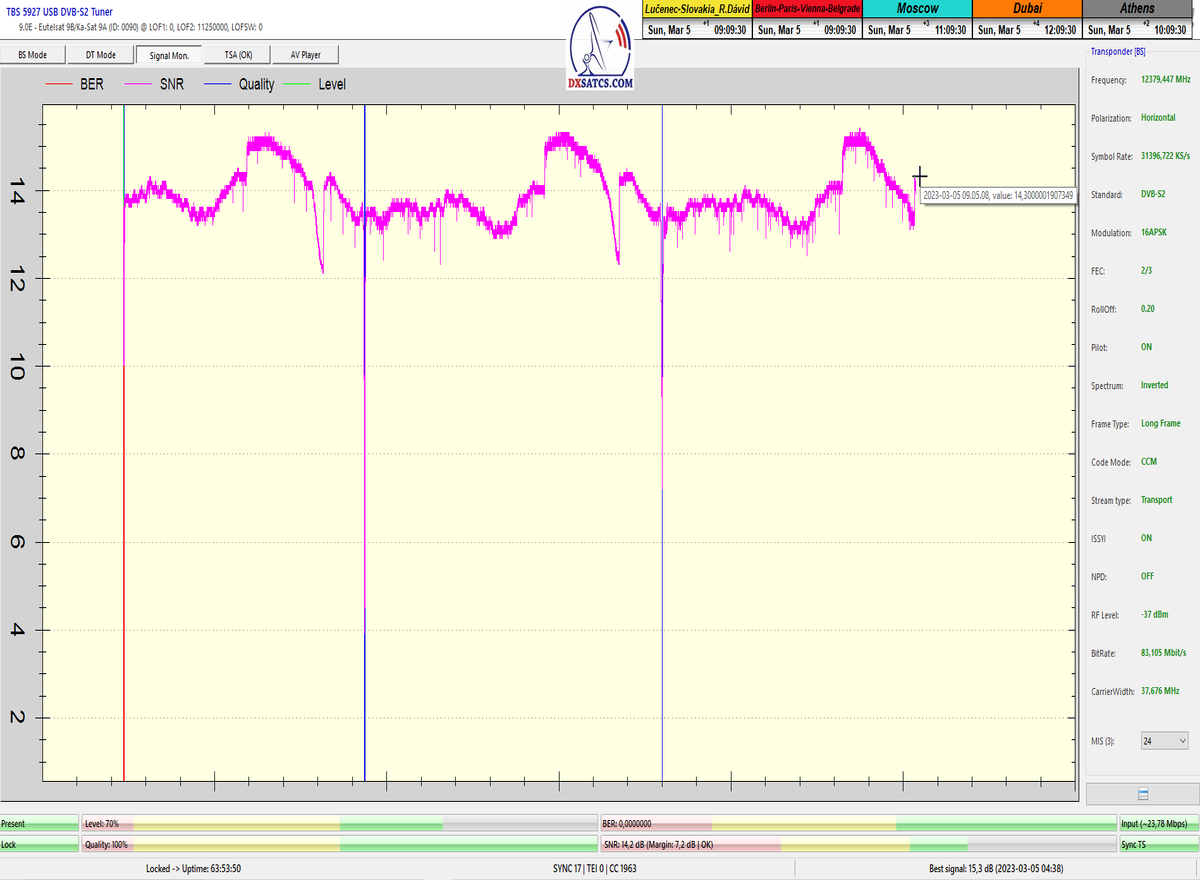 8.2.2023 : Na príklade dokazovania v signálnom monitoringu v dĺžke 1x73 hodín dnes nespochybniteľne dokážem začlenenie frekvencie f=12 188 MHz_V do DTH kategorizácie štandardnej formy konštantne stabilného satelitného príjmu (99,999%) s doteraz najvyššou špičkou kvality okolo SNR=15,8 dB ktorá sa opakuje každý deň.Z technologickej stránky je príjem z TP IT3 výnimočný hlavne tým že veľkosť uhlovej odchýlky SKEW ostáva konštantná aj pri výrazných zmenách v poveternostných podmienkach.Ďalej dnes dokážem plnú stabilitu príjmu v štandarde DVBS2-16APSK-Multistream aj pri intenzívnom snežení dňa 27.1.2023 so stabilnou výškou kvality okolo SNR=14,3 dB atď