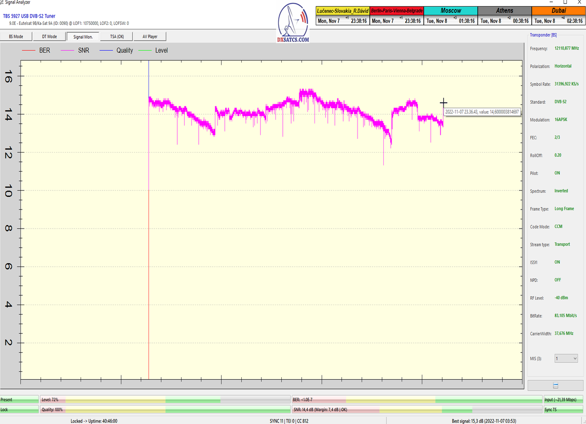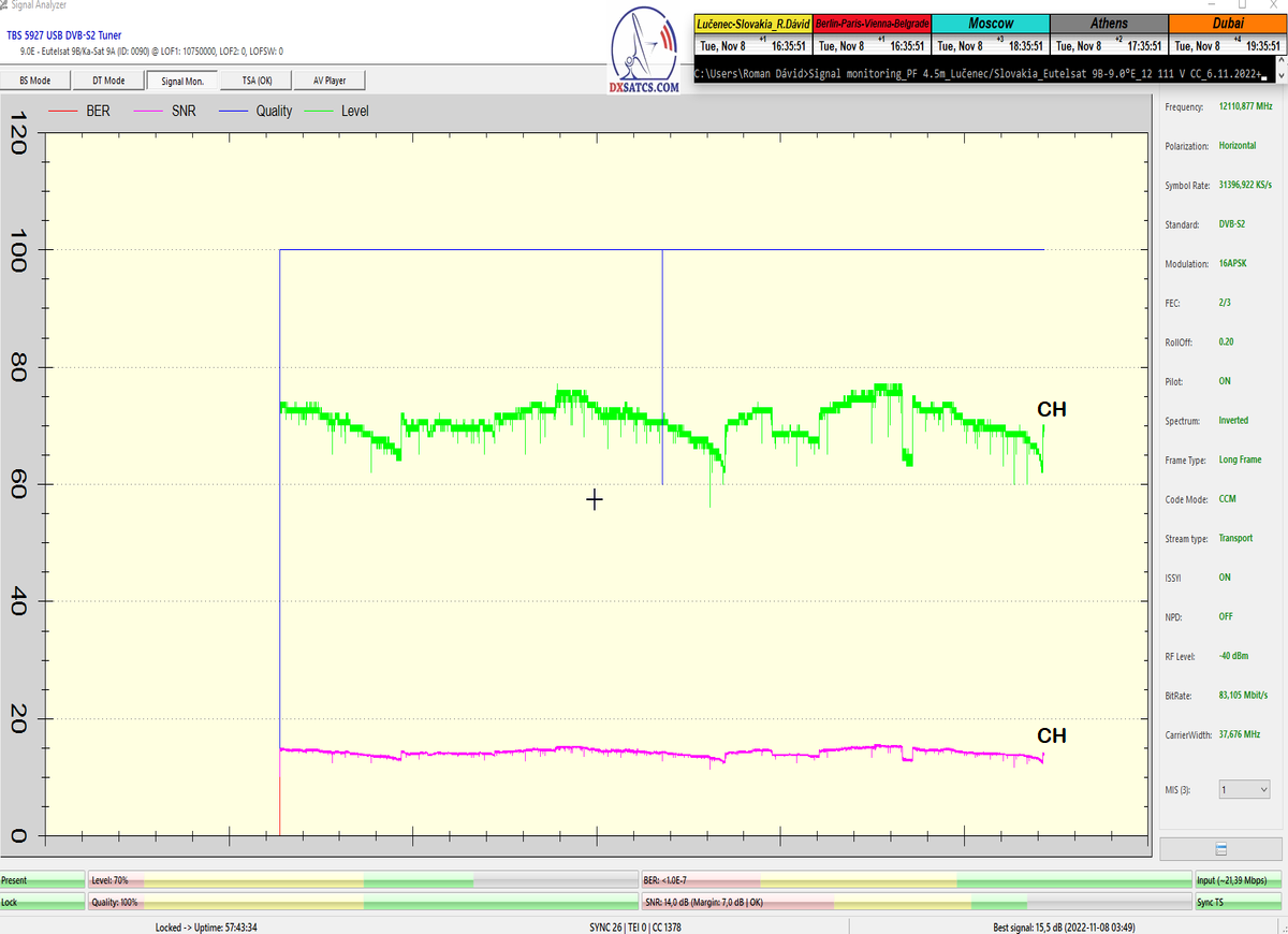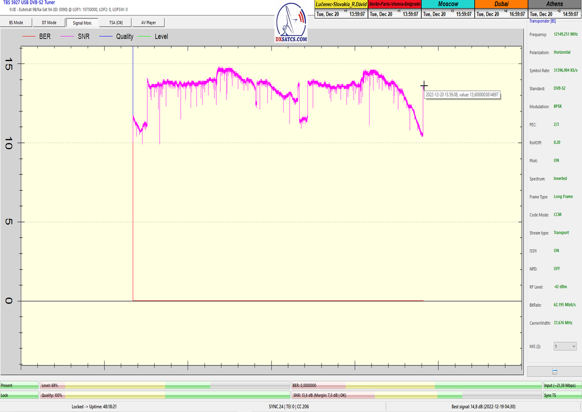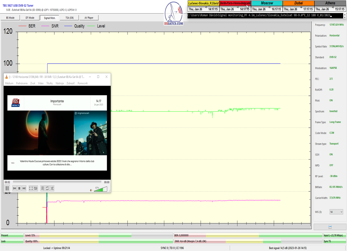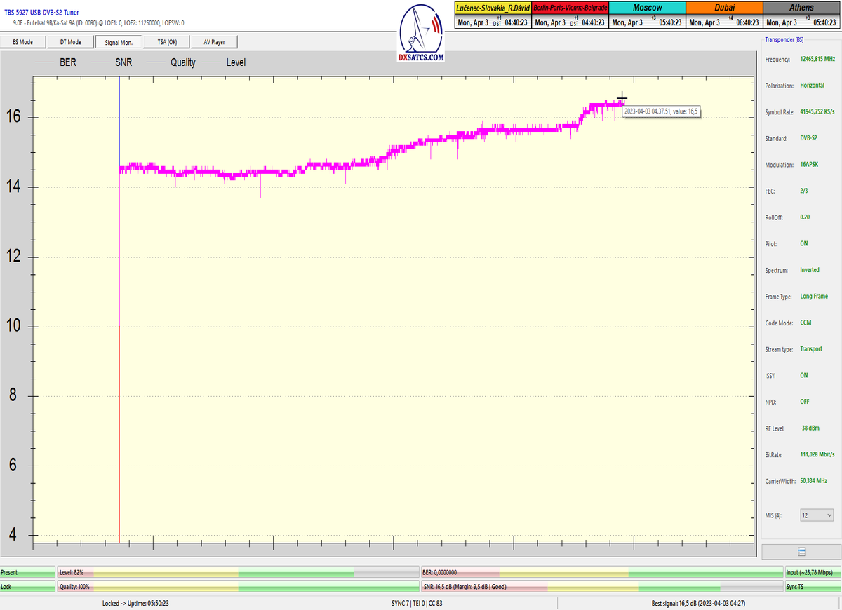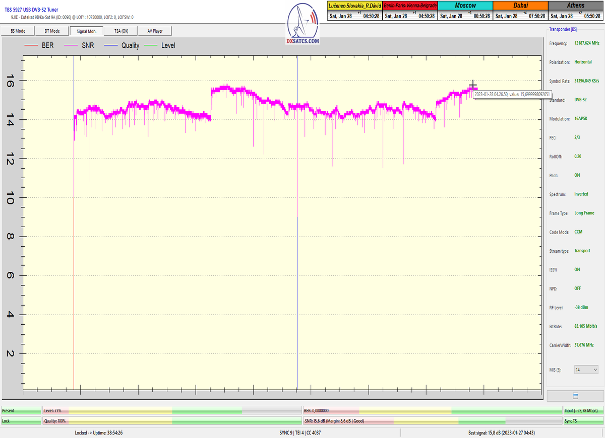 8.2.2023 : Na príklade dokazovania v signálnom monitoringu v dĺžke 1x73 hodín dnes nespochybniteľne dokážem začlenenie frekvencie f=12 188 MHz_V do DTH kategorizácie štandardnej formy konštantne stabilného satelitného príjmu (99,999%) s doteraz najvyššou špičkou kvality okolo SNR=15,8 dB ktorá sa opakuje každý deň.Z technologickej stránky je príjem z TP IT3 výnimočný hlavne tým že veľkosť uhlovej odchýlky SKEW ostáva konštantná aj pri výrazných zmenách v poveternostných podmienkach.Ďalej dnes dokážem plnú stabilitu príjmu v štandarde DVBS2-16APSK-Multistream aj pri intenzívnom snežení dňa 27.1.2023 so stabilnou výškou kvality okolo SNR=14,3 dB atď