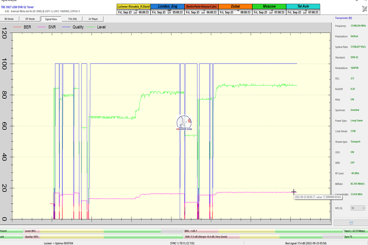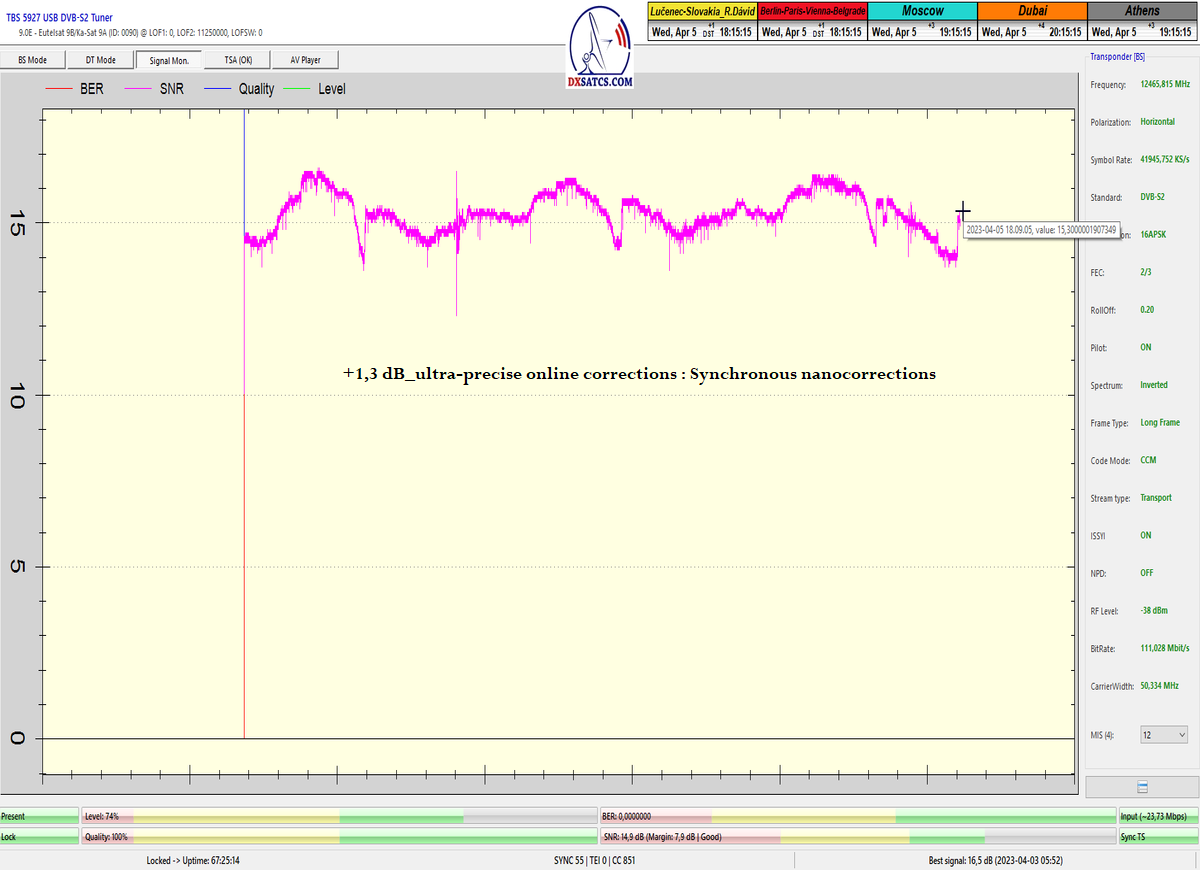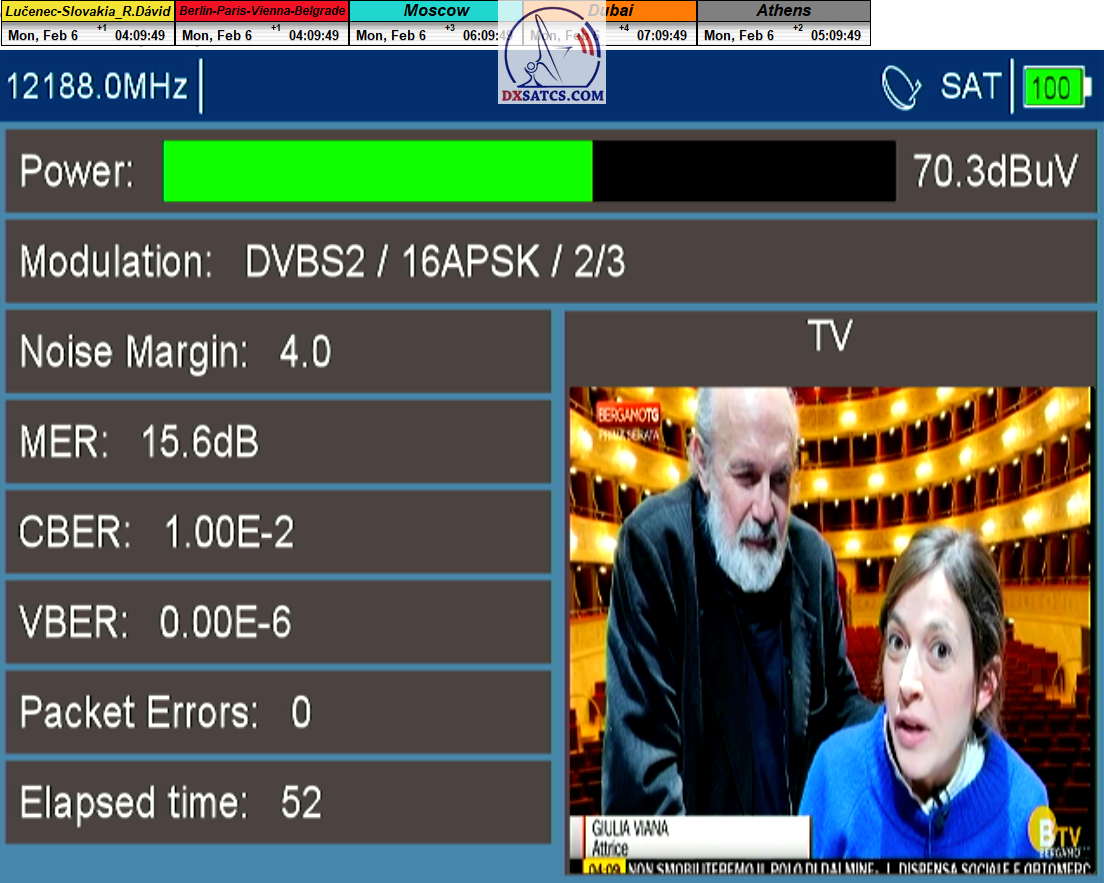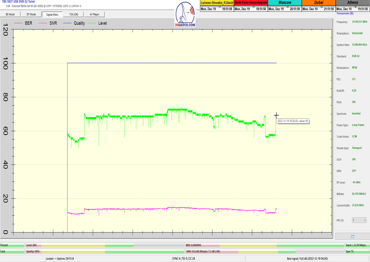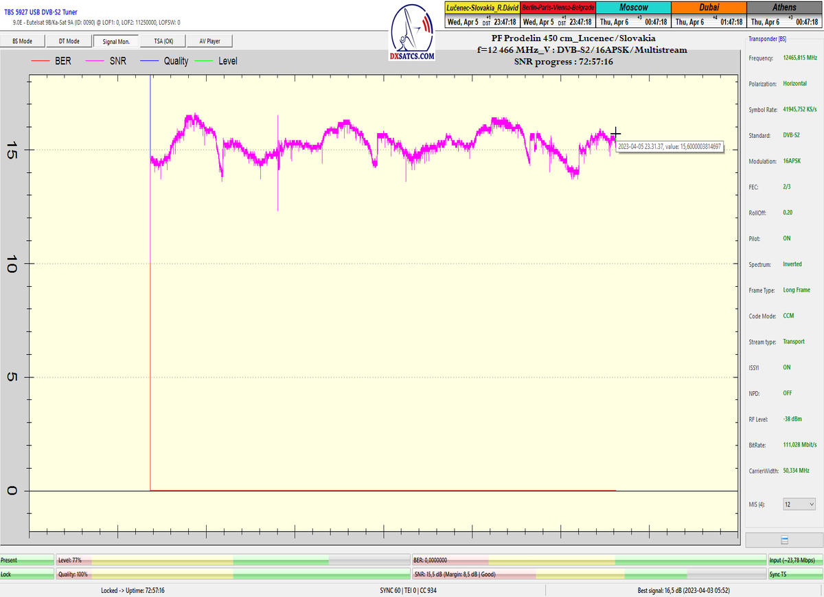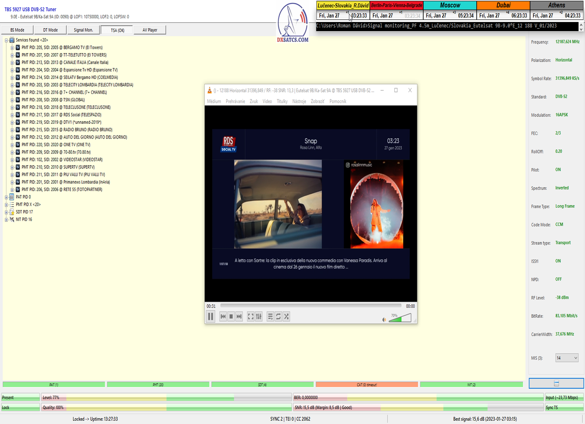 8.2.2023 : Na príklade dokazovania v signálnom monitoringu v dĺžke 1x73 hodín dnes nespochybniteľne dokážem začlenenie frekvencie f=12 188 MHz_V do DTH kategorizácie štandardnej formy konštantne stabilného satelitného príjmu (99,999%) s doteraz najvyššou špičkou kvality okolo SNR=15,8 dB ktorá sa opakuje každý deň.Z technologickej stránky je príjem z TP IT3 výnimočný hlavne tým že veľkosť uhlovej odchýlky SKEW ostáva konštantná aj pri výrazných zmenách v poveternostných podmienkach.Ďalej dnes dokážem plnú stabilitu príjmu v štandarde DVBS2-16APSK-Multistream aj pri intenzívnom snežení dňa 27.1.2023 so stabilnou výškou kvality okolo SNR=14,3 dB atď