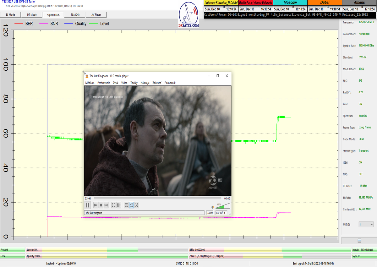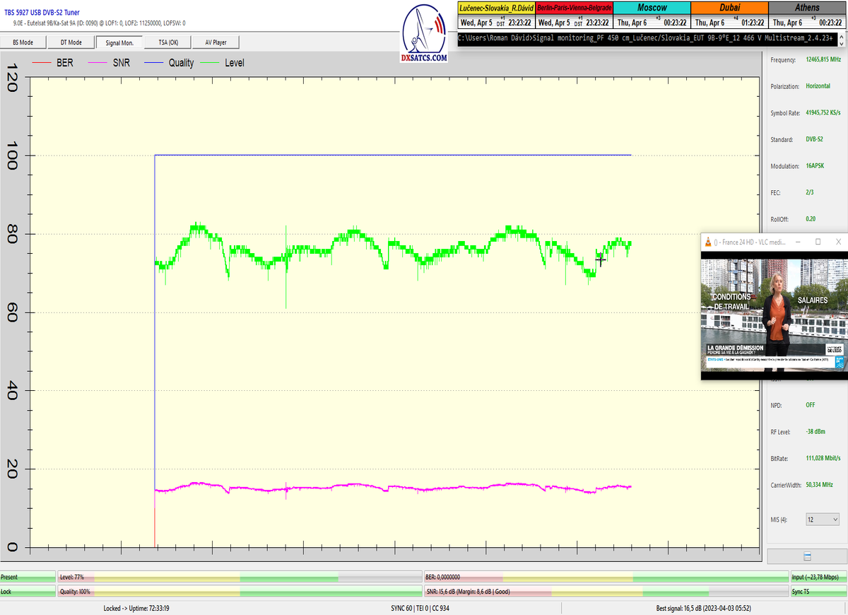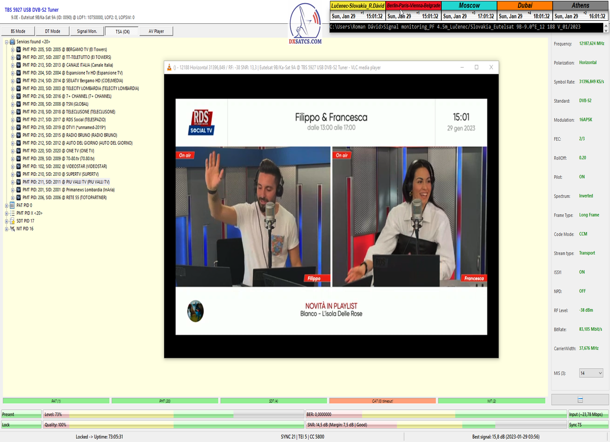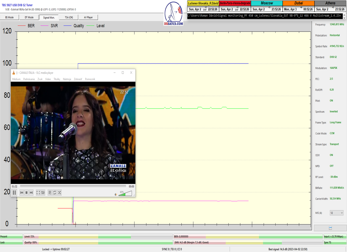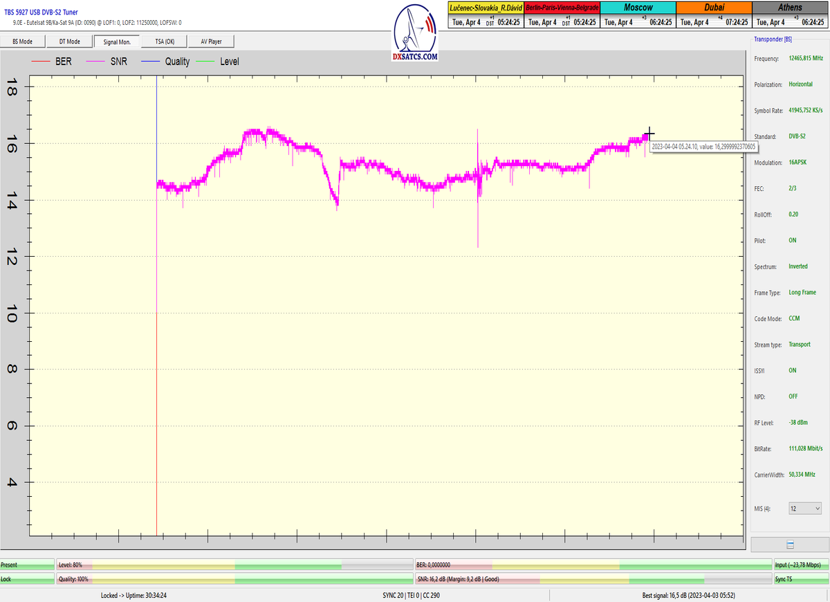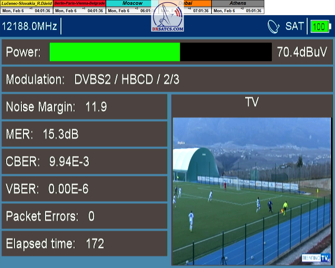 8.2.2023 : Na príklade dokazovania v signálnom monitoringu v dĺžke 1x73 hodín dnes nespochybniteľne dokážem začlenenie frekvencie f=12 188 MHz_V do DTH kategorizácie štandardnej formy konštantne stabilného satelitného príjmu (99,999%) s doteraz najvyššou špičkou kvality okolo SNR=15,8 dB ktorá sa opakuje každý deň.Z technologickej stránky je príjem z TP IT3 výnimočný hlavne tým že veľkosť uhlovej odchýlky SKEW ostáva konštantná aj pri výrazných zmenách v poveternostných podmienkach.Ďalej dnes dokážem plnú stabilitu príjmu v štandarde DVBS2-16APSK-Multistream aj pri intenzívnom snežení dňa 27.1.2023 so stabilnou výškou kvality okolo SNR=14,3 dB atď