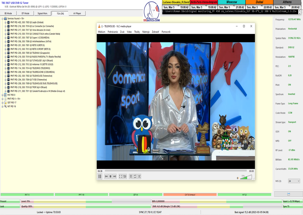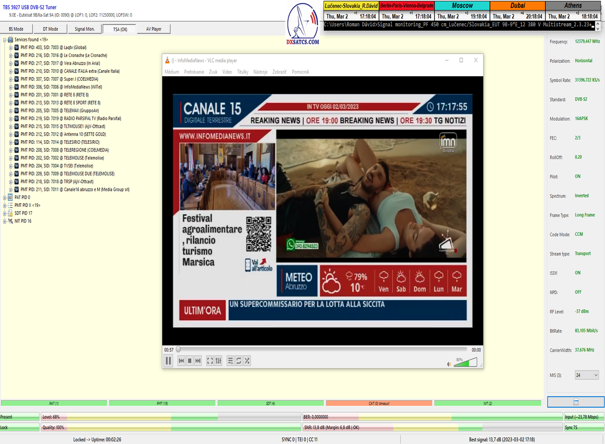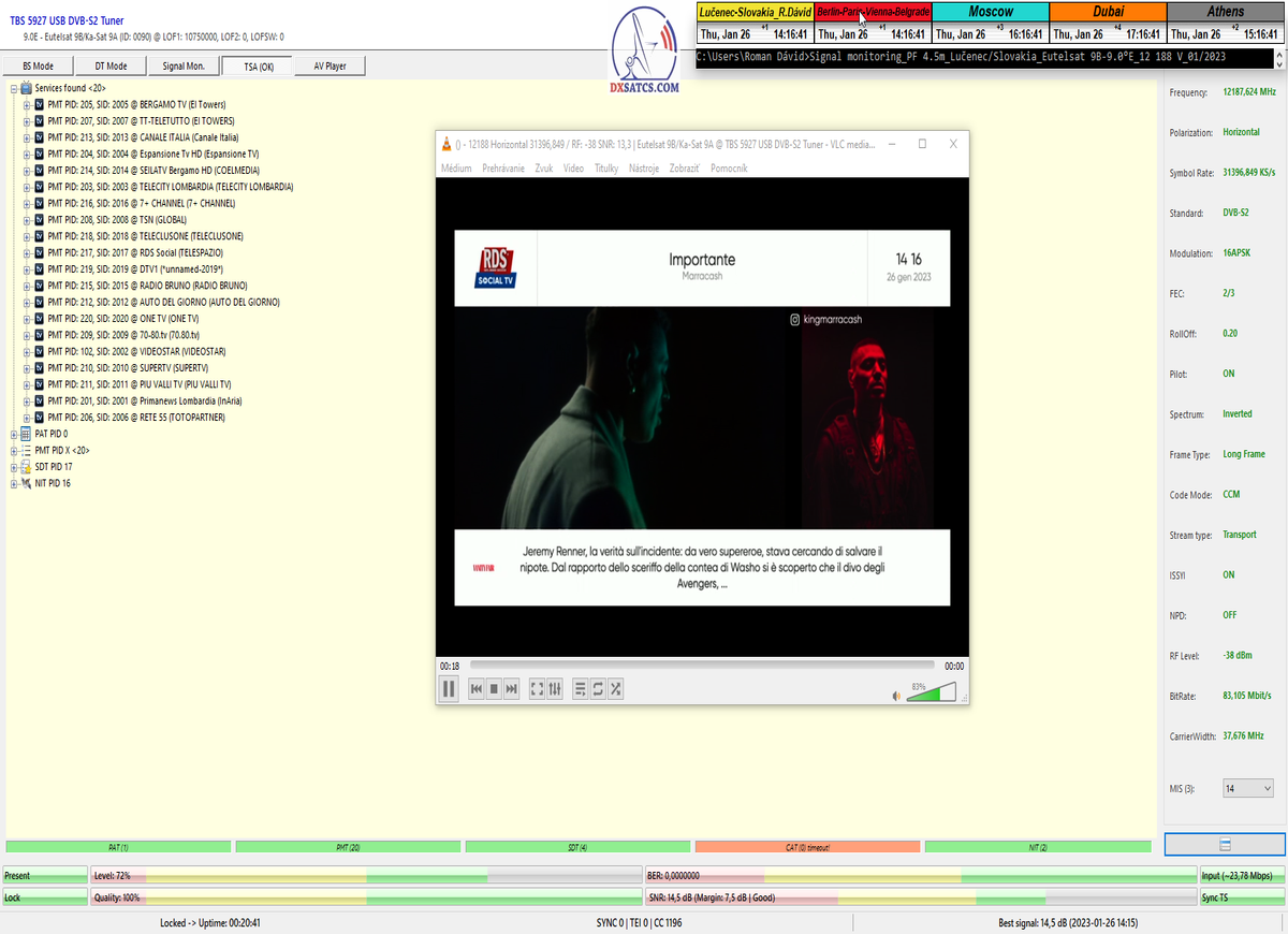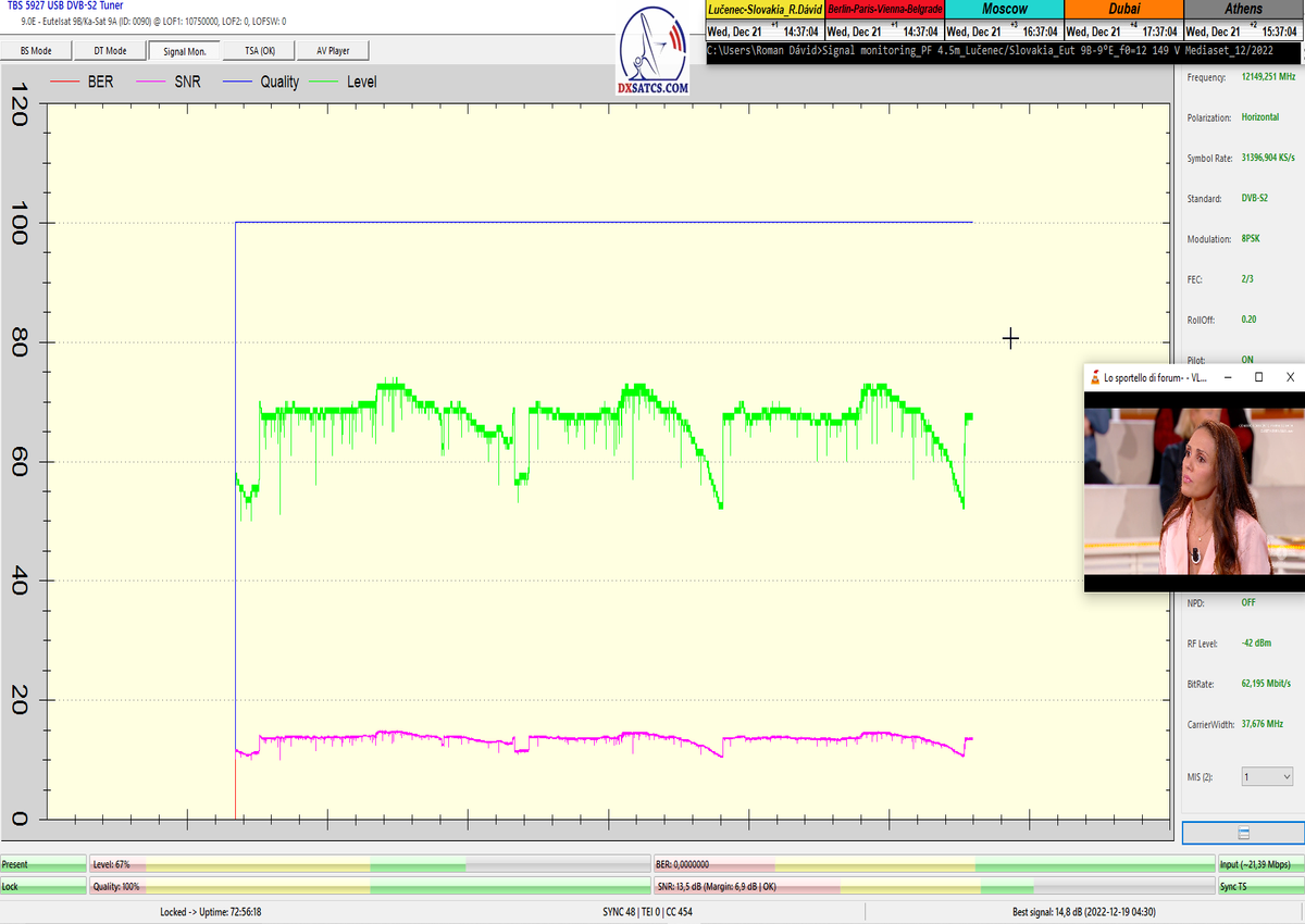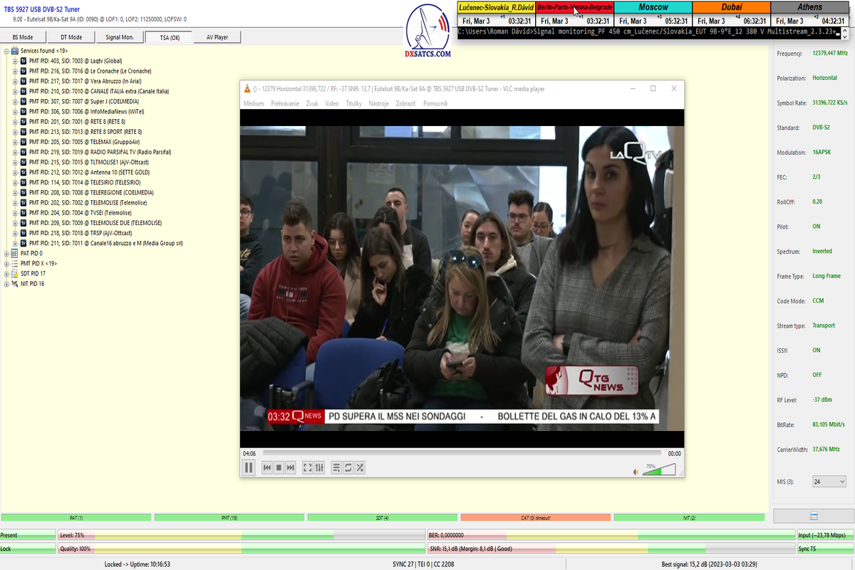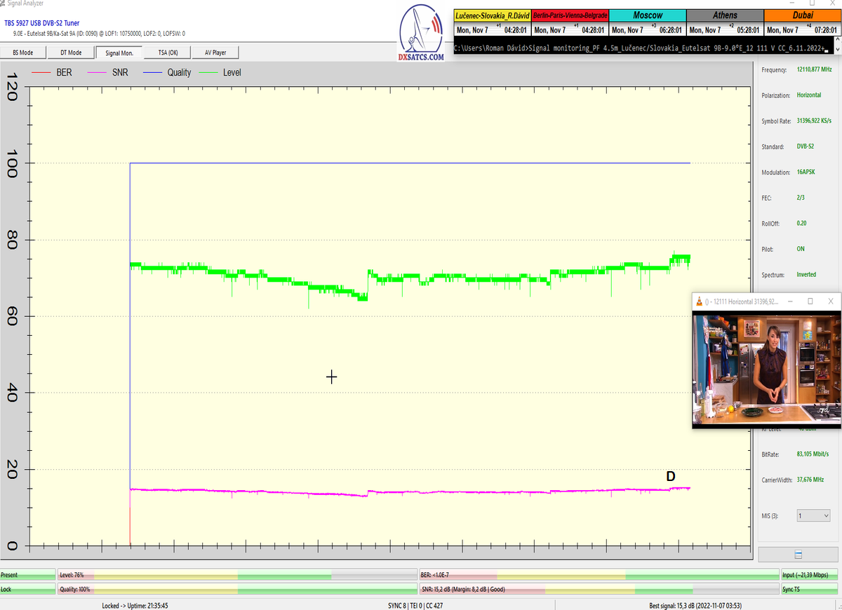 8.2.2023 : Na príklade dokazovania v signálnom monitoringu v dĺžke 1x73 hodín dnes nespochybniteľne dokážem začlenenie frekvencie f=12 188 MHz_V do DTH kategorizácie štandardnej formy konštantne stabilného satelitného príjmu (99,999%) s doteraz najvyššou špičkou kvality okolo SNR=15,8 dB ktorá sa opakuje každý deň.Z technologickej stránky je príjem z TP IT3 výnimočný hlavne tým že veľkosť uhlovej odchýlky SKEW ostáva konštantná aj pri výrazných zmenách v poveternostných podmienkach.Ďalej dnes dokážem plnú stabilitu príjmu v štandarde DVBS2-16APSK-Multistream aj pri intenzívnom snežení dňa 27.1.2023 so stabilnou výškou kvality okolo SNR=14,3 dB atď