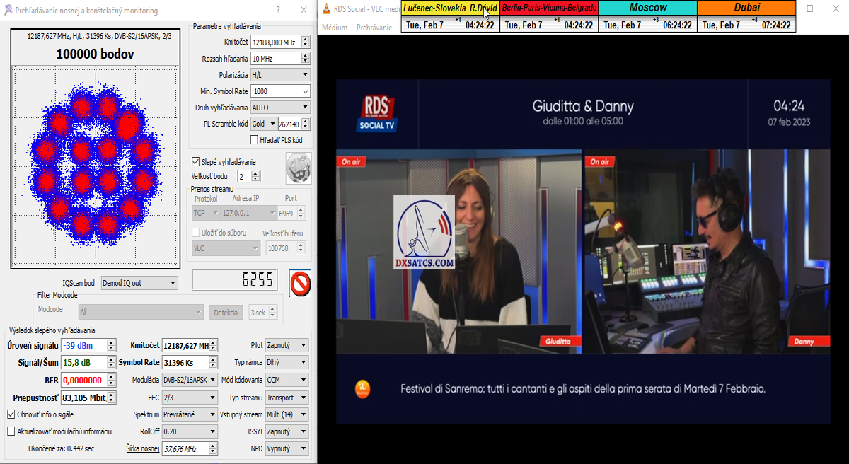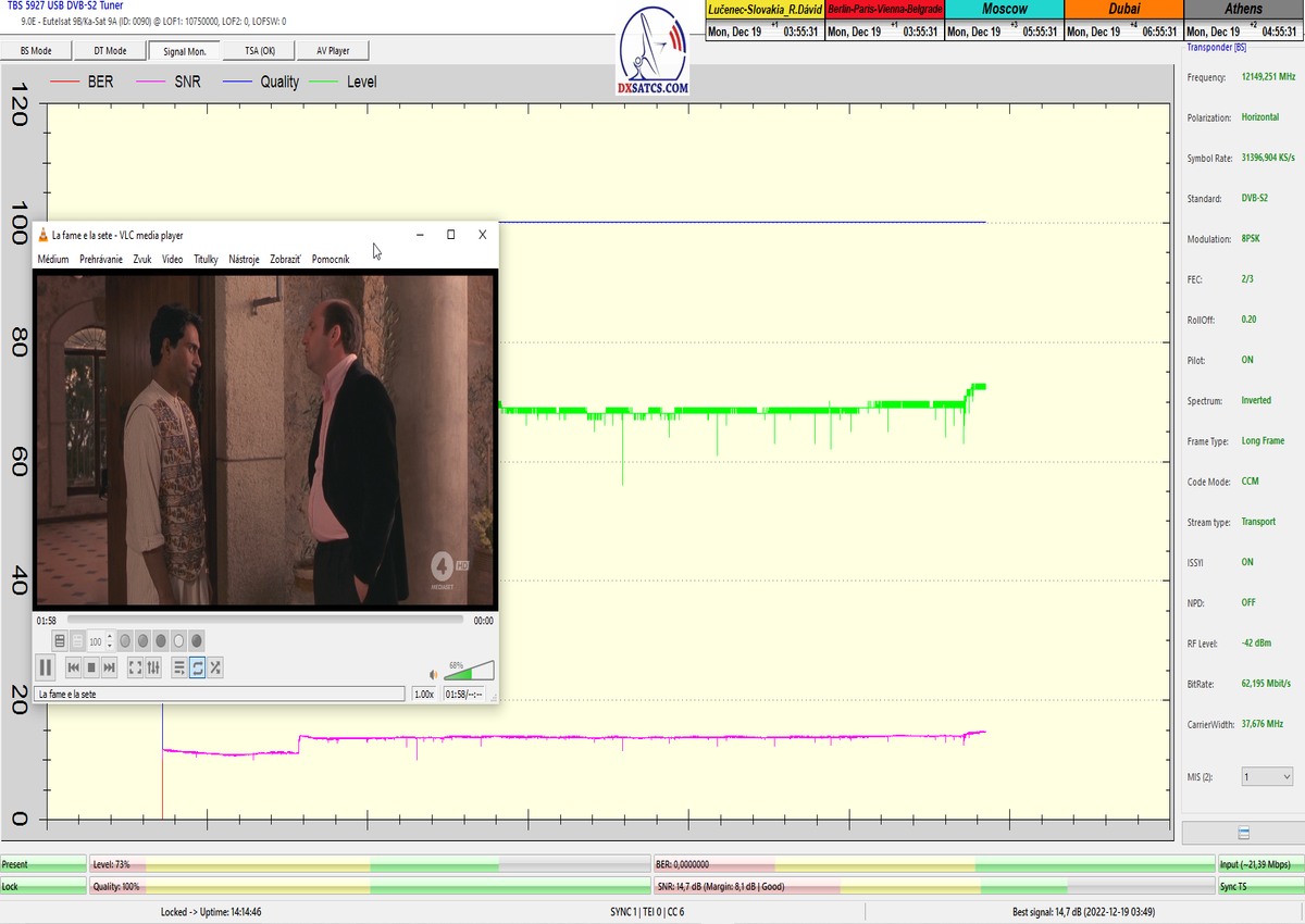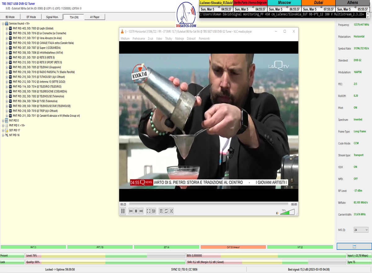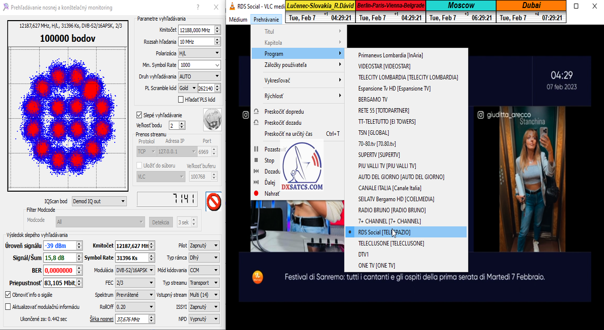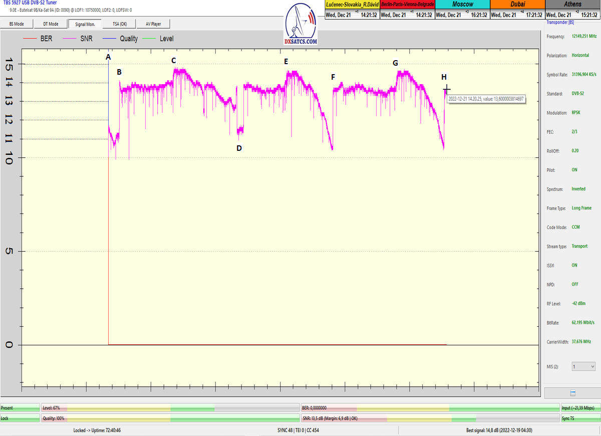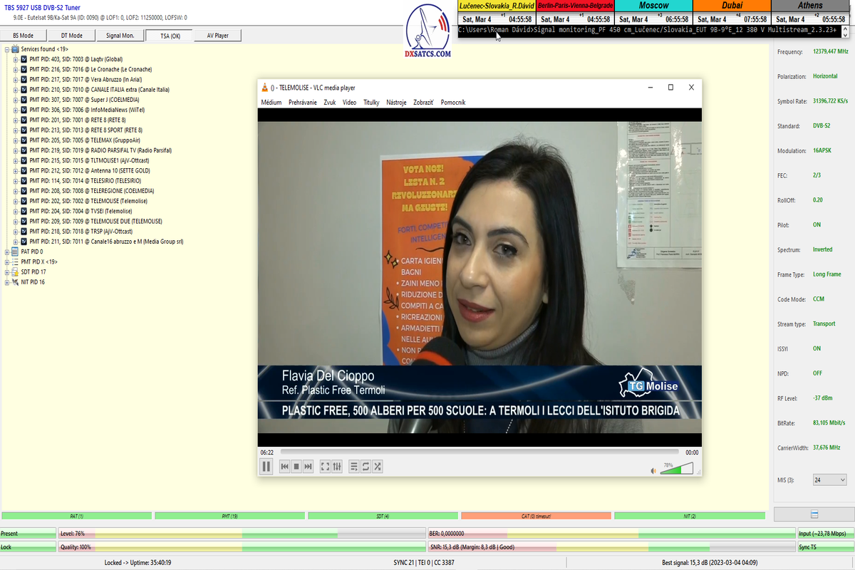 8.2.2023 : Na príklade dokazovania v signálnom monitoringu v dĺžke 1x73 hodín dnes nespochybniteľne dokážem začlenenie frekvencie f=12 188 MHz_V do DTH kategorizácie štandardnej formy konštantne stabilného satelitného príjmu (99,999%) s doteraz najvyššou špičkou kvality okolo SNR=15,8 dB ktorá sa opakuje každý deň.Z technologickej stránky je príjem z TP IT3 výnimočný hlavne tým že veľkosť uhlovej odchýlky SKEW ostáva konštantná aj pri výrazných zmenách v poveternostných podmienkach.Ďalej dnes dokážem plnú stabilitu príjmu v štandarde DVBS2-16APSK-Multistream aj pri intenzívnom snežení dňa 27.1.2023 so stabilnou výškou kvality okolo SNR=14,3 dB atď