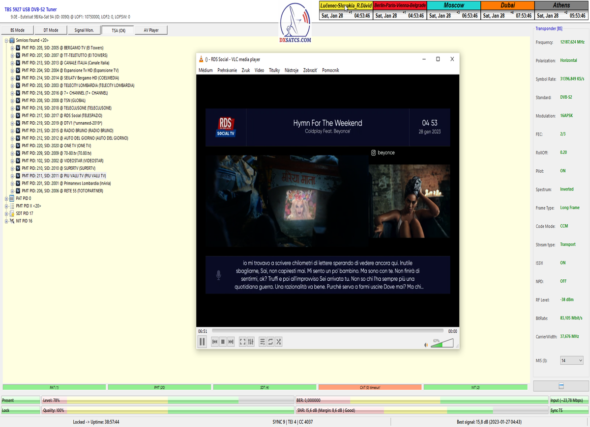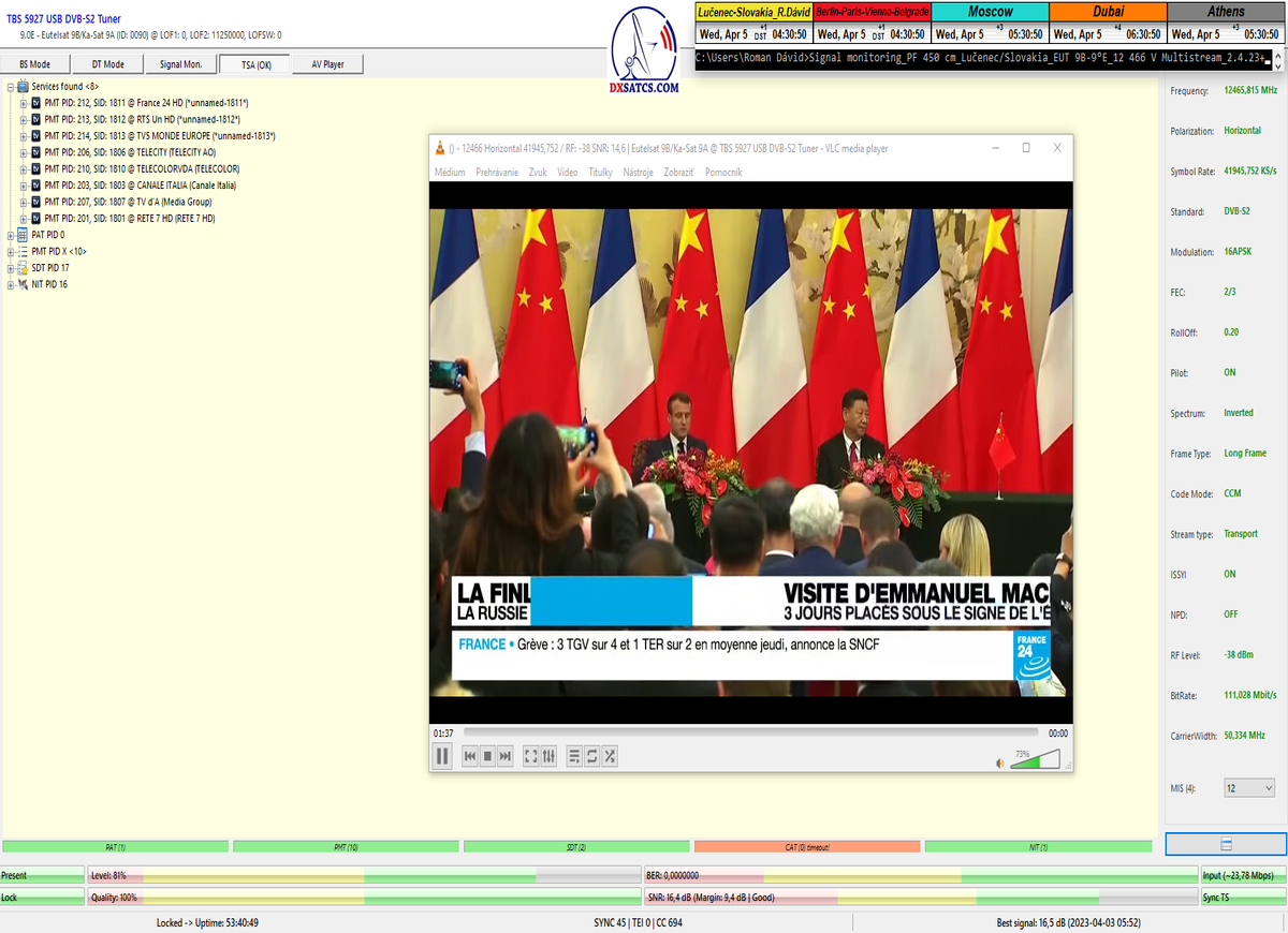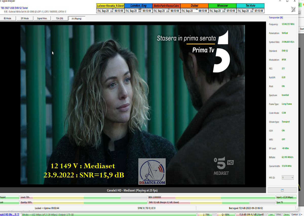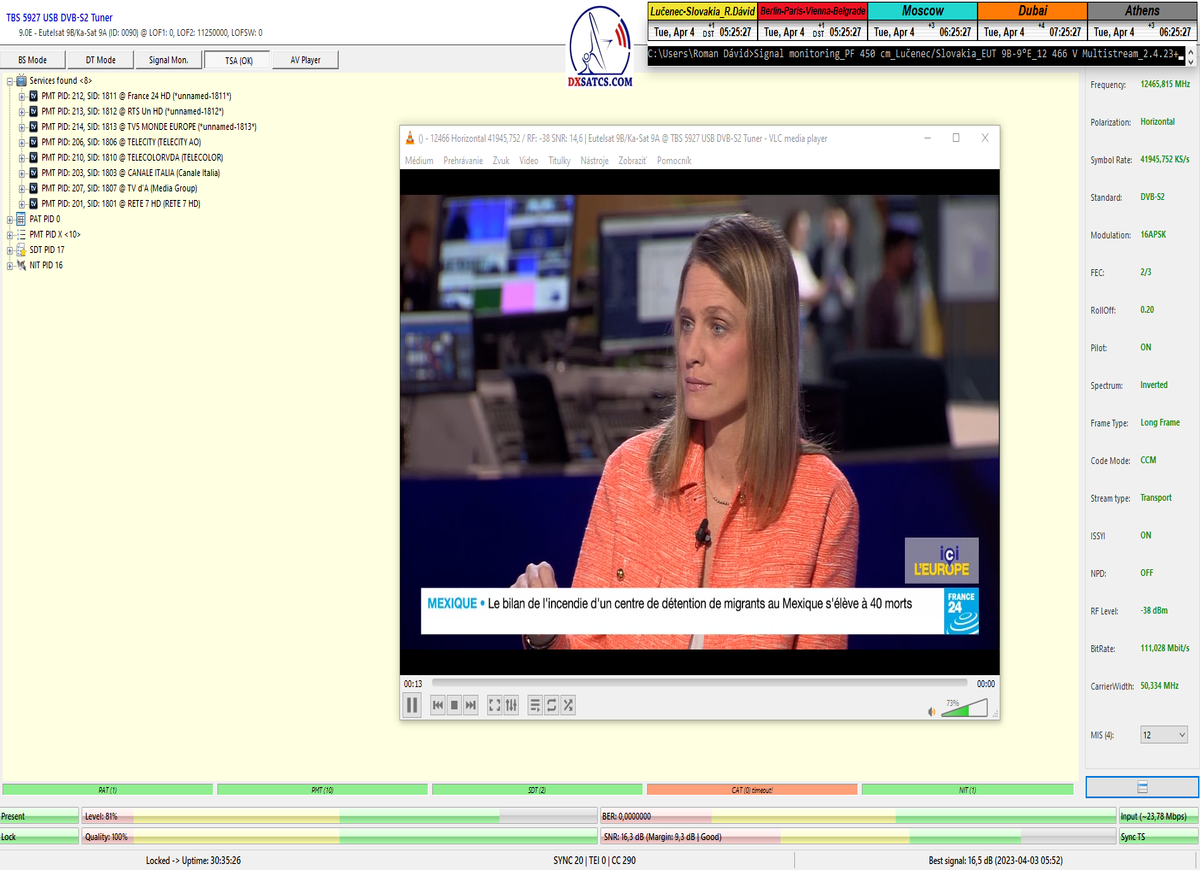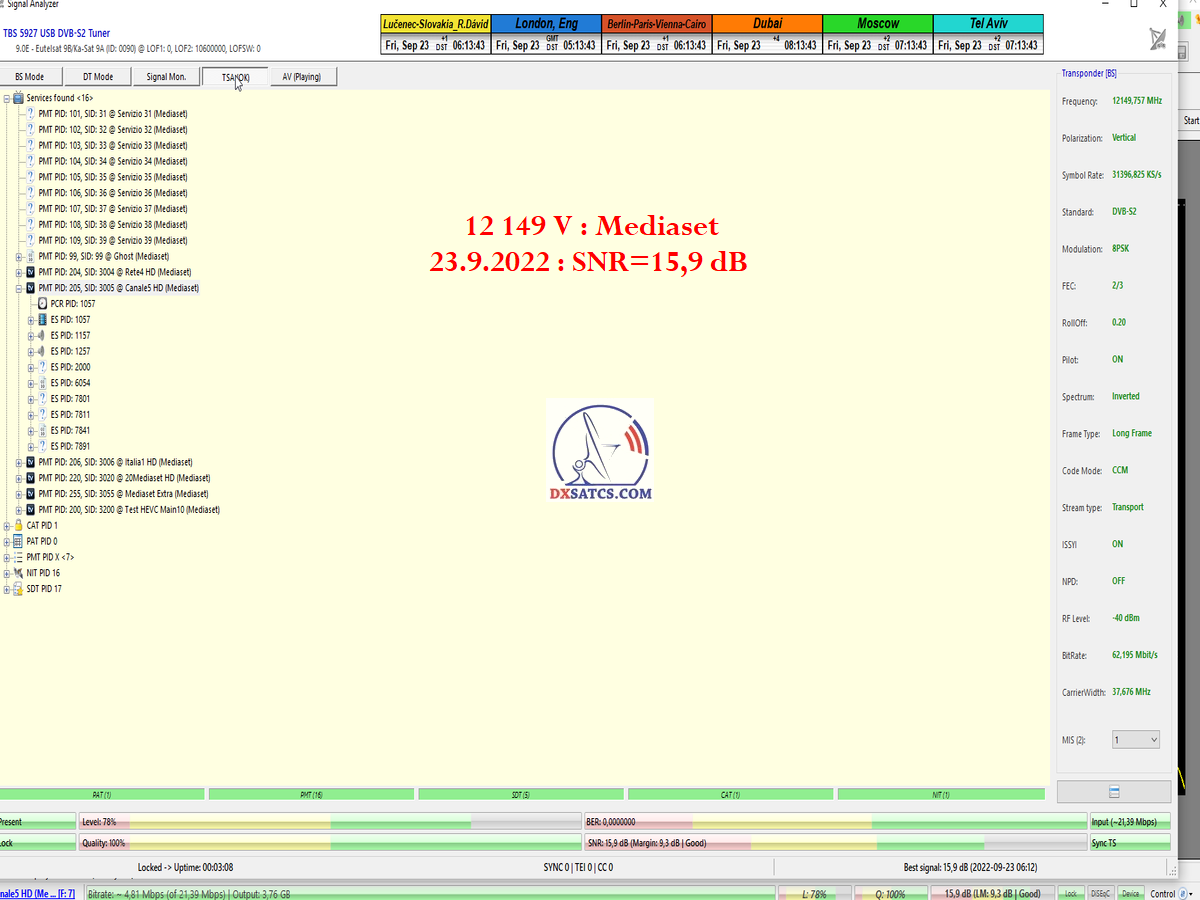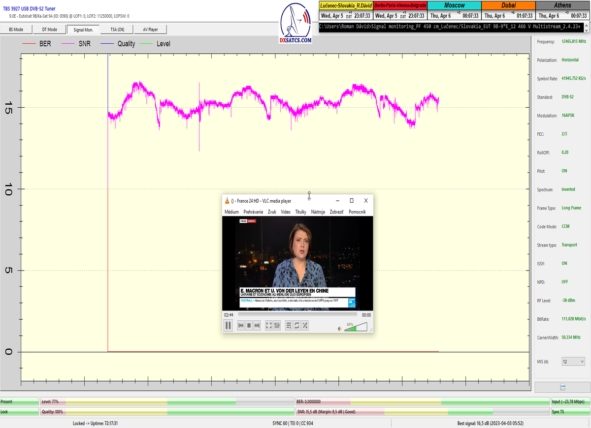 8.2.2023 : Na príklade dokazovania v signálnom monitoringu v dĺžke 1x73 hodín dnes nespochybniteľne dokážem začlenenie frekvencie f=12 188 MHz_V do DTH kategorizácie štandardnej formy konštantne stabilného satelitného príjmu (99,999%) s doteraz najvyššou špičkou kvality okolo SNR=15,8 dB ktorá sa opakuje každý deň.Z technologickej stránky je príjem z TP IT3 výnimočný hlavne tým že veľkosť uhlovej odchýlky SKEW ostáva konštantná aj pri výrazných zmenách v poveternostných podmienkach.Ďalej dnes dokážem plnú stabilitu príjmu v štandarde DVBS2-16APSK-Multistream aj pri intenzívnom snežení dňa 27.1.2023 so stabilnou výškou kvality okolo SNR=14,3 dB atď