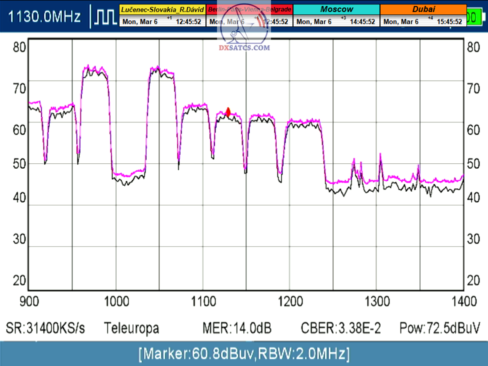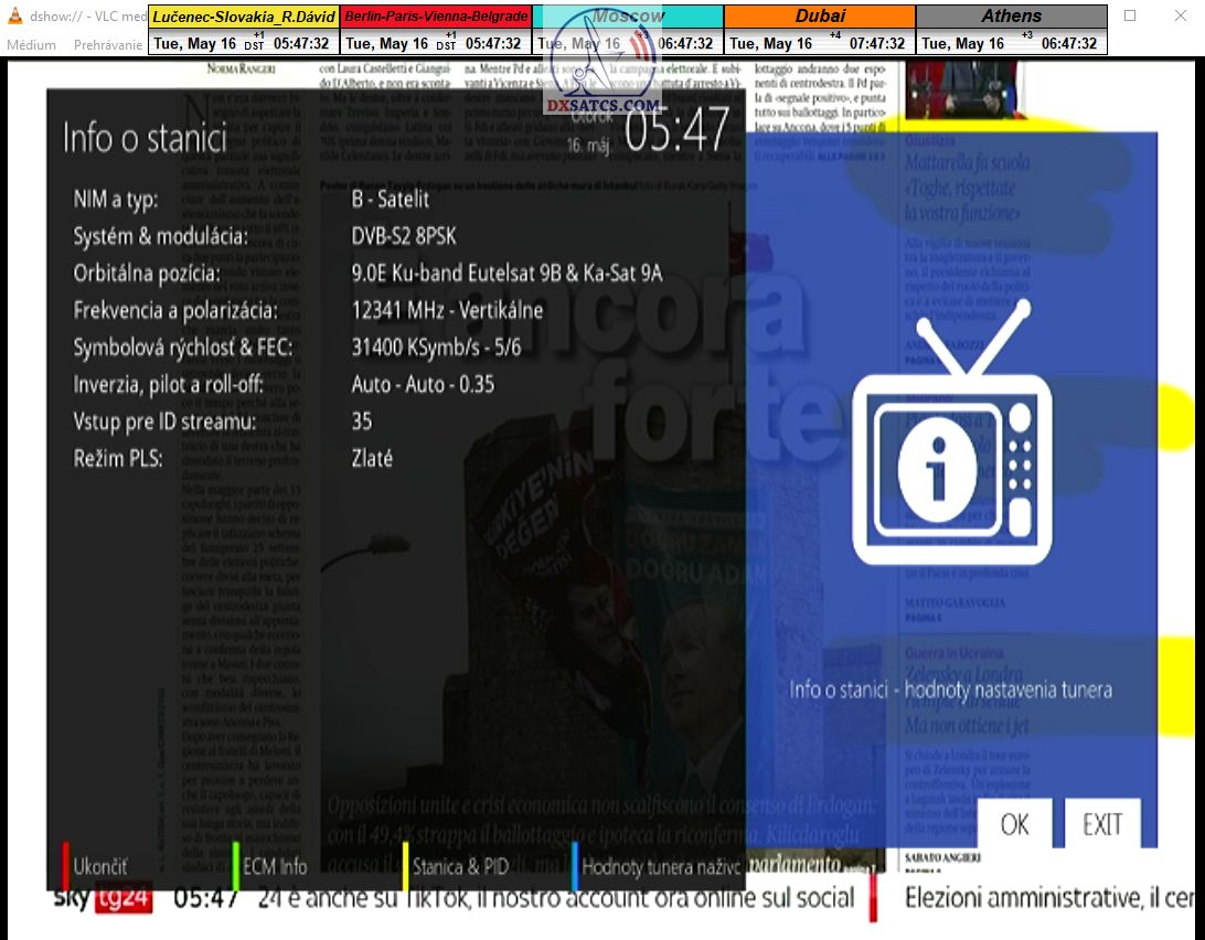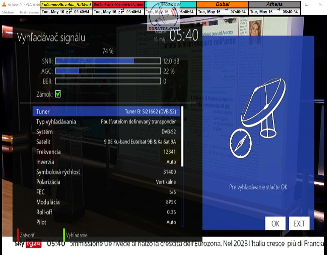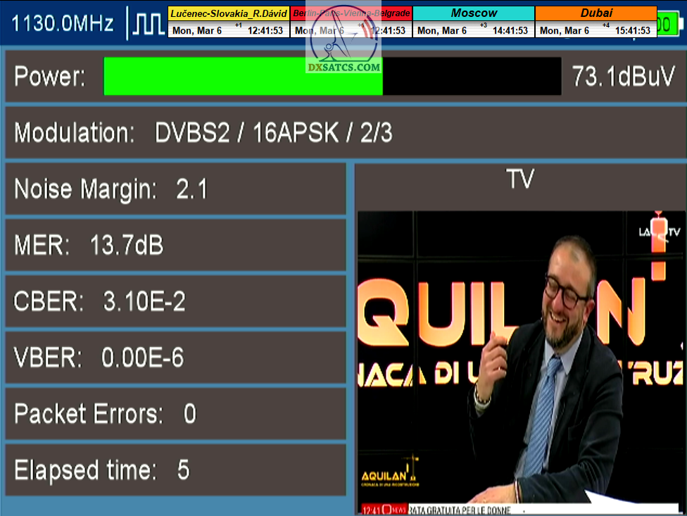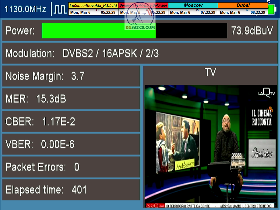 s verifikáciou stredoeurópskeho času v TV vysielaní,napríklad v SKY TG24,pretože to je dôkazom o reálnosti signálnej kvality,ktorú som v meste Lučenec dosiahol.Ak by niekto spochybňoval hladiny SNR zo samotného SW EBSpro,potom na dôkaz vyvrátenia týchto pochybností ponúkam ďalšie 3 signálne zdroje ako napríklad analyzátor Metek HD,4K receiver Octagon,SW CrazyScan a pochybnosti všetkého druhu sú razom blízke alebo rovné NULE. Ospravedlňujem sa za môj slovník určený pre publikum s určitou mierou "mentálnej invalidity alebo mentálneho postihnutia",ale občas je vhodné zopakovať si aj elementárnu abecedu,pretože  nie každý čitateľ pochádza z odbornej alebo vedeckej sféry a moje vysvetlenie smerujem aj do radov takzvaných