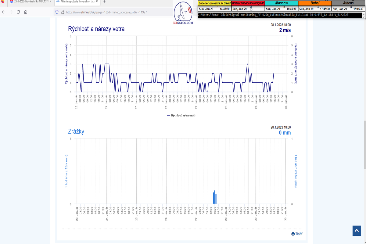 -štart signálneho monitoringu : SNR=14,8 dB -          - poveternostné podmienky pri štarte : dážď -          -aktuálne údaje : úhrn zrážok a rýchlosť vetra-