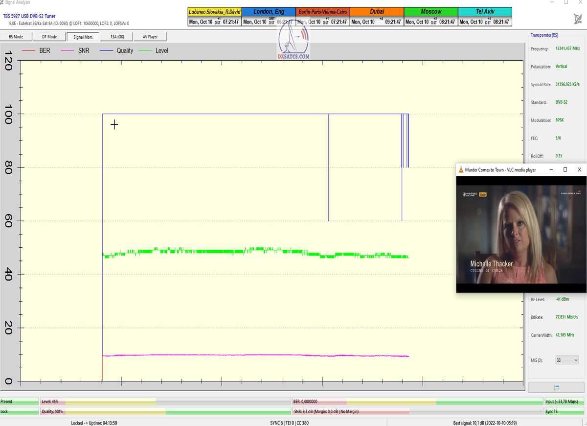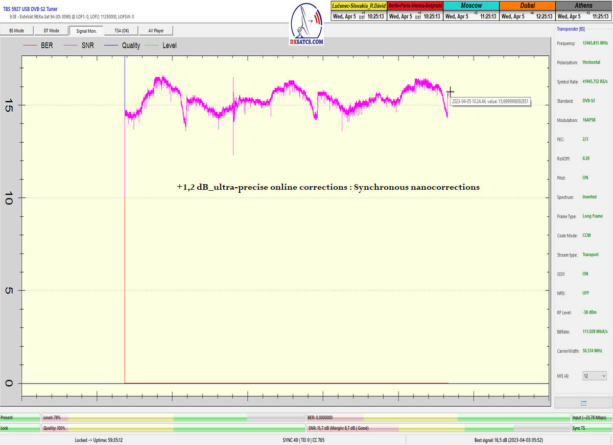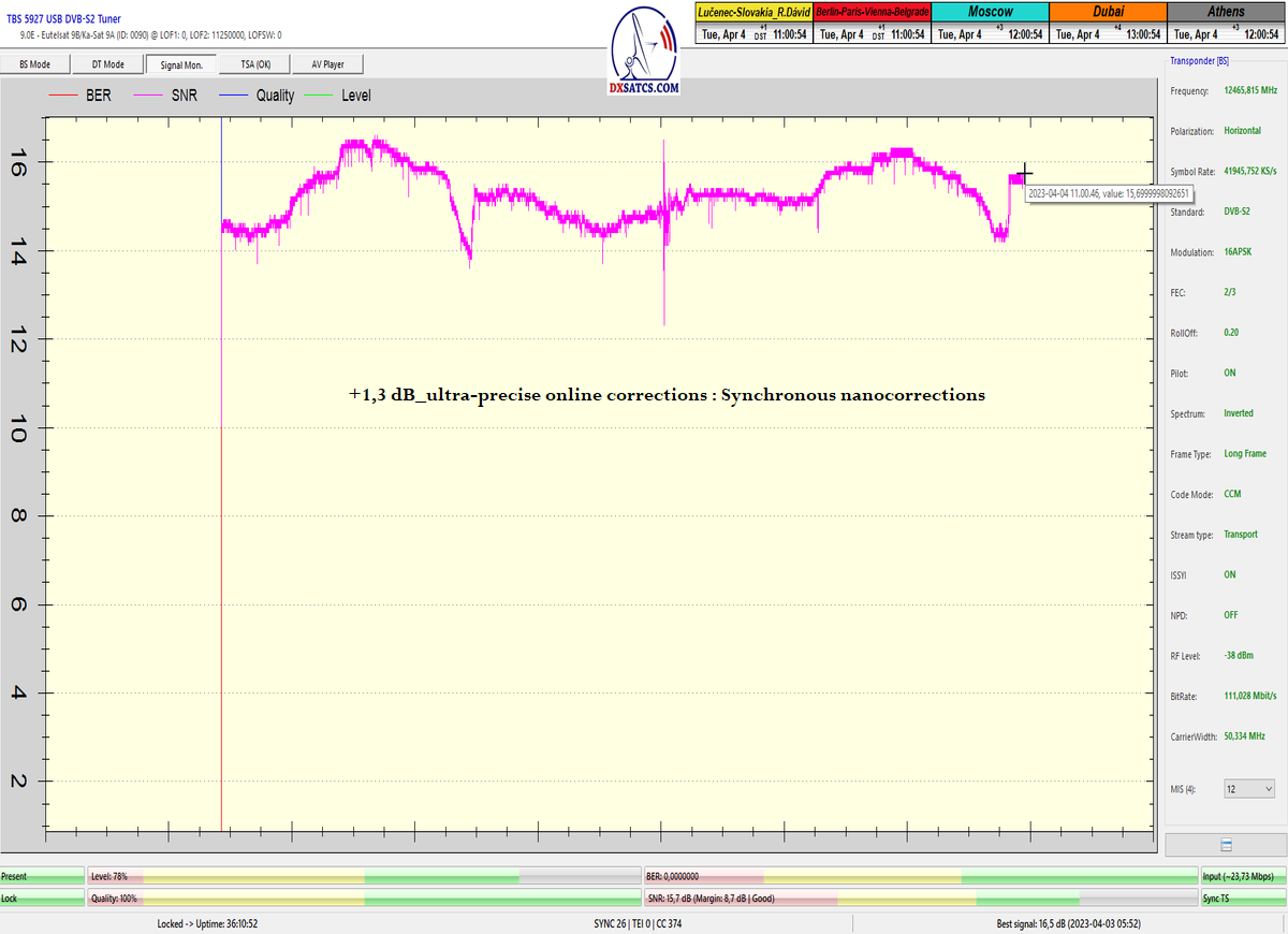 Dosiahol som nestabilný alebo z hľadiska dĺžky 24 hodín nekontinuálny priebeh LOCKU,ktorý pozostáva z dokázateľne jedného signálneho okna, ktoré je každodenne "otvorené" v minimálnej dĺžke 12 hodín od približne 01:15 do 13:30 CET,v ktorom som dokázateľne alebo inak tri dni po sebe,dosiahol plne stabilnú formu príjmu bez výpadkov a pixelácií klasifikovanú tvrdením : stabilný na 99,999-100%.