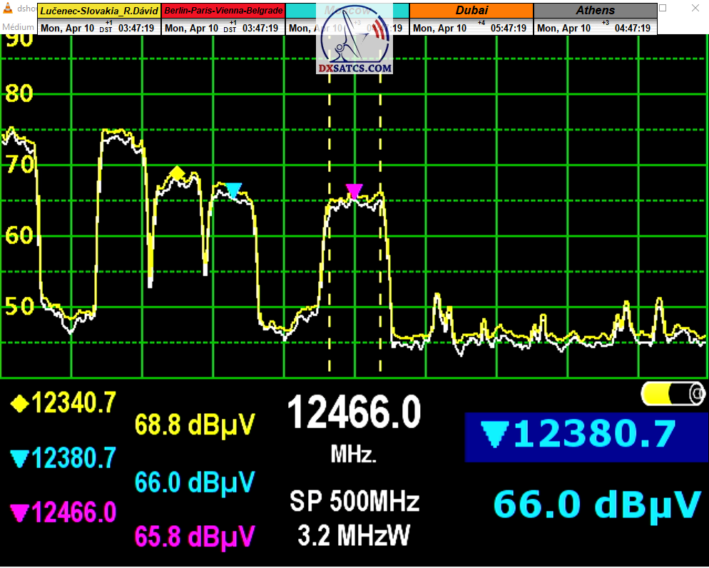 Na základe výsledkov signálneho monitoringu okamžitých zmien výkonu a kvality v mieste meraní pre aplikovaný technologický štandard vysielania DVB-S2/Multistream na frekvencii f=12 341 MHz_V talianskeho provajdera Persidera S.p.A. Vám dnes nespochybniteľne dokážem pravdivosť mojich tvrdení o existencii dvoch výkonových modusov v zónach príjmu "Mimo stopy",alebo "Out of footprint",konkrétne Jeseň/Zima a Jar/Leto.Modus Jar/Leto sa demonštruje nie len v násobne dlhšej hodinovej kvantite možnosti stabilného príjmu bez pixelácie a výpadkov z f=12 341 MHz_V, ale aj v samotnej výške špičky kvality SNR.