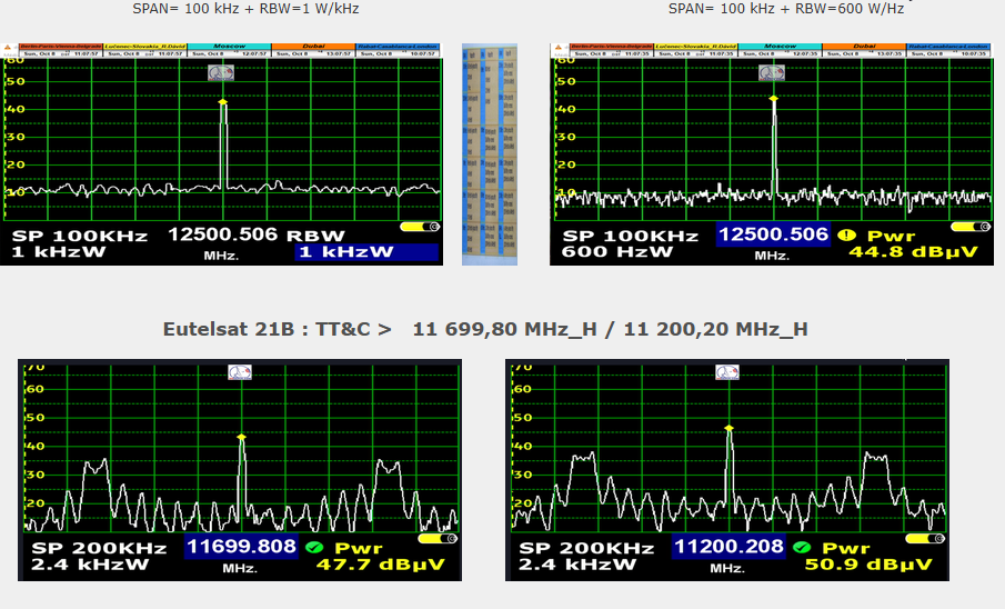 ►Dôkaz o frekvenčnej odchýlke alebo podladení od 190 do 201 kHz,ktoré platí pre HW/SW konfiguráciu TBS 5927 & EBSpro a je jasne demonštrovaná na každej rádio nosnej s ultra nízkou šírkou pásma nosnej. TBS 5927/EBSpro : Locking frequency 11 599.337>11 599,338 and Downlink frequency : 11 599.530 MHz