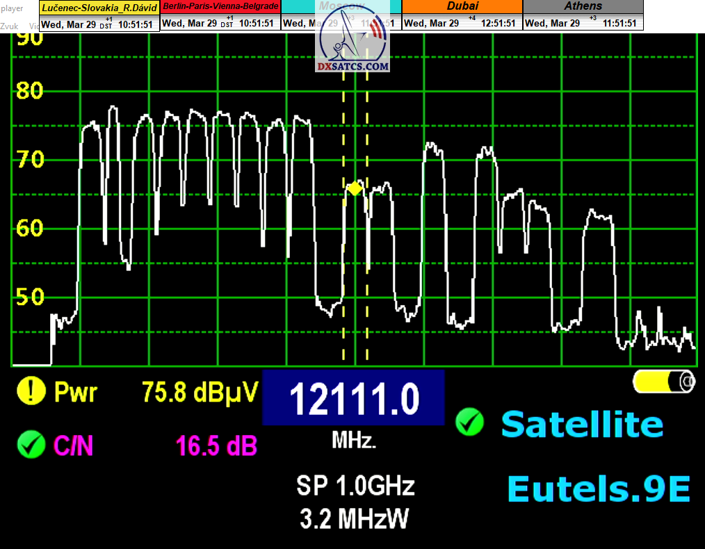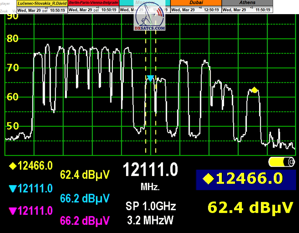 Synopsia :  Dnešná analýza frekvenčného spektra vykonaná o 11:08 SEČ  družice Eutelsat 9B na 9.0°E v rozpätí od 12 111 do 12 466 MHz