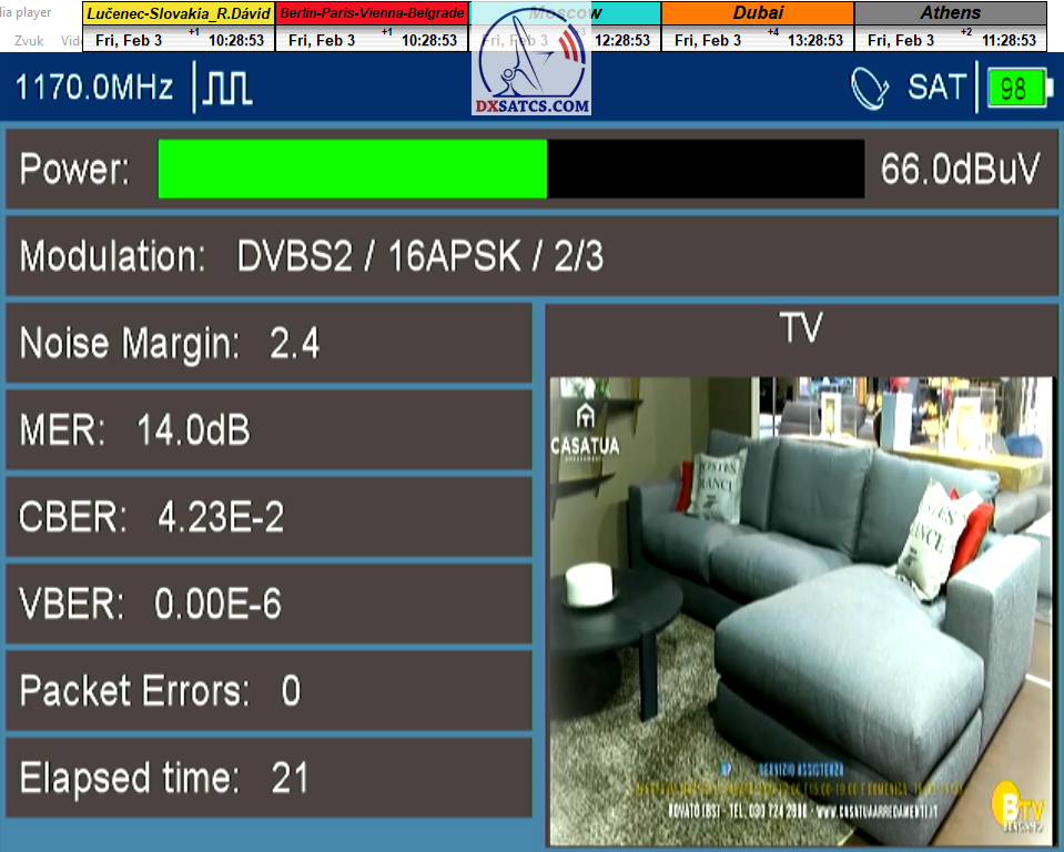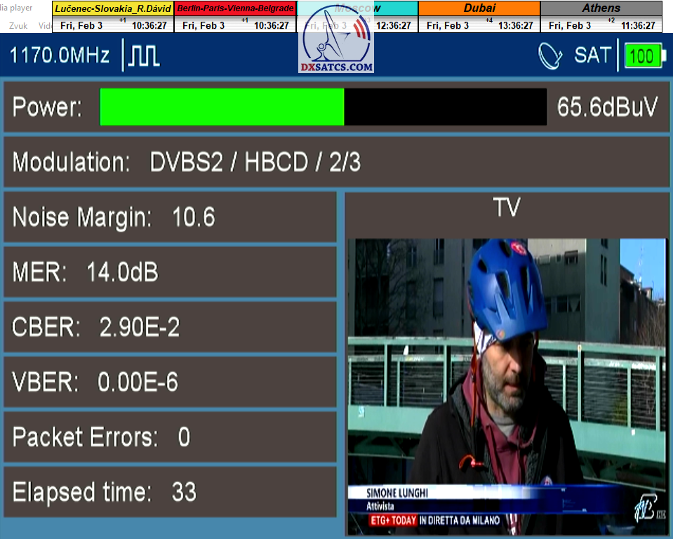 >DVB-S2/MULTISTREAM ANALYZÁTOR METEK HD : MER=13,3 dB dnes 1.2.2023<