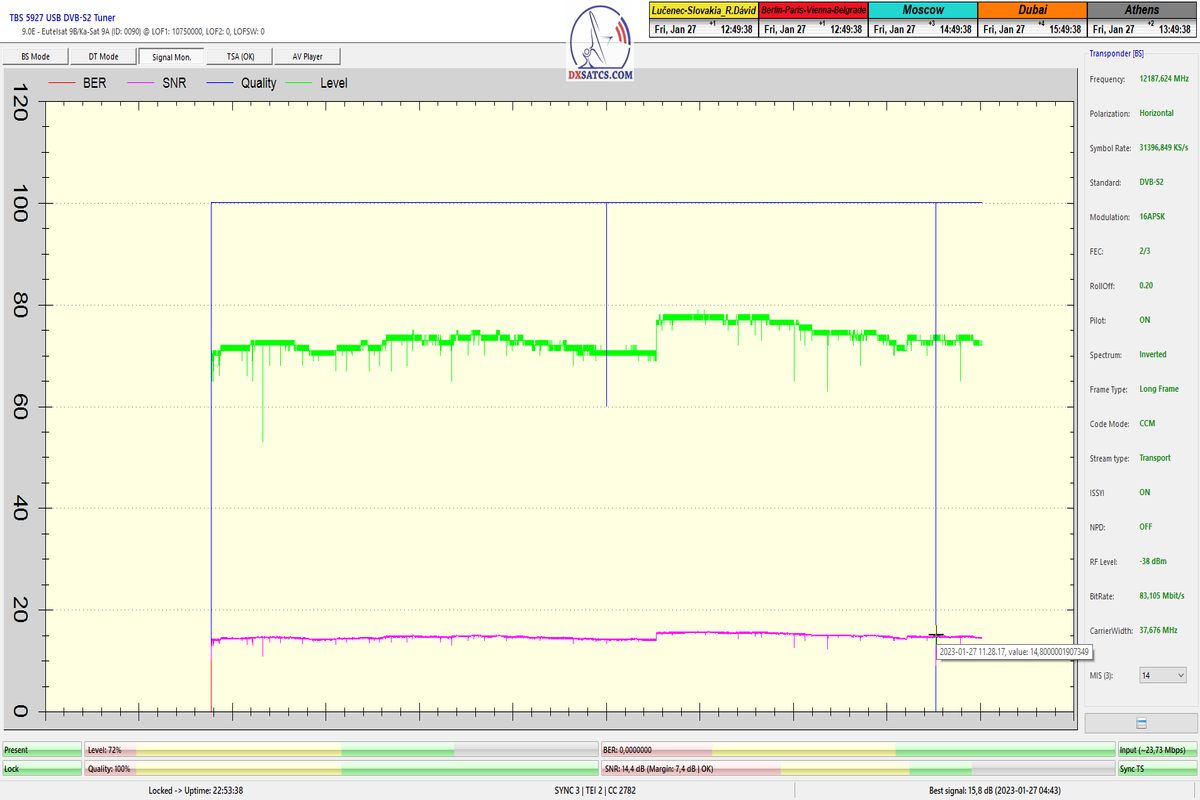 -okamžitá kvalita: SNR=15,7 dB - -obsadenie TS / MIS 14 - -poveternostné podmienky-