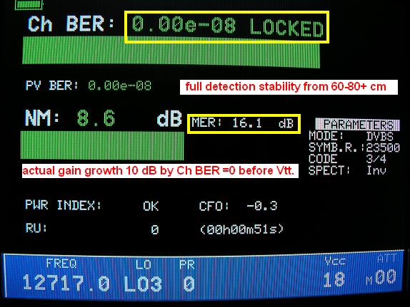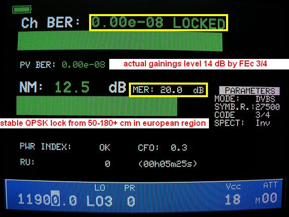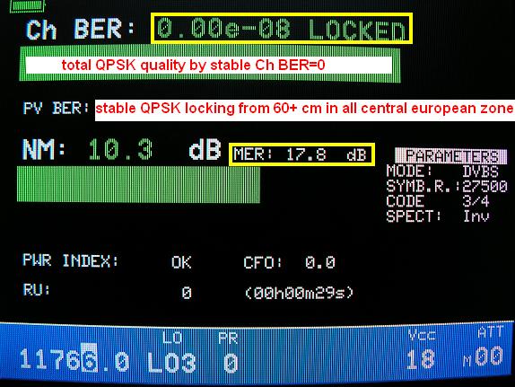 -vzorový priebeh QPSK detekcie s výrazným ziskovým prírastkom viac ako 11 dB čistej rezervy nad hladinou detekčnej nestability pri MER=6 dB môžem , nakoľko RX zostava sa nachádza v zóne špičky EIRP toku okolo 51 dBW , zaradiť do kategórie - typický akostný priebeh - kde minimálny rozkmit Q/MER špičky pri okamžitej ziskovej hladine 10-15 dB môžeme úplne zanedbať a okamžitá chybovosť Ch BER je stabilne rovná nule už pri reflektorových diametroch 90-120 cm pri zanedbaní poveternostných zmien na prenosovej trase spôsobujúcich tlmenie.