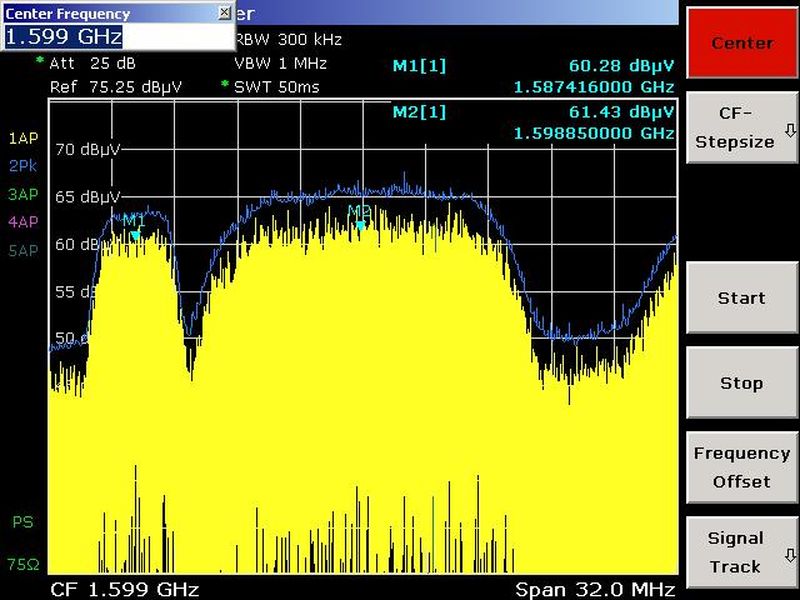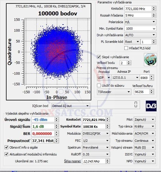 predstavoval len 1,2 MHz,nakoľko inštalovaná anténa Prodelin 3.7 m sa nachádzala priamo v smerovom vyžarovacom zväzku