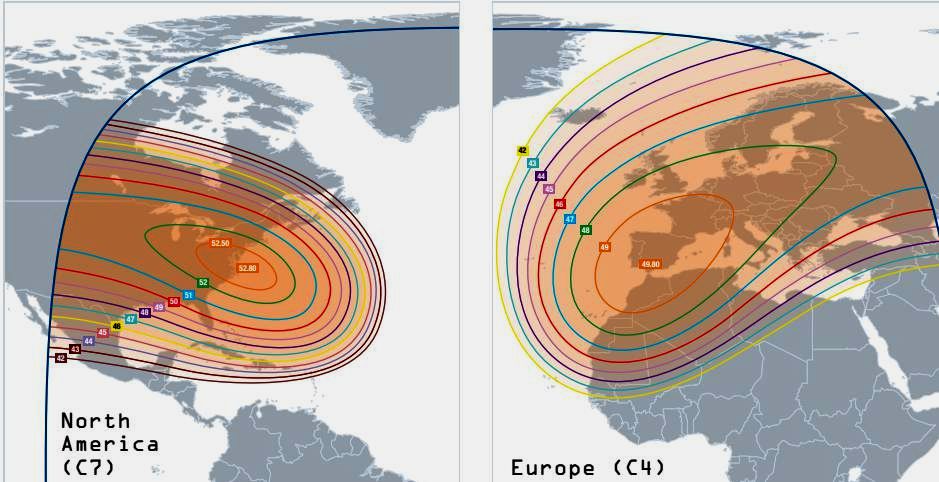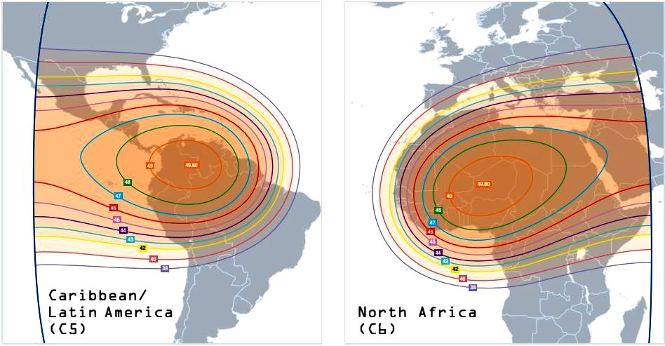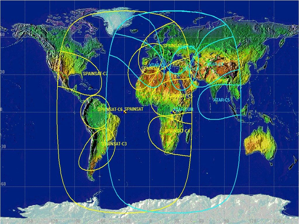 ►Spainsat-Xtar lant-30°W-X band footprint-beam-coverage : Global and Spot beams,geographical location of the measurement