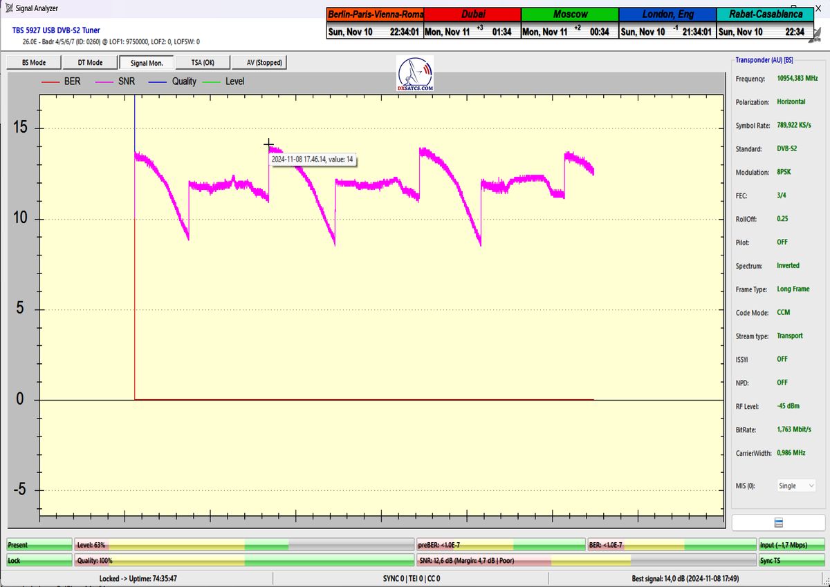 ►DETAILNÝ POHĽAD zameraný na kvalitu príjmu a okamžité zmeny odvodené od jednotky merania SNR v trvaní 74 hodín+